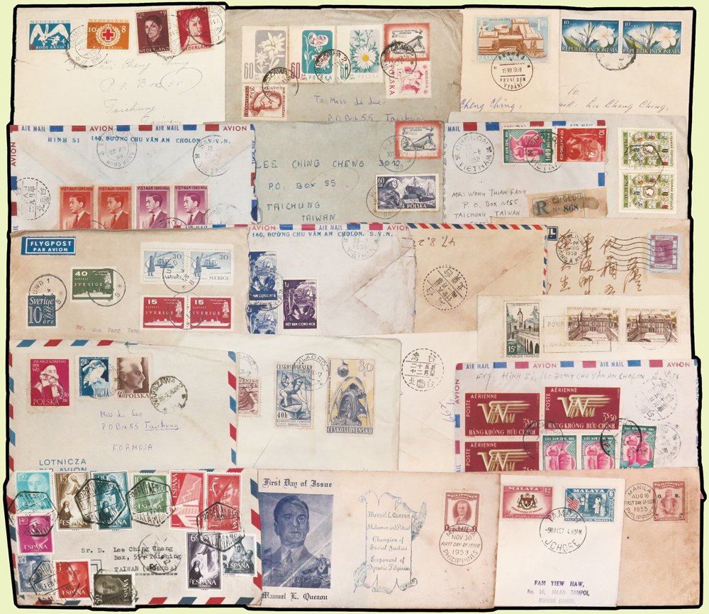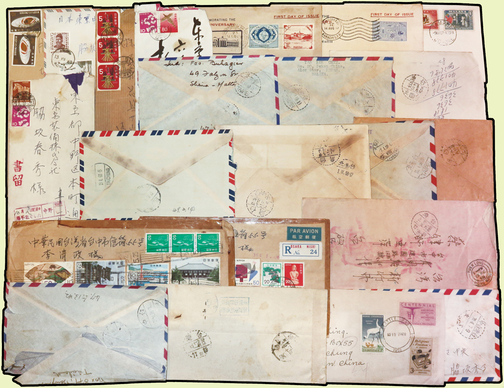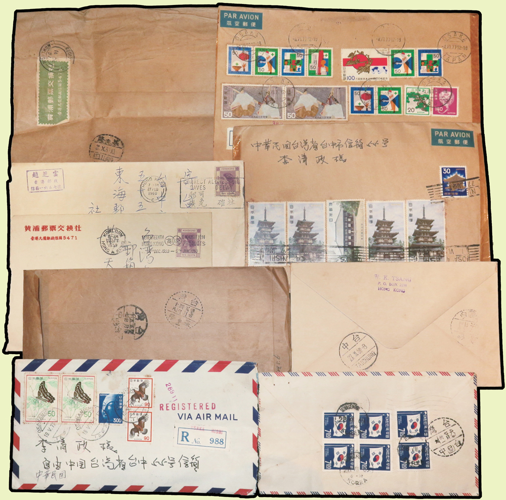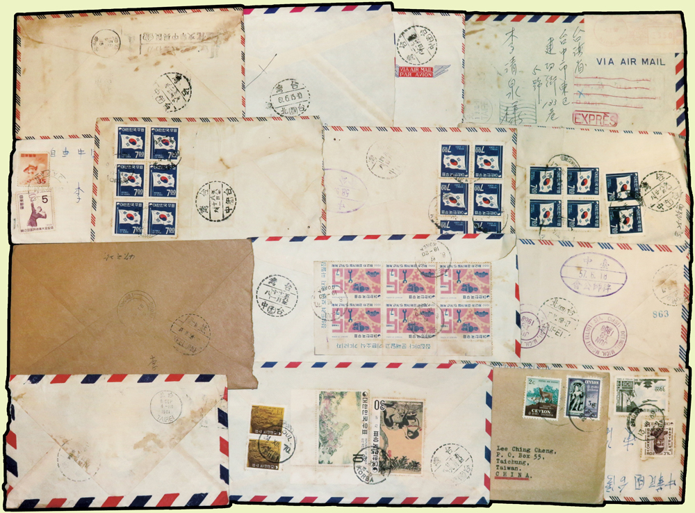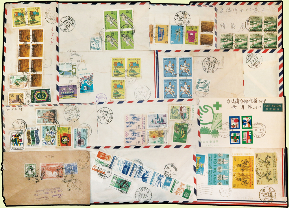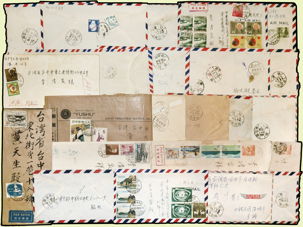 1956~1990年國外寄台灣航空或航掛自然封109封,實寄片5片,貼票精彩,見有台北(申五),台北(申27)台北(申33),台北(己),台北(己一),台北(己三),台北(己四),台北(H3),台北(H4),台北(辰一),台北(辰四),台北(辰27),台北(酉一),台北(酉六),台北(酉42),台北(寅八),台北(未32),台中(辛七),台中(午一),台中(午二),台中(午三),台中(子一),台中(子二),台中(子三),台中(未一),台中(未三),台中(己一),台中(己四),基隆(申一),新竹(卯一)檢查戳,寄件國有:日本.香港.捷克斯洛伐克.澳門.馬來亞.馬爾他.越南.法國.瑞典.波蘭.韓國.印尼.荷蘭.緬甸等,另日本國內實寄封4封,韓國寄日本1封,巴基斯坦.馬來亞等首日封6封;歡迎至官網瀏覽全貌(Page 54)