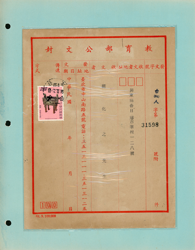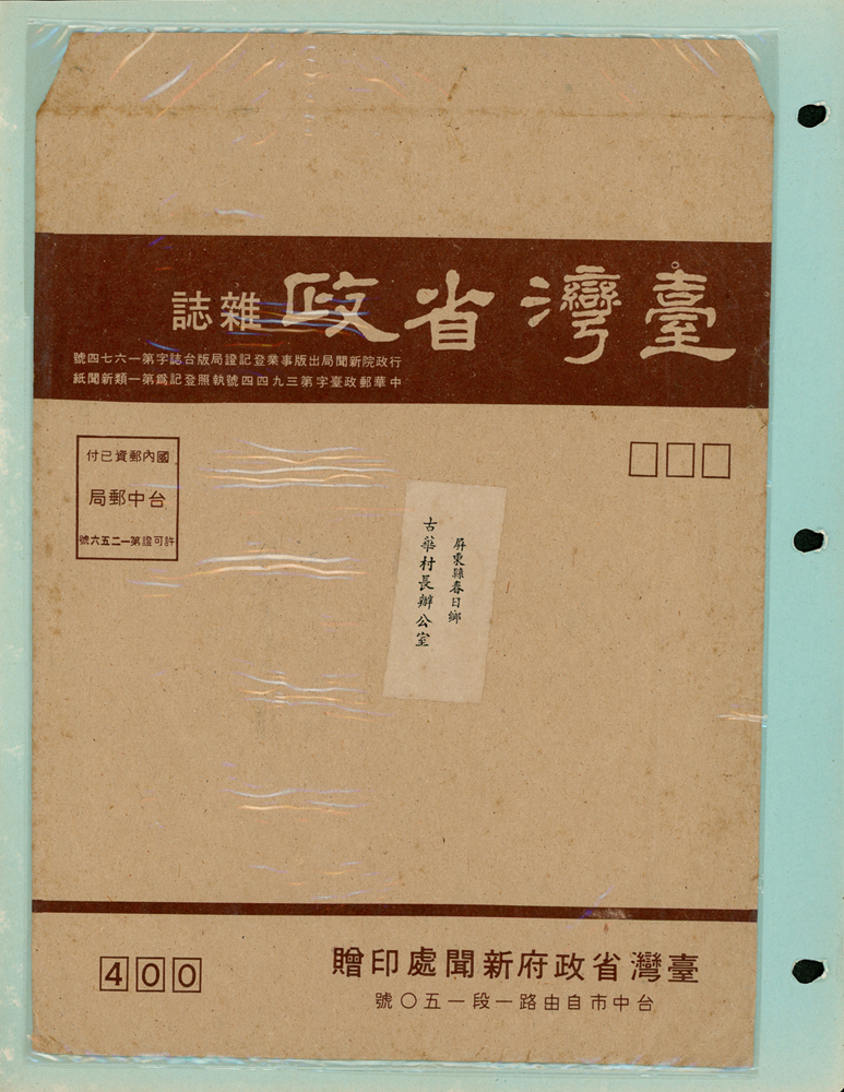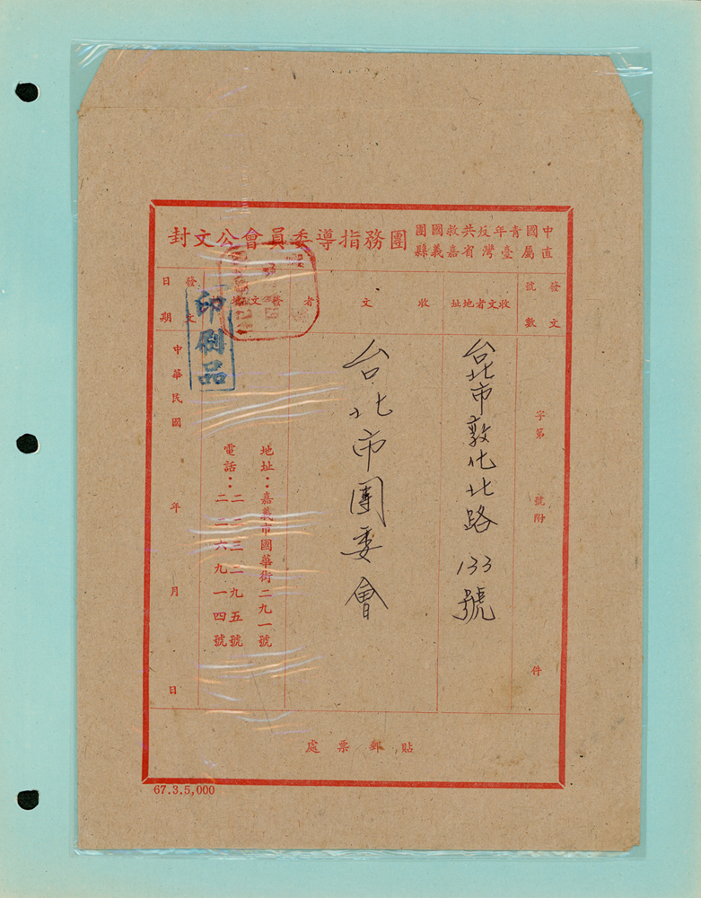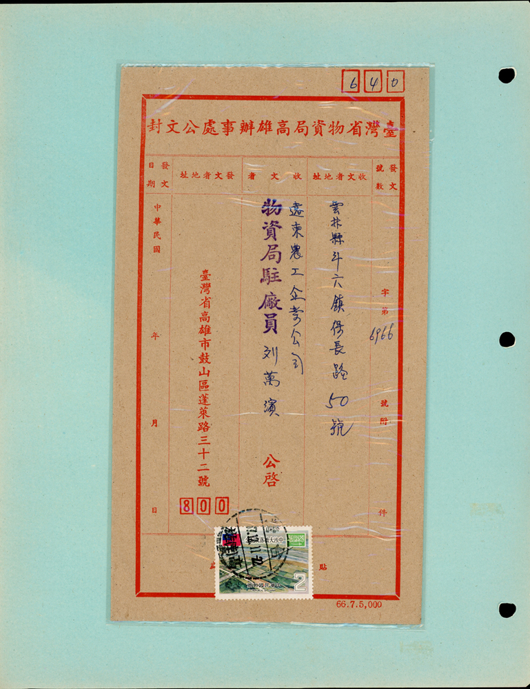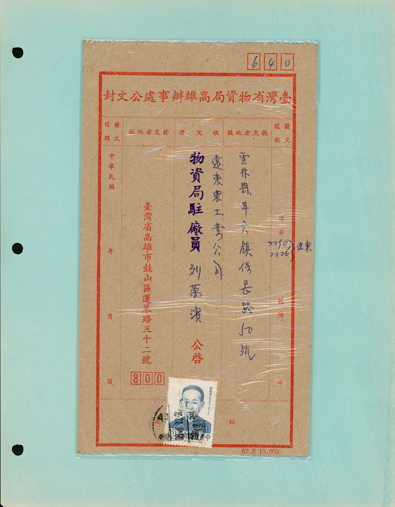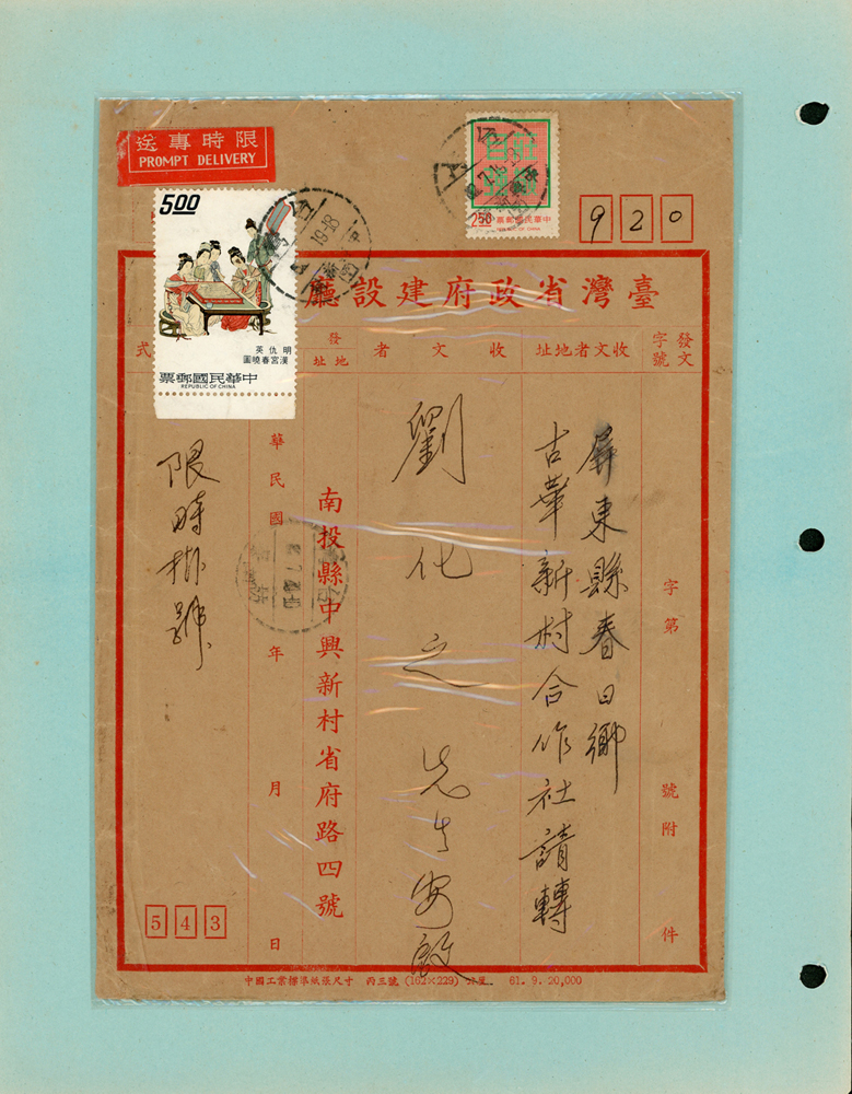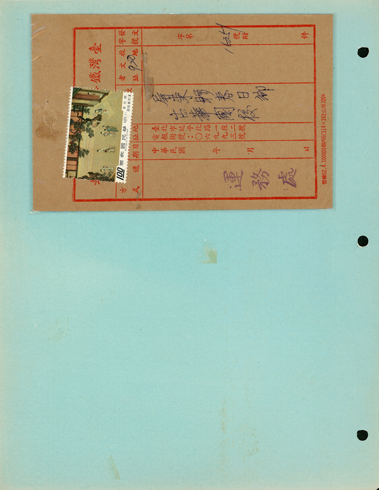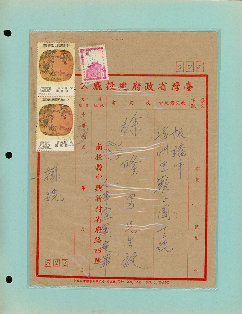 各式封.印刷品共二冊,包括:(1)各單位部門公文封及今日郵政月刊封共49封,其中45封為實寄,含:省政府.救國團.教育部.退輔會.景美國中等;(2)郵票發行中英文海報68張,包括有:十駿犬.食用菇類.春市圖.扇面古畫.古代錢幣.民間故事.古代銅器.體育.音樂.古代銅器.台灣鳥類.蔣夫人山水畫.國民健保.中國書法藝術.古代雕漆器.宋人嬰戲圖古畫等;總重約2.5公斤,歡迎至官網瀏覽全貌;林茂興舊藏