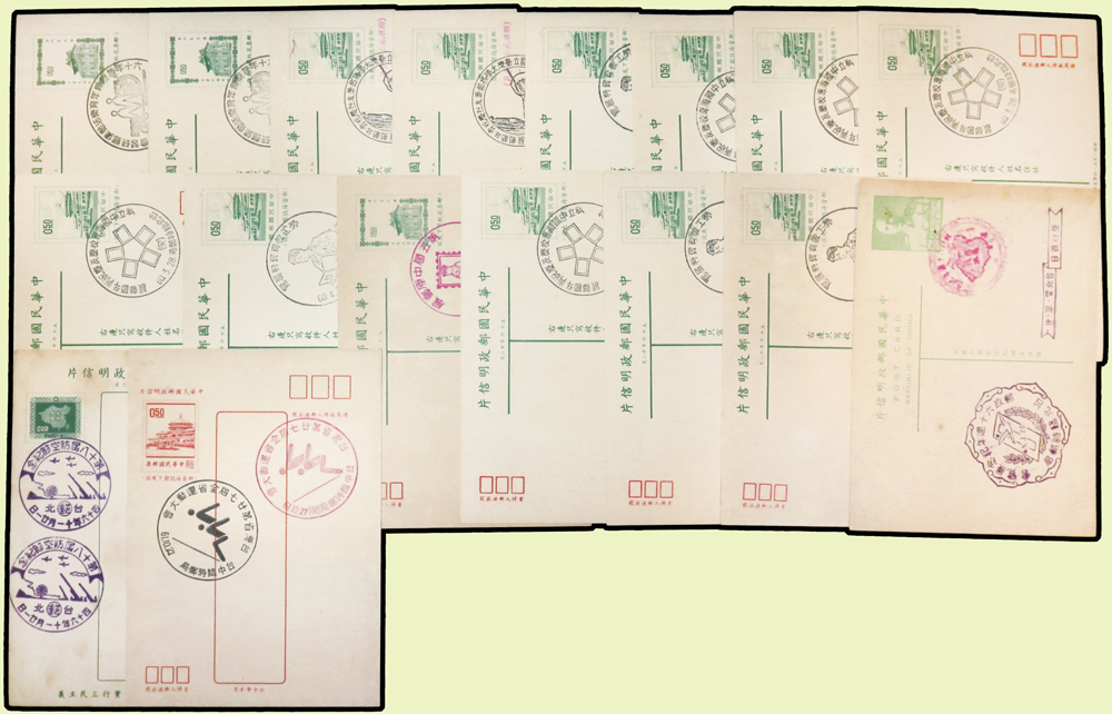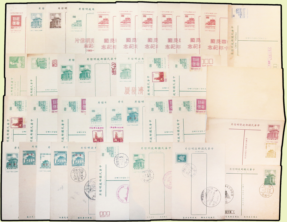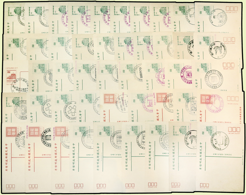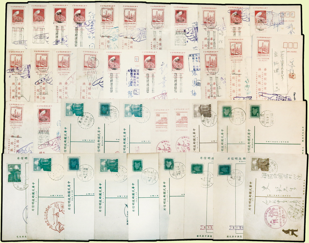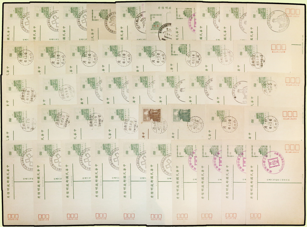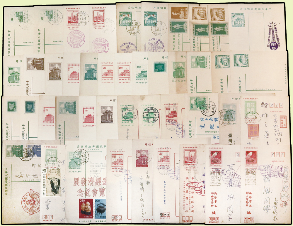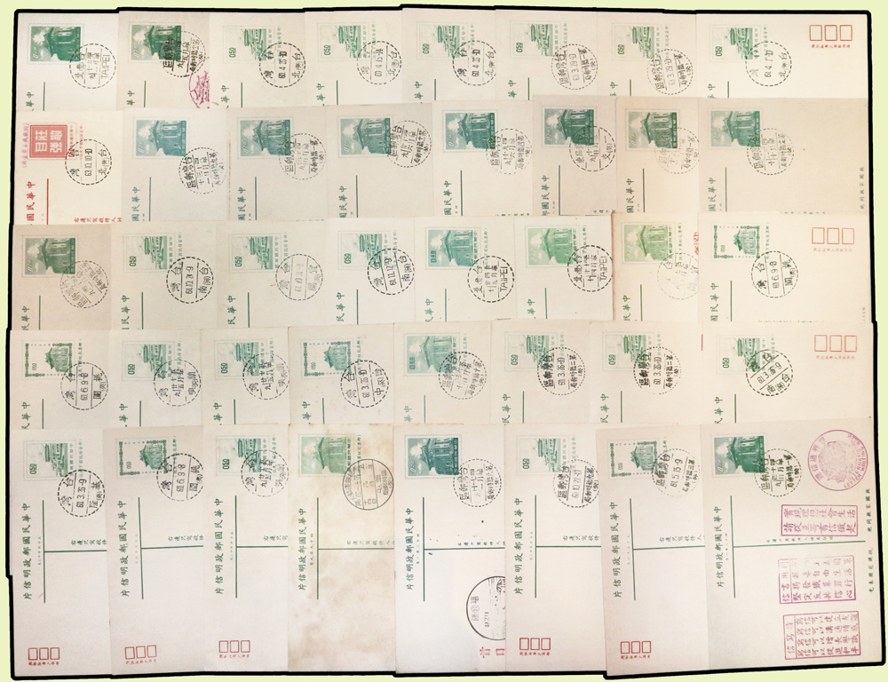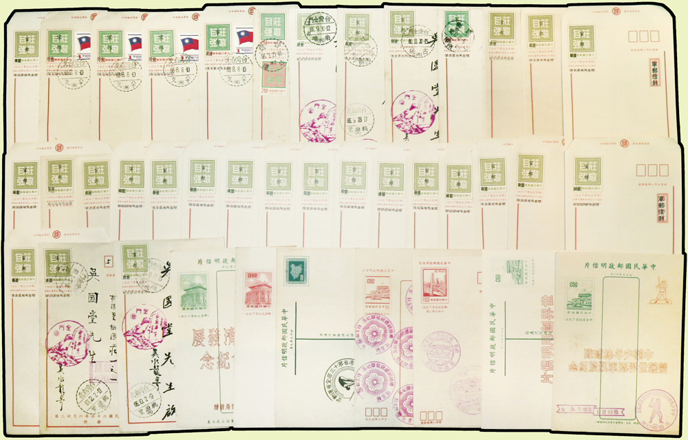 台灣封片240件:(1)各版莒光樓.中山樓.莊敬自強.九建等郵資片207片,含銷癸戳或紀戳164片,實寄38片,銷好戳11片,分銷:新竹青草湖(代).基隆三亭.桃園一亭.新店烏來(代).台北二亭.竹山溪頭(代).大溪慈湖(代).軍郵二所,少數重複;另未使用單片59片(少數空白處銷紀戳);(2)莊敬自強郵資封33封(32封為軍郵封),含:22封全新未使用,6封實寄銷好戳,分銷:金門南塘(代).金門黃厝(代).金門古坑(代).金門尚義(代).金門二代.軍郵四所;林茂興舊藏