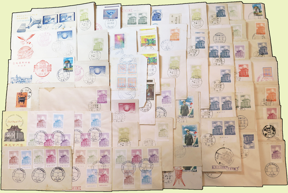 台灣各式封片753件:(1)中早期未使用首日封213封,包括有:臺灣省橫貫路通車.招商局八十五週年.世界童子軍五十週年.農業普查.世界通信週.亞洋郵盟十周年.集郵.亞洋郵盟執行委員會一九七一年年會.體育(61年版).台灣昆蟲.清瓷.廣播事業三十週年等,多重複;(2)各時期低值封,含白封.私封.寶郵封等,共335封,包括有:臺灣省橫貫公路開工週年.莊敬自強.保衛金馬.世界通信週.各版莒光樓(佔50%).國立臺灣科學館等,部分實寄;(3)標準信封貼莒光樓.地圖低值票銷紀戳或日戳35封;(4)外展封:1973年美國聖若望大學中山堂落成2封,1974年邁阿密郵展2封,1976年美國中華集郵會加州區郵展30封,均貼票銷首日戳;(5)台中市律師公會私片136片,均貼九建1元票1枚,未使用