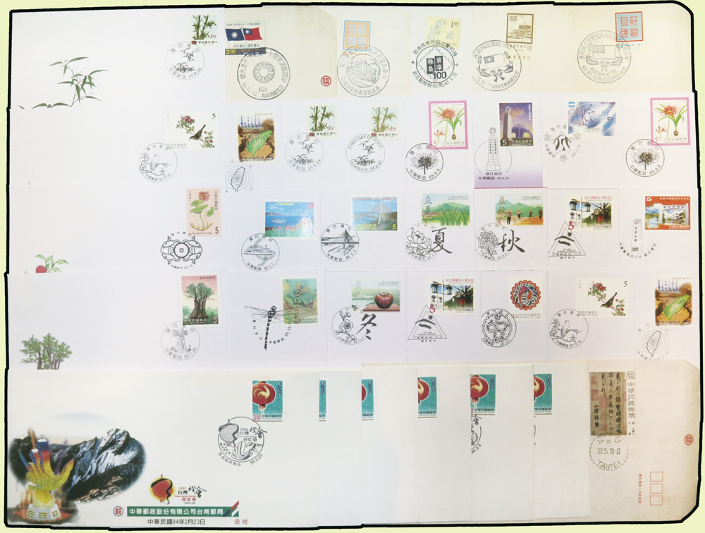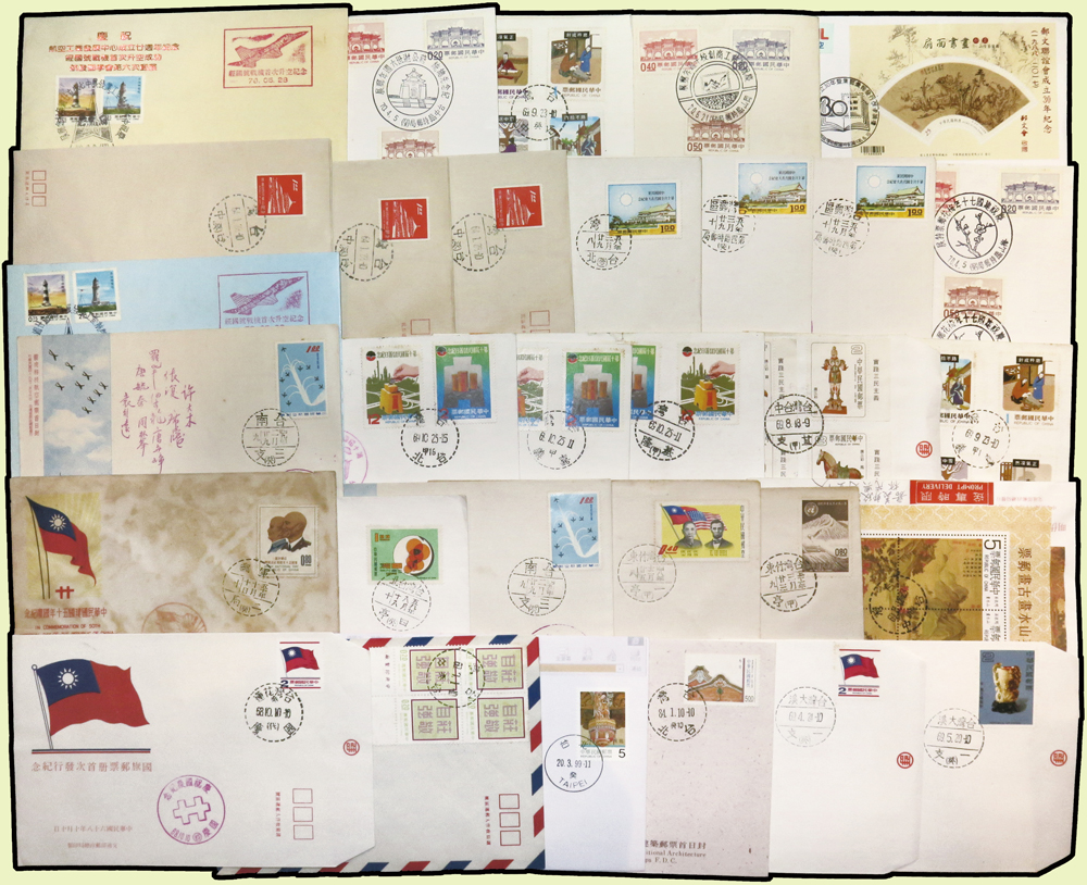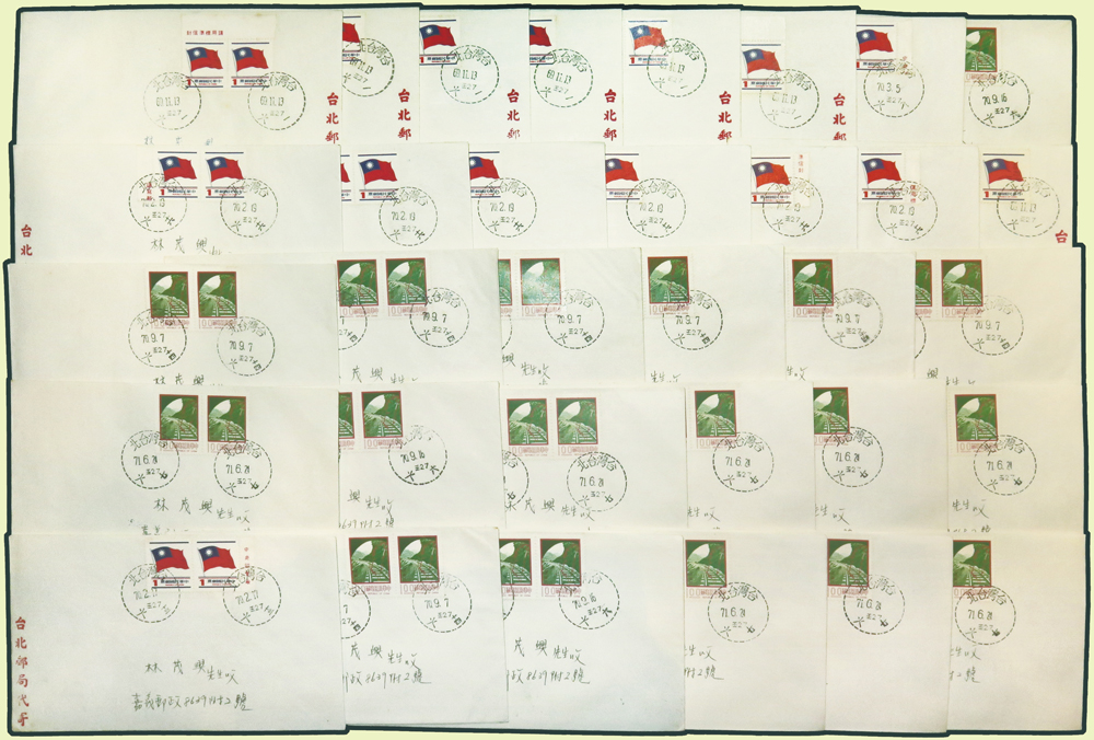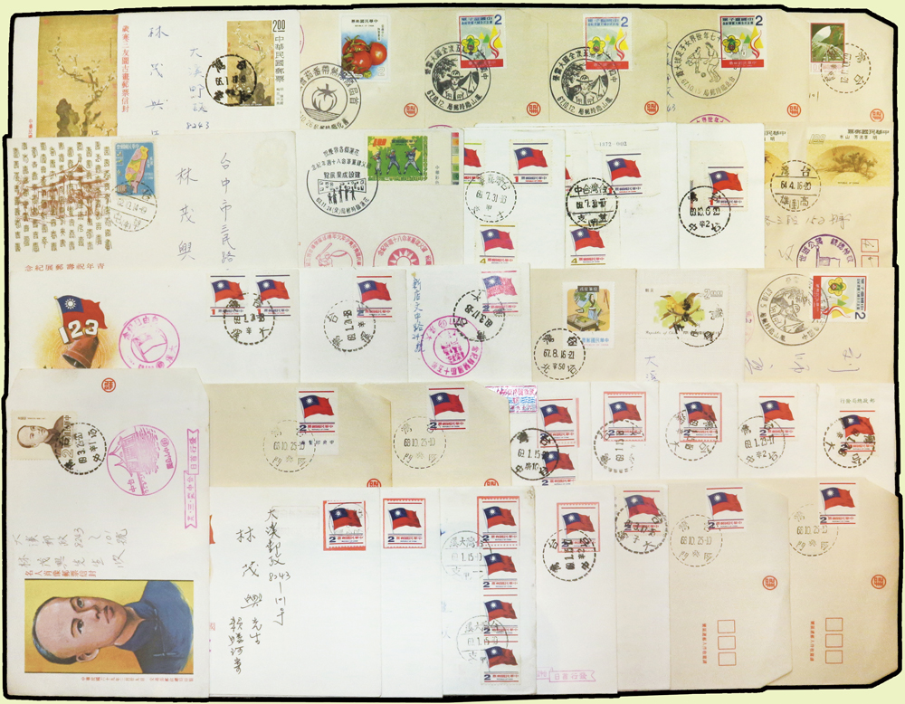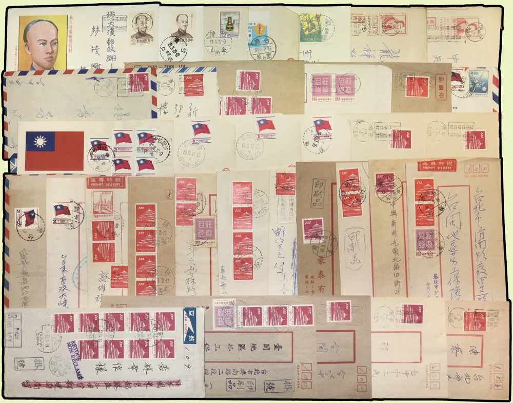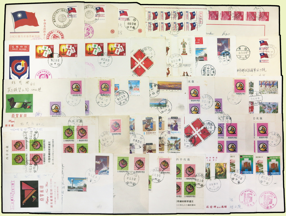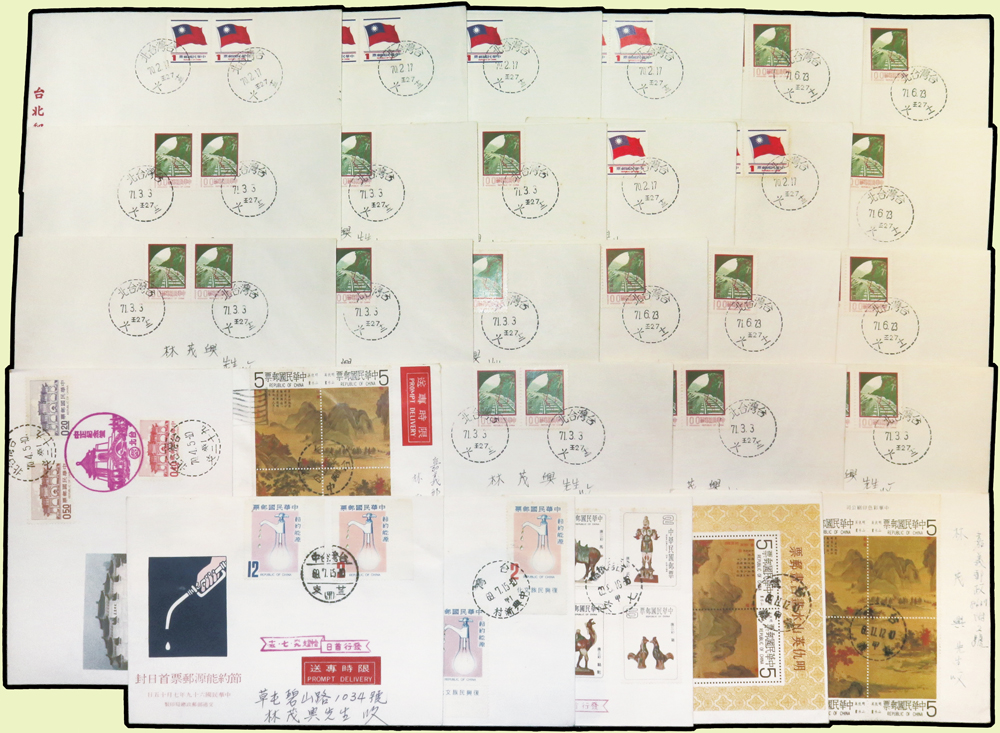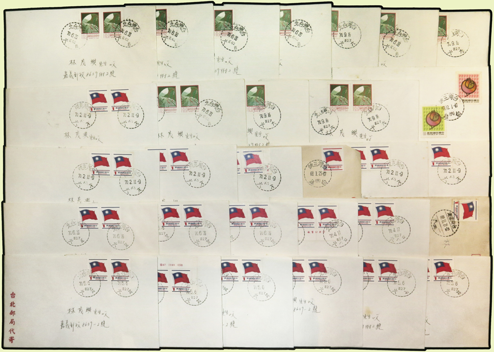 台灣1961~2021年各式封497件:(1)套票首日封61封(48封實寄),含:唐三彩.二輪雞.狗小全張.氣象衛星資料接收站落成.錄音郵件.春書.台灣山水.兒童畫(70年版).中國民間故事(69年版).第十屆國民儲蓄日.明仇英山水及其小全張.節約能源等,多重複,少數銷:三峽白雞(代).嘉義下寮村(代).竹東一亭;(2)銷紀戳或癸戳低值封169封,少數銷:花蓮大禹嶺(代).花蓮國慶(代).軍郵二局.台北四亭,部分重複;(3)實寄封267封,半數為白封貼九建或國旗票集郵品,多數銷:三峽雞白(代).澎湖一汽.台北一火~台北十七火.台北廿五火~台北廿七火.基隆廿火.基隆十九火.花蓮十八火等,多重複;總重約2公斤;歡迎至官網瀏覽全貌;林茂興舊藏