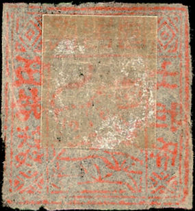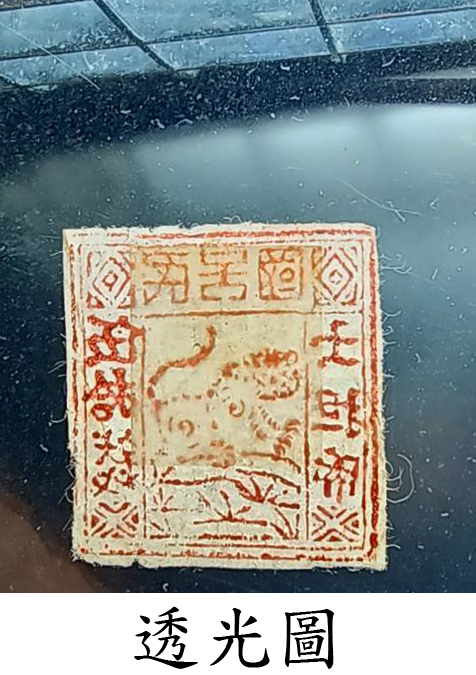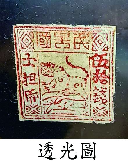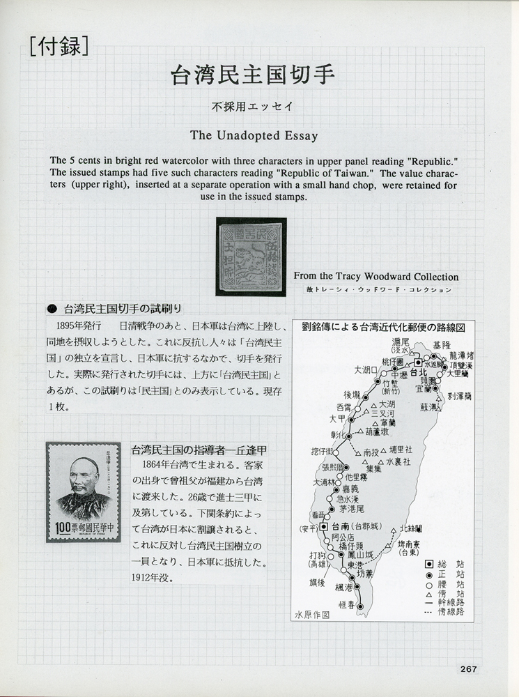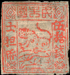 1895年台灣民主國伍拾錢,無齒試蓋票,未採用,紀錄中存世二枚,其中一枚曾出現在1965年11月9日ROBSON LOWE LTD拍賣中第465項,此枚為日本水原明窗舊藏 源流:水原明窗,華郵集錦7,清末民初切手郵便(上),第267頁原件,1992年日本郵趣出版 文獻紀錄:鄭賢明,2018,〈台灣民主國郵票–奇珍逸品〉,《2018年度郵學演講集27》;台北,頁89-98(Page 56)