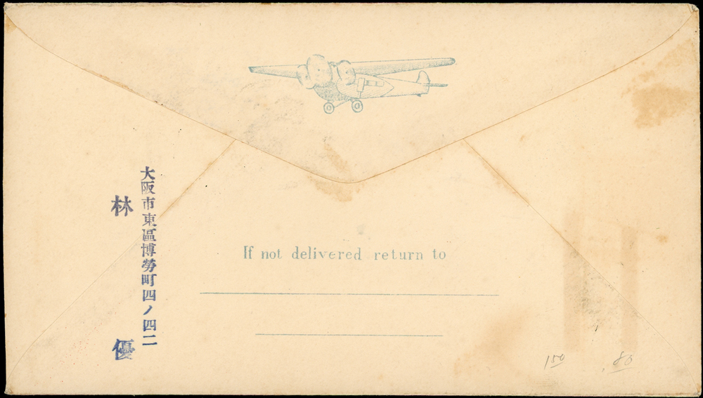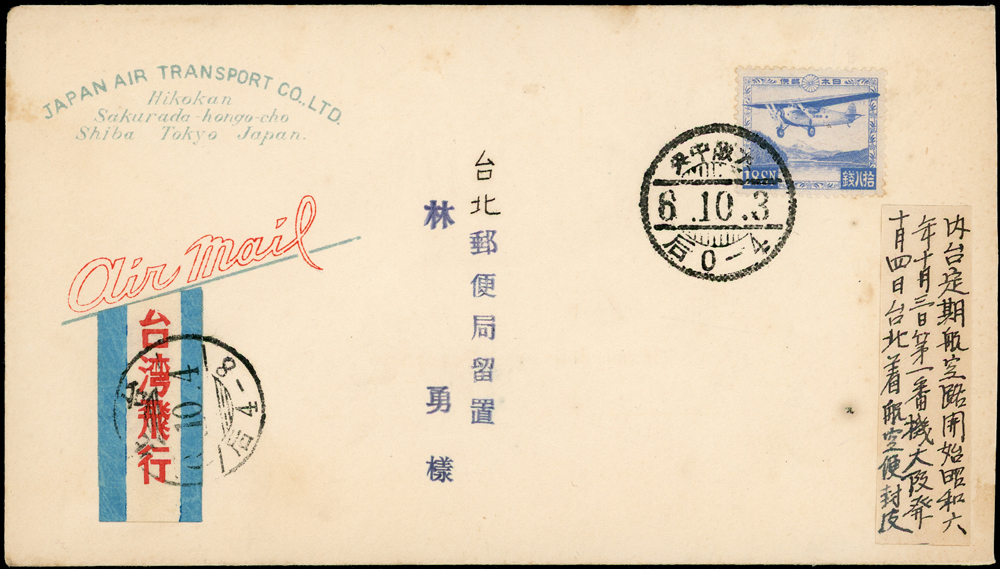 內台間航空郵便試驗飛行首航封:1931年日本-台北首航封,貼蘆之湖航空18錢1枚(平信3錢+航空15錢),銷大阪中央6.10.3櫛型戳,旁銷台北6.10.4到達戳 註:本封由日本大阪(昭和6.10.3)航寄福岡,10月4日搭乘『雲雀號』飛機6時3分起飛,途經那霸,下午3時17分降落台北馬場町(今南機場)(Page 59)