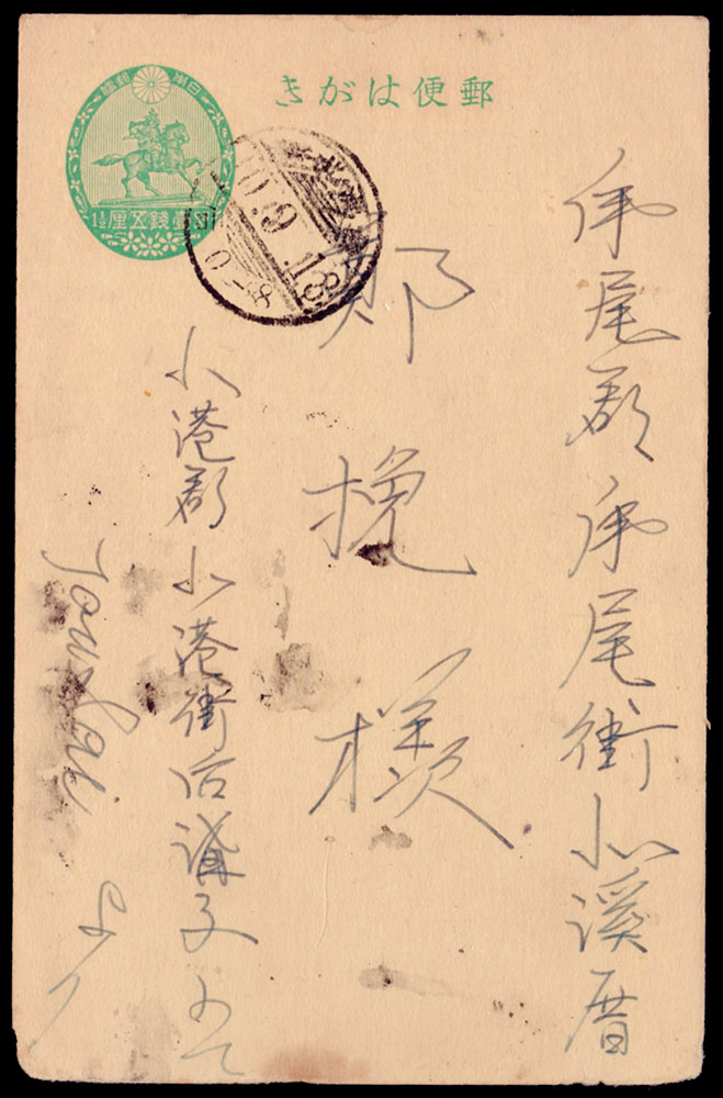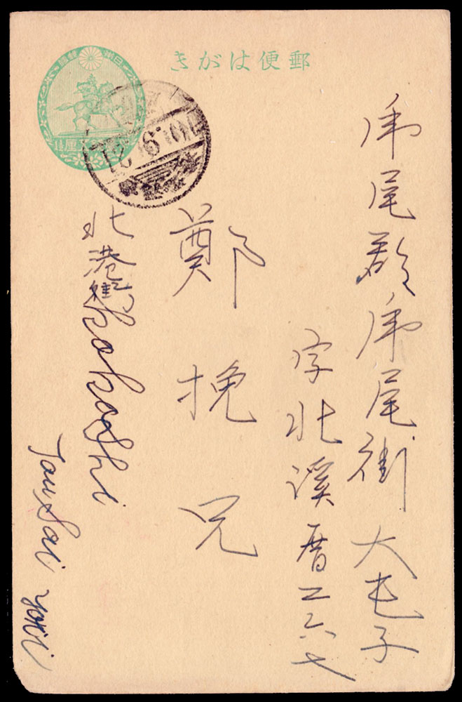 楠公1.5錢實寄片3片:(1)1935年北港郡寄虎尾郡1.5錢郵資片,銷台灣北港10.9.18櫛型戳;(2)1935年北港郡寄虎尾郡1.5錢郵資片,銷台灣北港10.9.21櫛型戳;(3)1935年麻薯寮寄虎尾郡1.5錢郵資片,銷台灣xx10.7.28櫛型戳