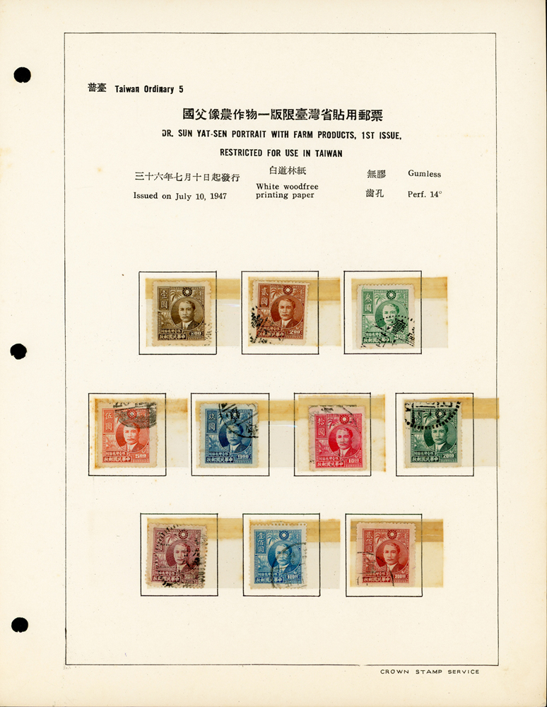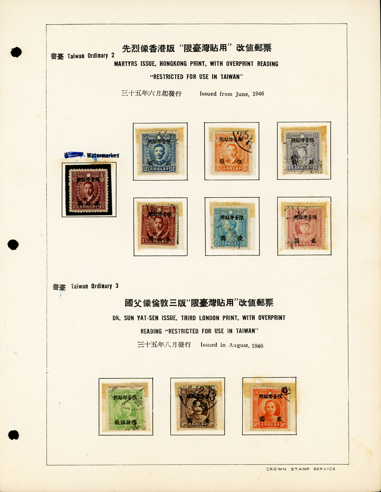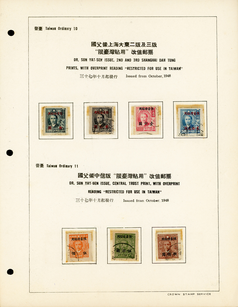 台灣老台幣時期舊票常台1~常台12,共12套,均整理於定位卡上,其中普台7及普台10關鍵票真品,另附普台13限臺灣貼用單位郵票-國內信函舊票1枚,先烈像香港版限臺灣貼用改值30錢新票1枚,F-VF(Page 61)