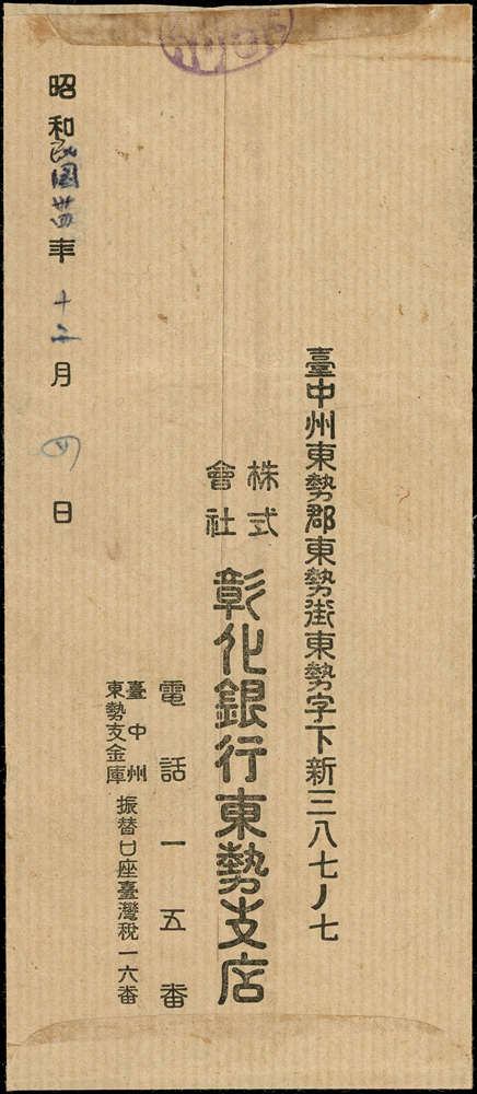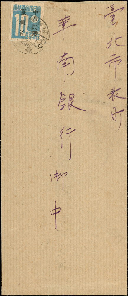 老台幣第1期平信郵資封(34.11.4-35.5.31):1945年台中寄台北封,貼日郵數字10錢1枚,銷台中州/東勢/34.12.4櫛型戳;日據時期的『州、廳』戳,於民國35年1月中旬停用(Page 62)