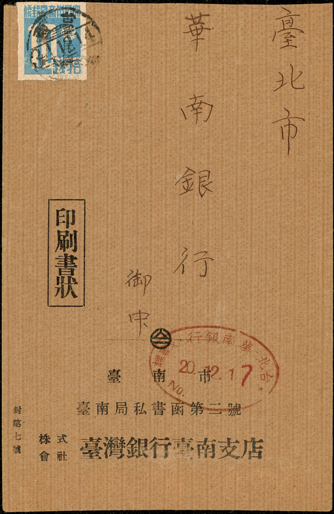 老台幣第1期印刷品郵資封(34.11.4-35.5.31):1945年台南寄台北封,貼日郵數字10錢1枚,銷台南州/台南/34.12.14櫛型戳,台北華南銀行紅色收件章;日據時期的『州、廳』戳,於民國35年1月中旬停用(Page 62)