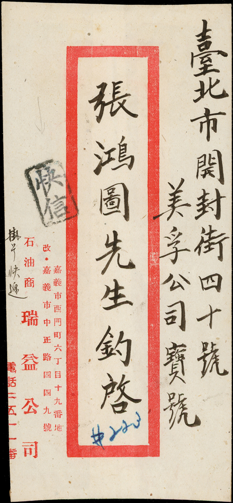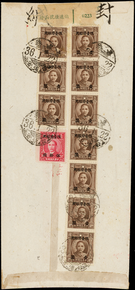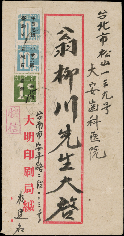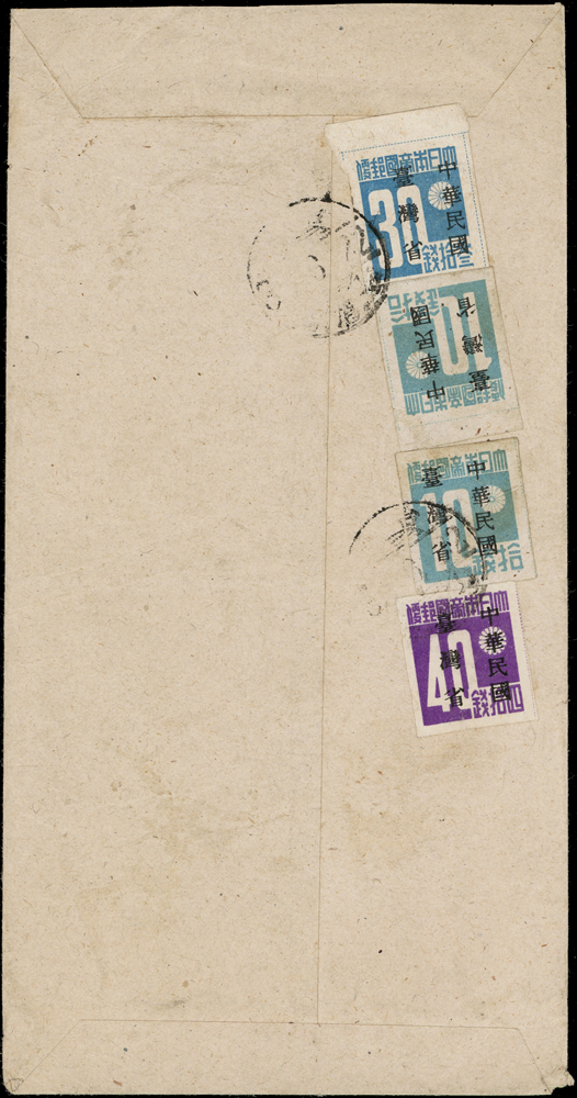 老台幣第2期快信郵資(35.6.1-35.10.31)及第3期快信郵資(35.11.1-36.6.30)各一件:(1)1946年台南寄台北快信封,正背面貼日郵數字7枚計郵資2.1元,銷台南35.6.22櫛型戳;(2)1947年嘉義寄台北快信封,背貼11枚計郵資10.5元,銷嘉義36.1.22櫛型戳(Page 64)