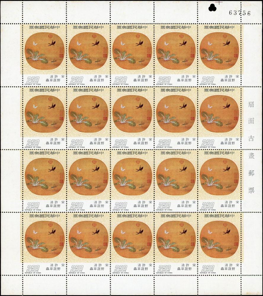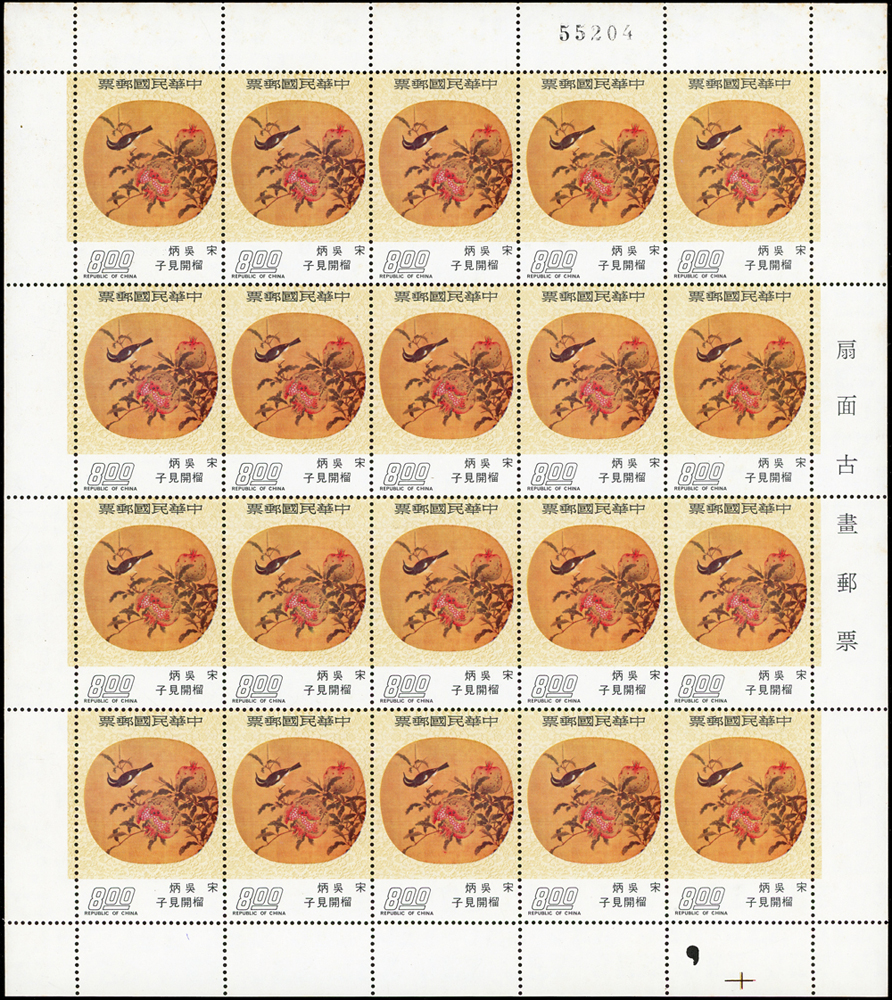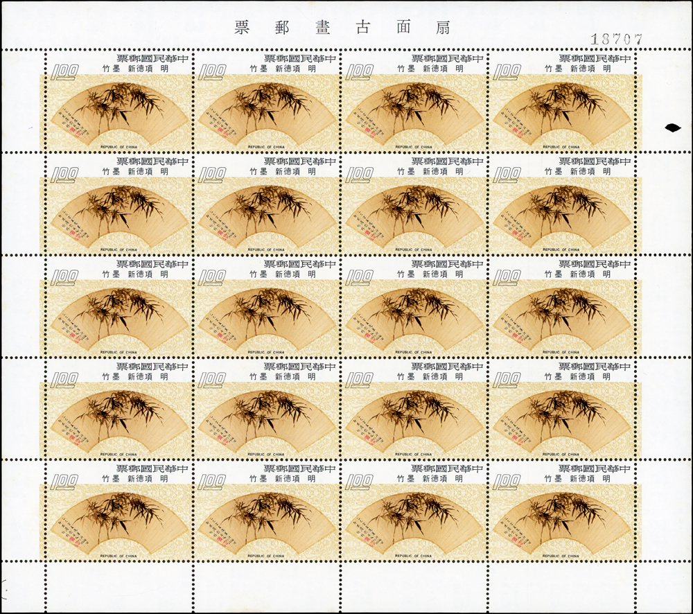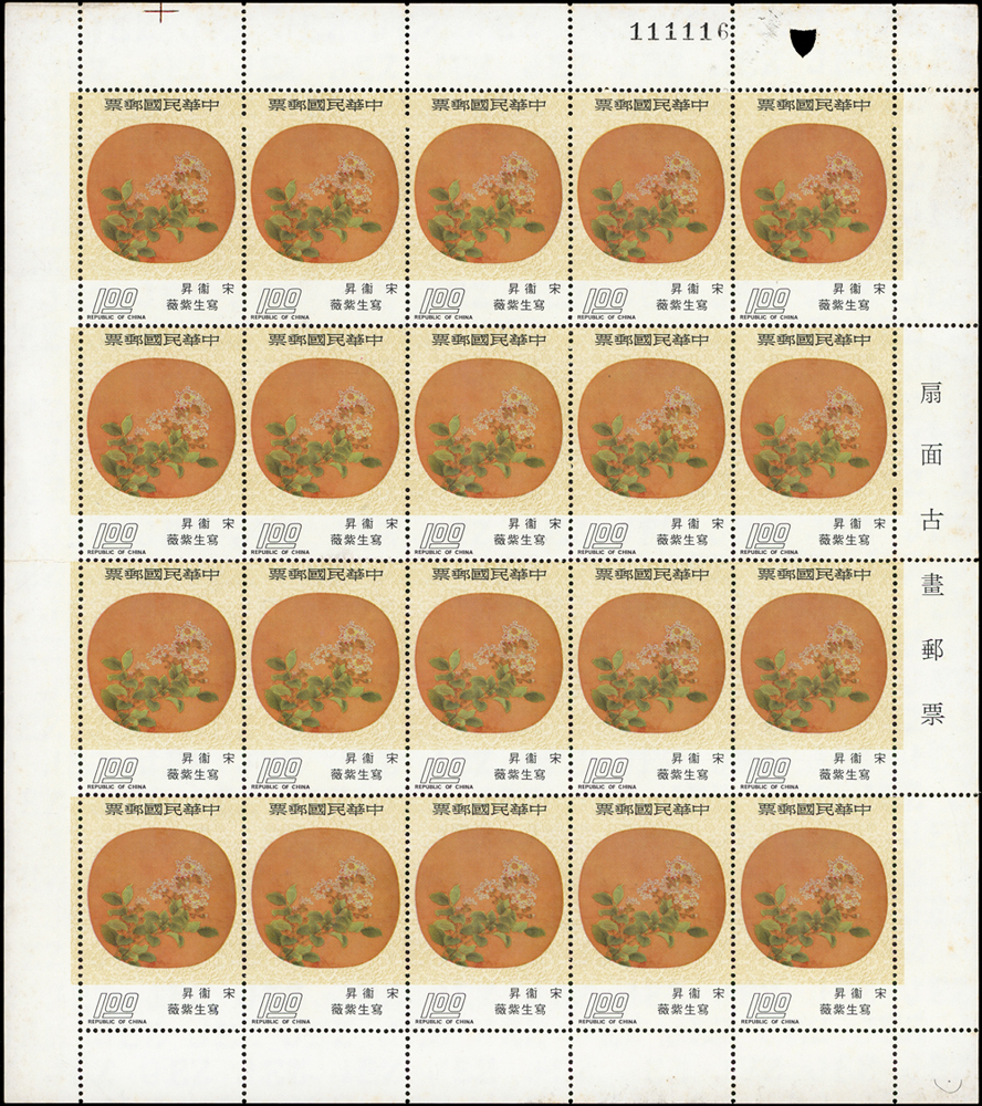 扇面古畫郵票二版,均原膠,包括:(1)專95.摺扇(62年版)4全1版20套,挺版,8元及1元背面各1個淡斑點,VF-F;(2)專104.紈扇(63年版)4全1版20套,折版,右上角多道壓痕損票1枚,正背面均有些許淡黃點或齒緣淡黃,F-VF(Page 89)