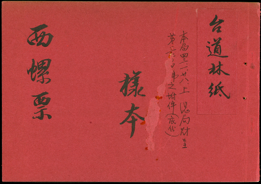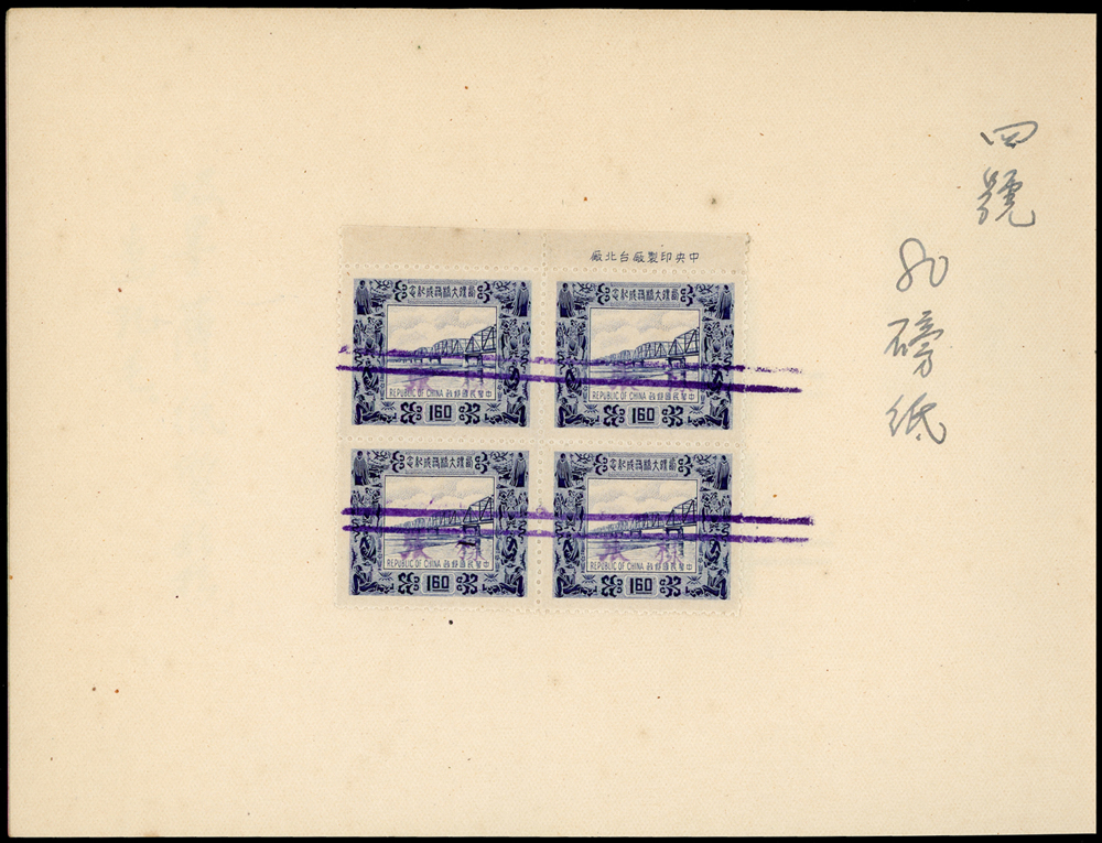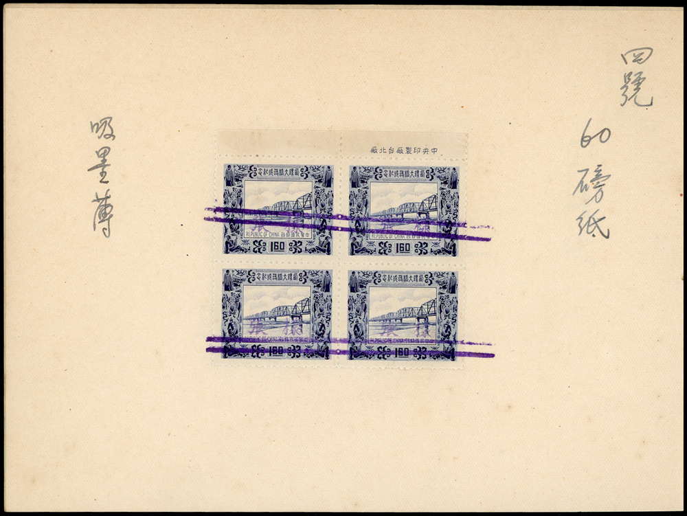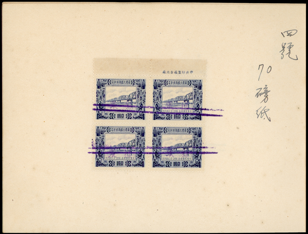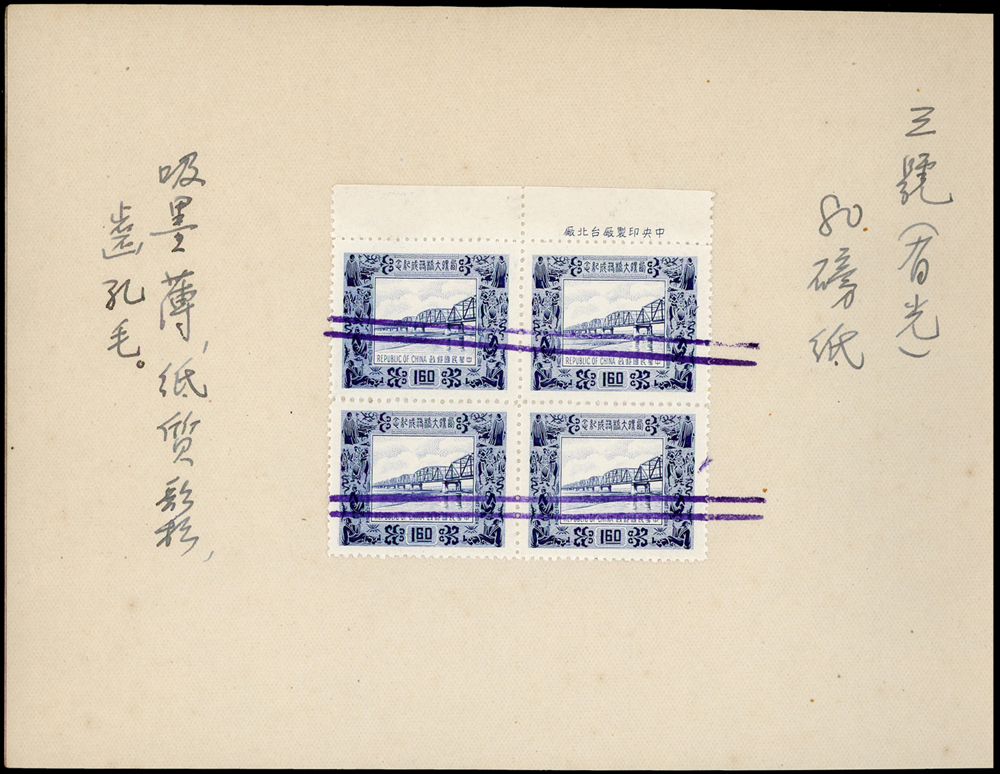 紀38.西螺大橋台道林紙檔案樣本一冊,內貼1.6元方連帶上廠銘試印票4件,均以雙藍線劃銷,分別採用紙為:(1)四號60磅紙;(2)四號70磅紙;(3)四號80磅紙;(4)三號(有光)80磅紙(Page 103)