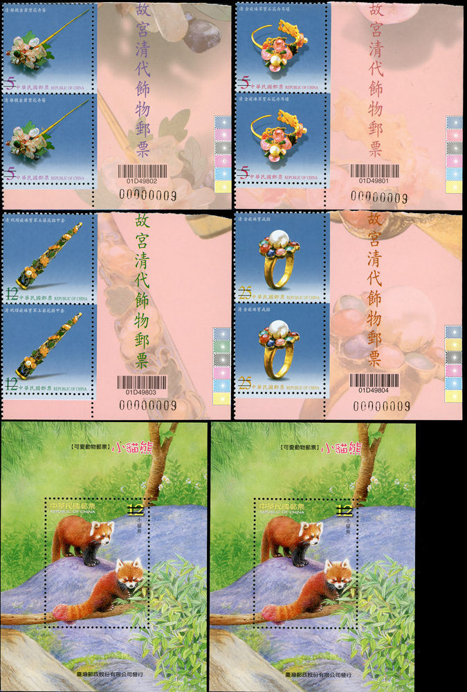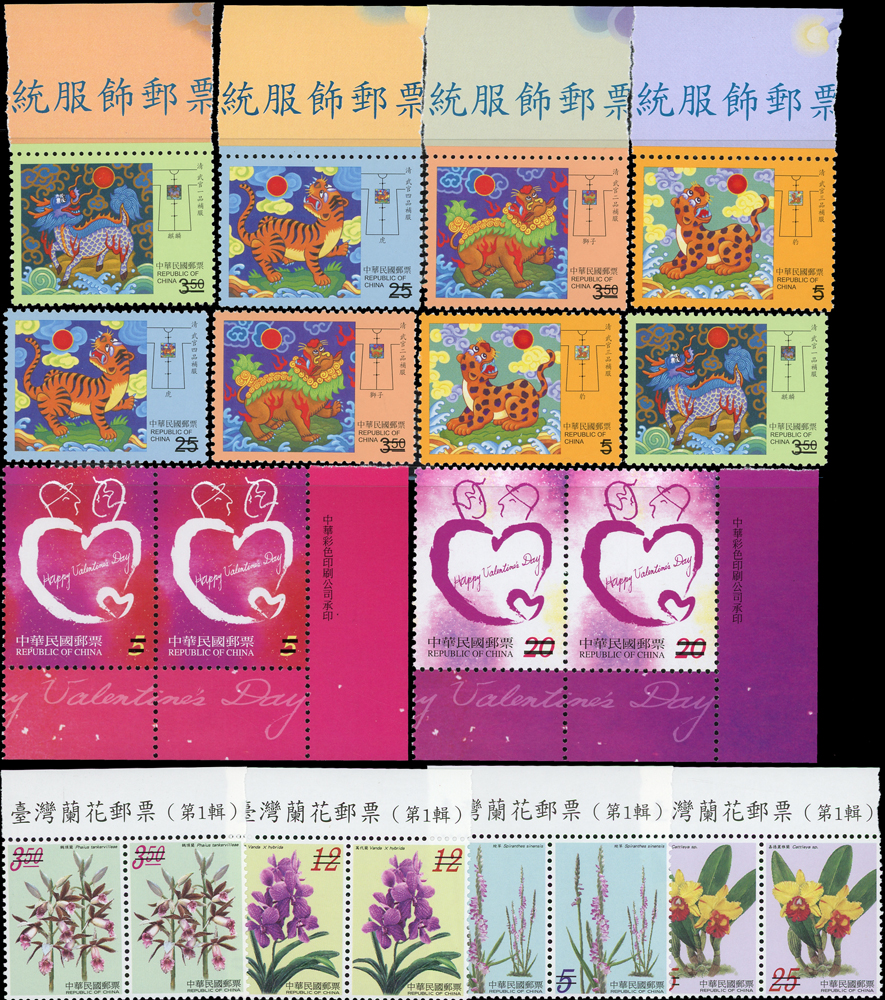 民國96年樣票雙連一組,含:常126-1.台灣蘭花(第一輯)4全橫雙連,特498.故宮清代飾物4全直雙連,特499.情人節2全衡雙連,特500.中華傳統服飾4全2套,特501.小熊貓4全雙連,特502.台灣橋樑第一輯4全直雙連,特501.小熊貓小全張2枚,VF(Page 105)