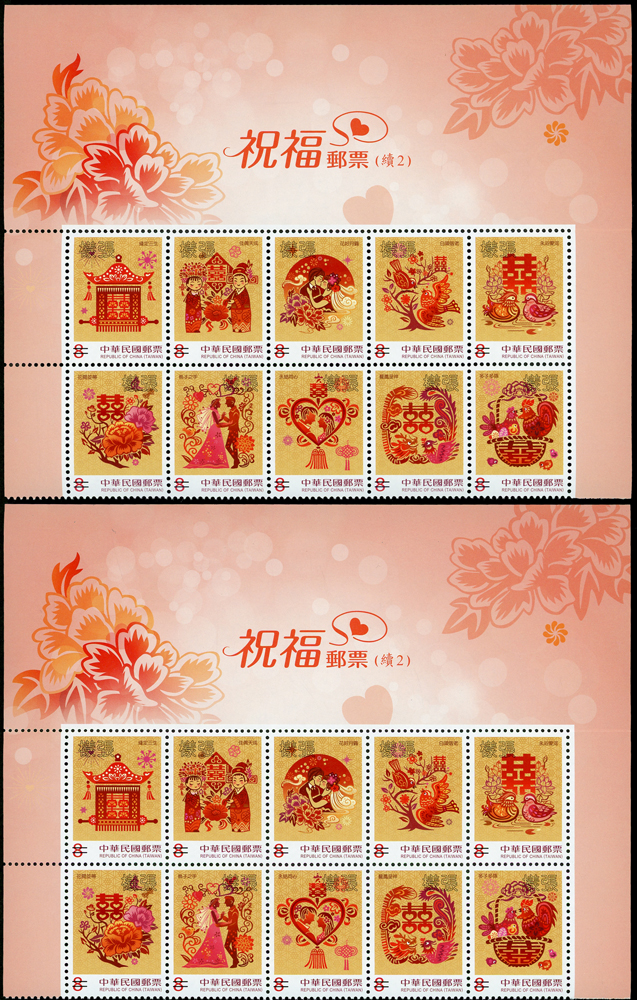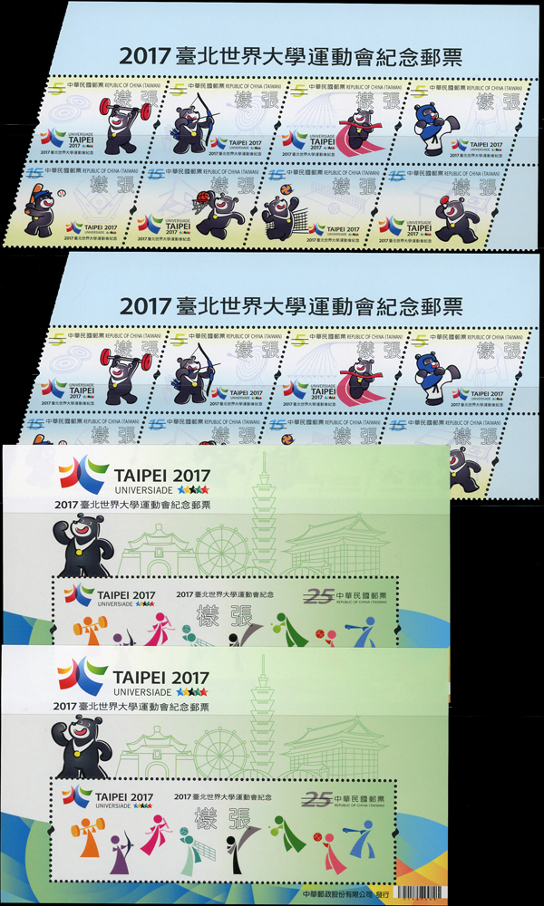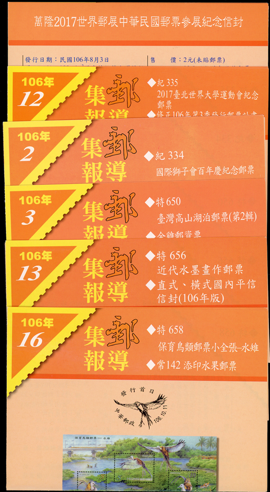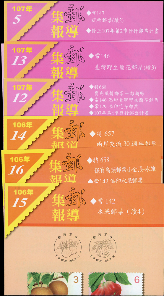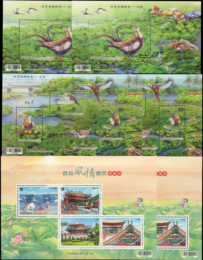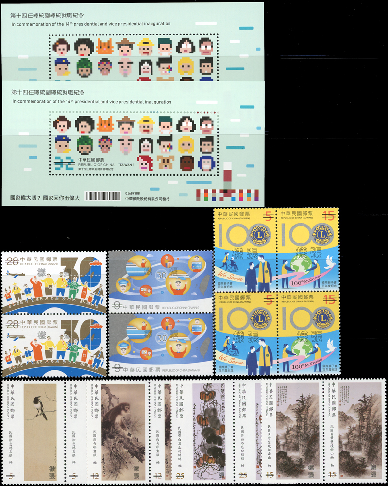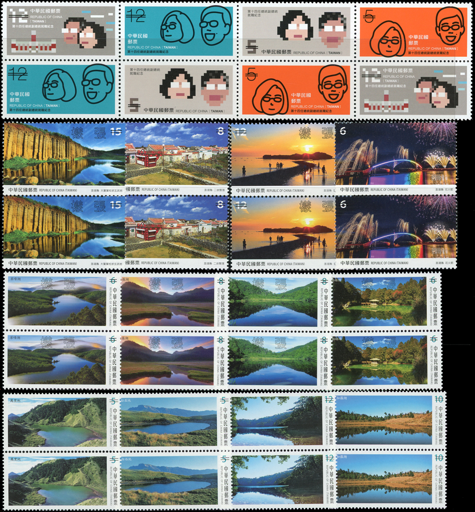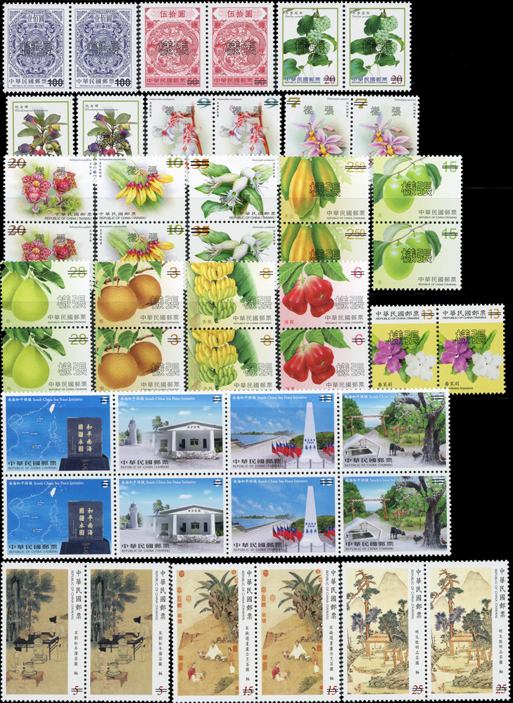 民國105年,106年,107年樣票一組,含:(1)105年:特637.故宮古畫(105年版)3全橫雙連,特638.南海和平倡議4全直雙連,紀332.第14任總統就職4全直雙連及小全張2枚,常143.四版夔龍圖1全橫雙連;(2)106年:常139.添印龍鳳呈祥1全橫雙連,常136-3.添印漿果郵票第三輯20元橫雙連,特651.寶島風情小全張2枚,特650.台灣高山湖泊4全直雙連,紀334.國際獅子會百年慶2全橫雙連,常136.添印漿果郵票2.5元2枚,紀335.2017年台北世運會4全直雙連,特656.近代水墨畫作4全橫雙連,特657.兩岸交流30周年2全直雙連,特658.保育鳥類-水蛭小全張2全各2枚,常142.水果郵票(續4)4全直雙連,常142.添印水果郵票2.5元及15元直雙連,常129.添印花卉郵票13元橫雙連;(3)107年:常146-1.添印台灣野生蘭花35元直雙連,常146.台灣野生蘭花(續3)4全雙連,常147.祝福郵票(續2)20全直雙連,特661.台灣高山湖泊4全直雙連,特668.寶島風情-澎湖縣4全直雙連,VF(Page 106)