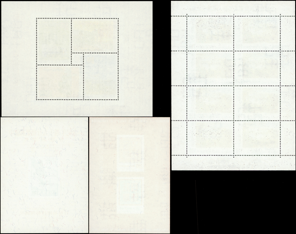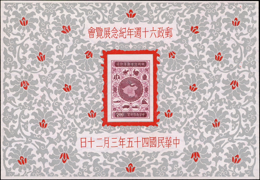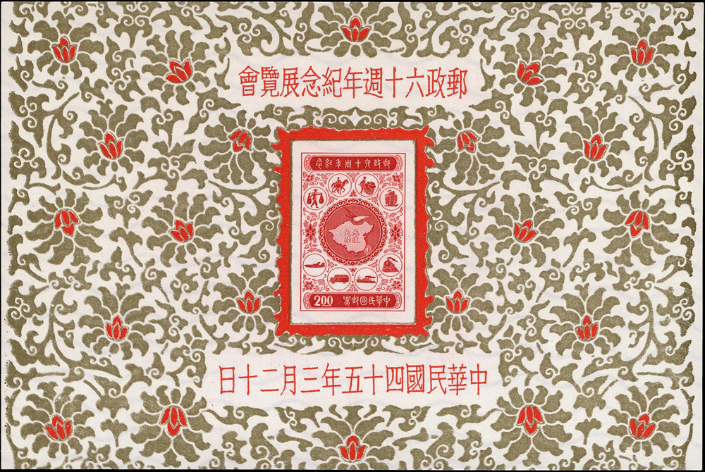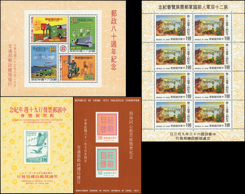 台灣小全張7枚,包括:駿馬圖(軟印痕).郵政80週年.四海同心.第二十屆軍人節國軍郵票展覽會(背微沾墨點).中國郵票發行九十週年郵票展覽會.郵政60週年紀念展覽會金.銀小全張2枚全(金色上下裁短10*14.9cm),品像混合,無黃斑,VF-F;歡迎至官網瀏覽全貌(Page 110)