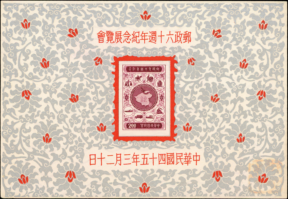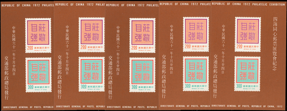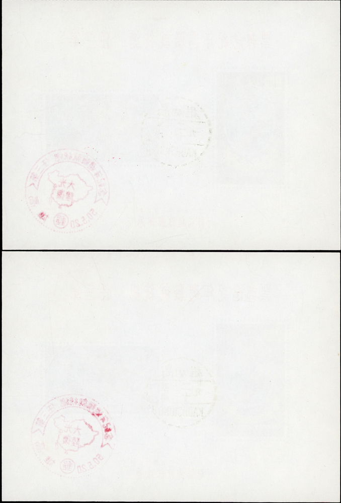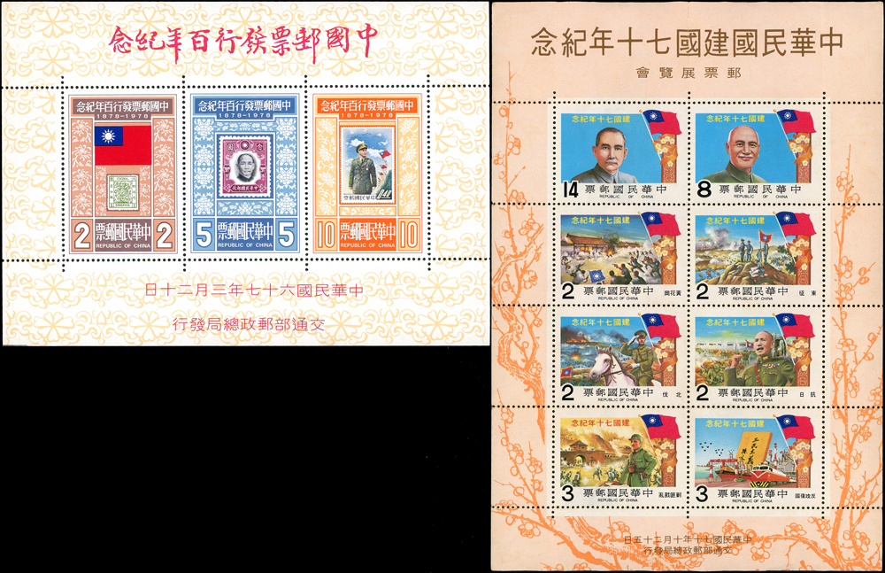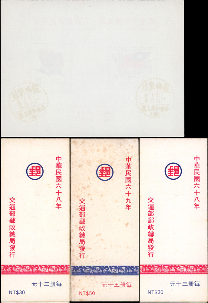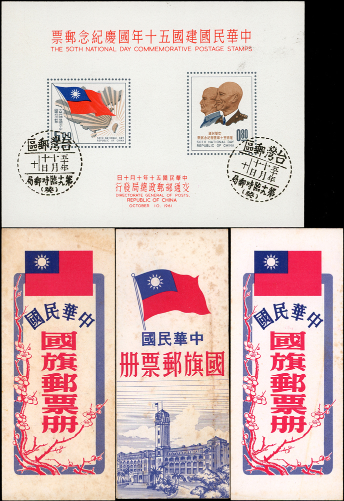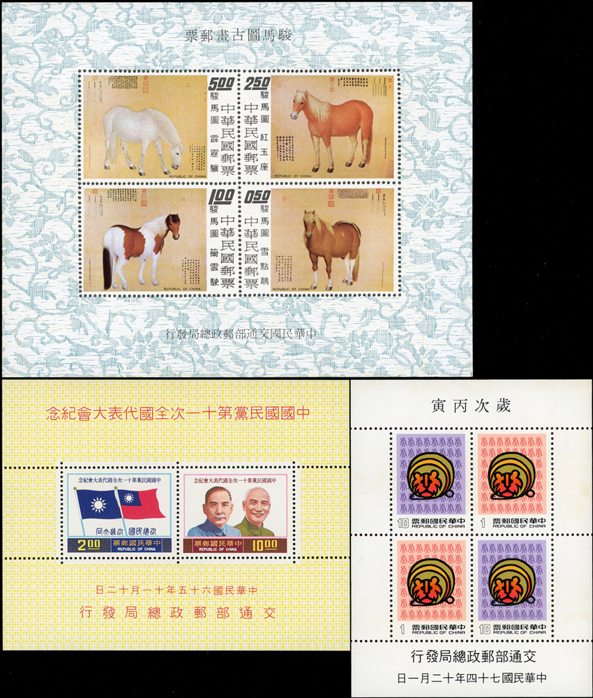 台灣郵品:(1)紀47.郵政60週年紀念展覽會金.銀小全張2枚全,右下角壓痕,正背面均蓋收藏章,金色左下邊損,F;(2)駿馬圖古畫小全張1枚,原膠局部淡黃,VF-F;(3)未銷戳小全張:四海同心5枚,中國國民黨第11次全國代表大會1枚,中國郵票發行百年紀念1枚,第二十屆軍人節國軍郵票展覽會紀念2枚(其中1枚背黃),二輪虎1枚,中華民國建國七十年郵展紀念1枚(揭薄品次),F-VF;(4)第三任總統就職週年紀念小全張2枚,均銷高雄50.5.20首日戳及紀戳;中華民國建國五十年國慶紀念小全張1枚,銷台灣郵區臨局50.10.10首日戳,VF-F;(5)國旗郵票小冊3本,微汙黃,F-VF(Page 110)