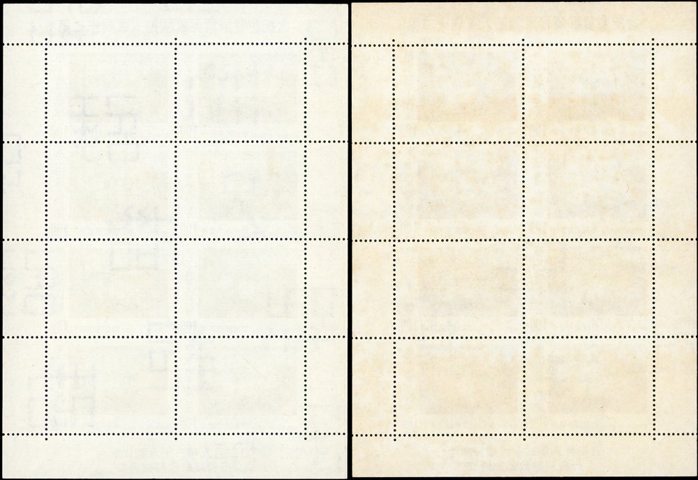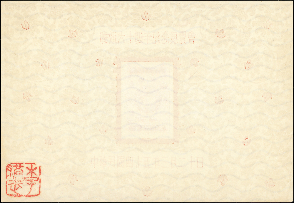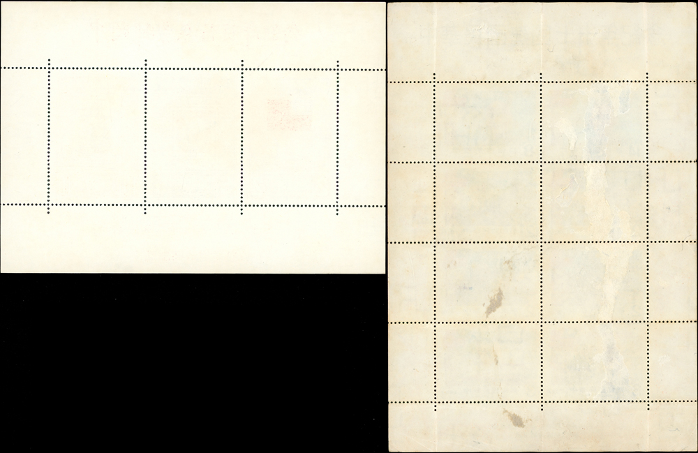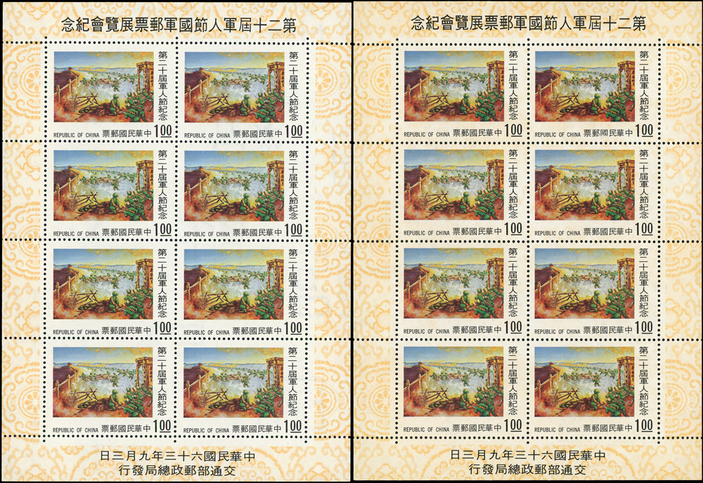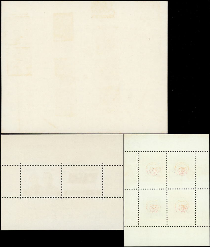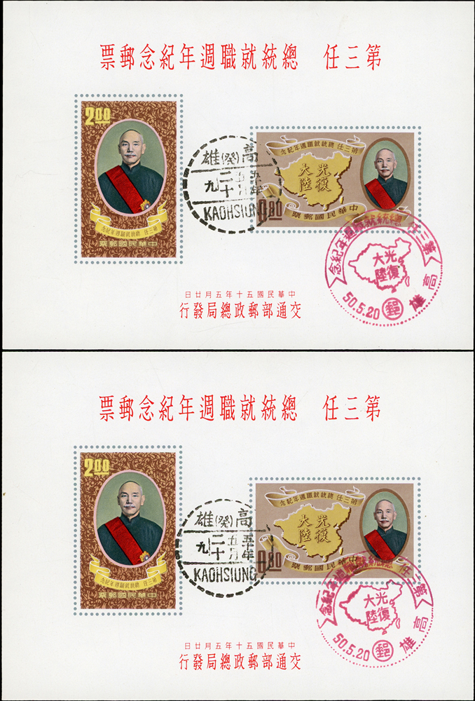 台灣郵品:(1)紀47.郵政60週年紀念展覽會金.銀小全張2枚全,右下角壓痕,正背面均蓋收藏章,金色左下邊損,F;(2)駿馬圖古畫小全張1枚,原膠局部淡黃,VF-F;(3)未銷戳小全張:四海同心5枚,中國國民黨第11次全國代表大會1枚,中國郵票發行百年紀念1枚,第二十屆軍人節國軍郵票展覽會紀念2枚(其中1枚背黃),二輪虎1枚,中華民國建國七十年郵展紀念1枚(揭薄品次),F-VF;(4)第三任總統就職週年紀念小全張2枚,均銷高雄50.5.20首日戳及紀戳;中華民國建國五十年國慶紀念小全張1枚,銷台灣郵區臨局50.10.10首日戳,VF-F;(5)國旗郵票小冊3本,微汙黃,F-VF(Page 110)