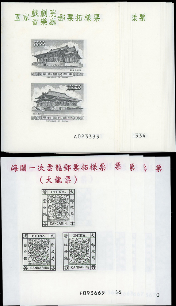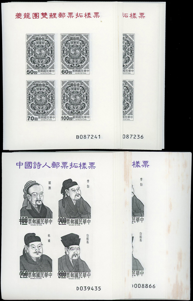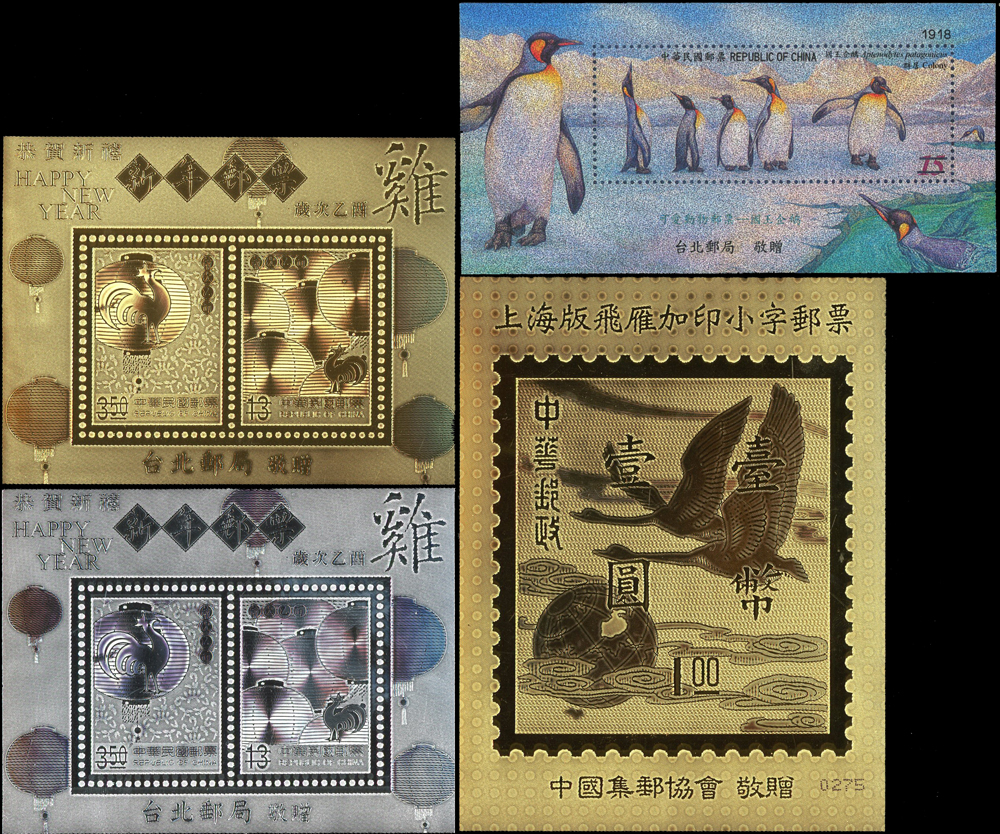 郵政贈品:(1)拓樣票:(A)國家戲劇院、國家音樂廳23枚,(B)夔龍團雙鯉17枚,(D)中國詩人55枚(多數四邊黃斑),(F)大龍票5枚,VF-F;(2)金箔小全張-飛雁.乙酉雞年各1枚,銀箔小全張-乙酉雞年1枚,國王企鵝紀念張1枚,VF