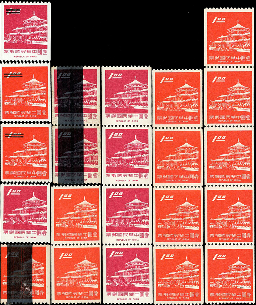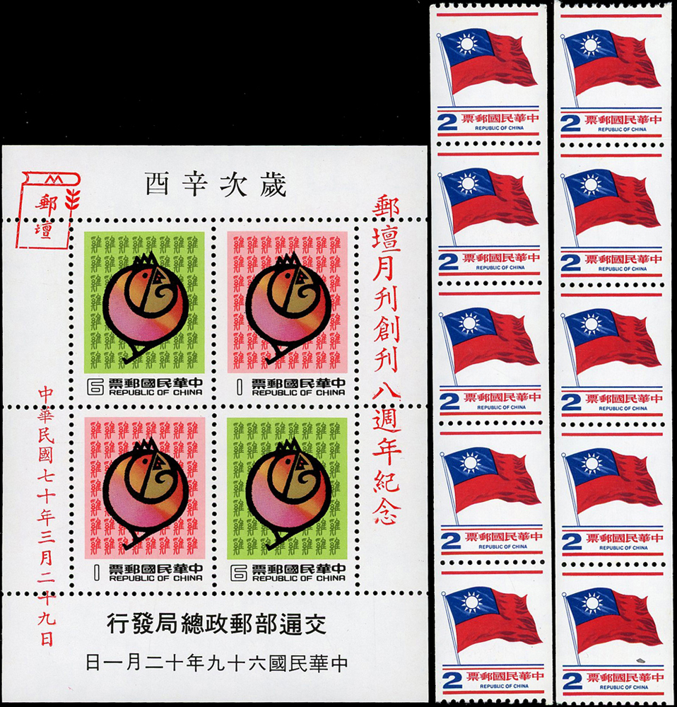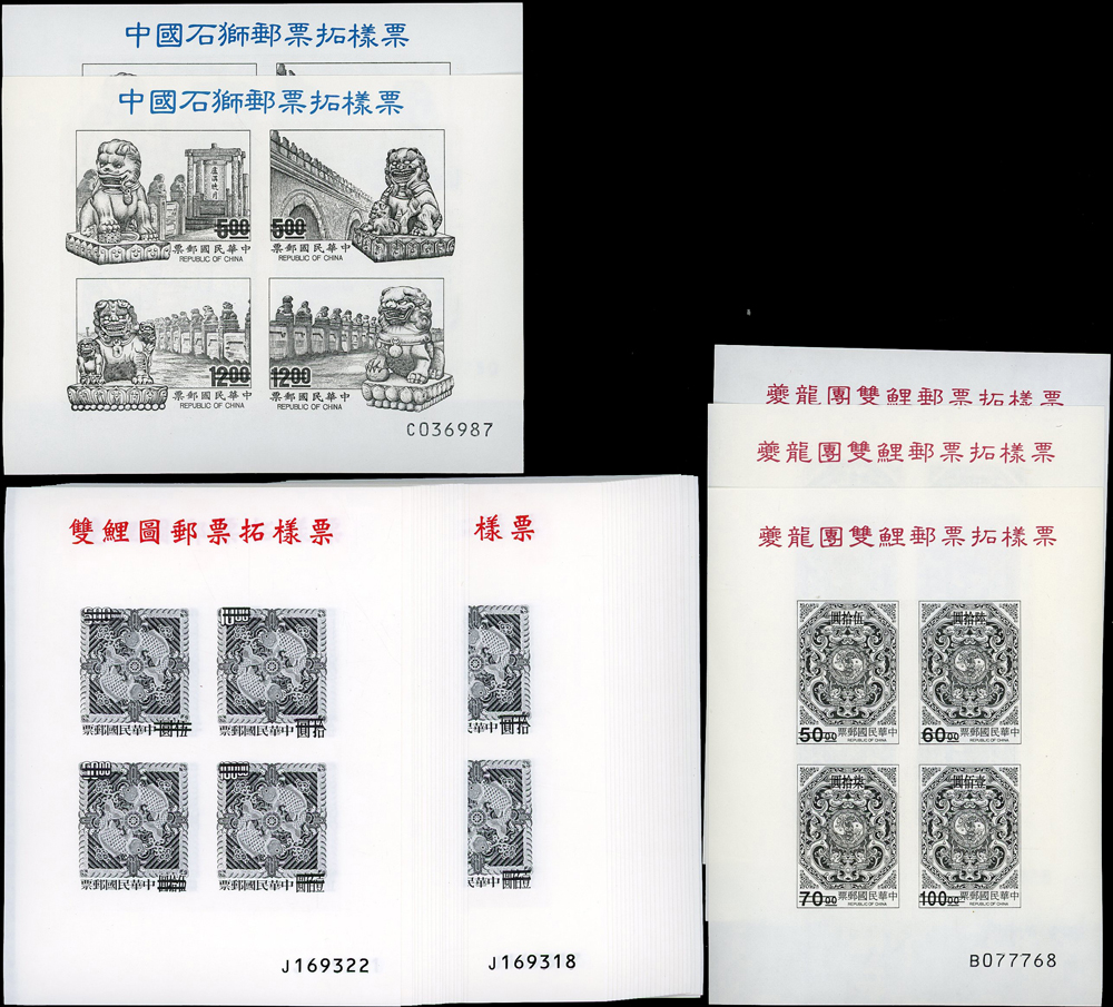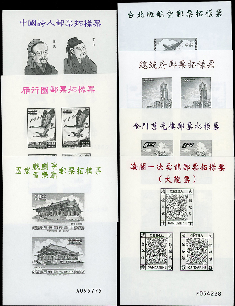 台灣郵品:(1)拓樣票:A國家戲劇院.國家音樂廳1枚,B夔龍團雙鯉3枚,C中國石獅2枚,D中國詩人1枚,E雁行圖1枚,F大龍票1枚,G莒光樓1枚,H總統府1枚,I台北版航空1枚,J雙鯉圖40枚;(2)青花瓷豪華張1枚,二輪雞小全張加蓋郵壇月刊八週年1枚;(3)捲筒票:國旗5連2組,一版中山樓4連及單枚,二版中山樓5連.4連及雙連;(4)一版中山樓雙連及二版中山樓1枚,均帶票尾黑線;(5)樣張:一版中山樓1枚,二版中山樓2枚;以上品像混合,均為新票,VF-F;贈孫中山3枚,雙犬5枚圖卡,歡迎至官網瀏覽全貌;林茂興舊藏