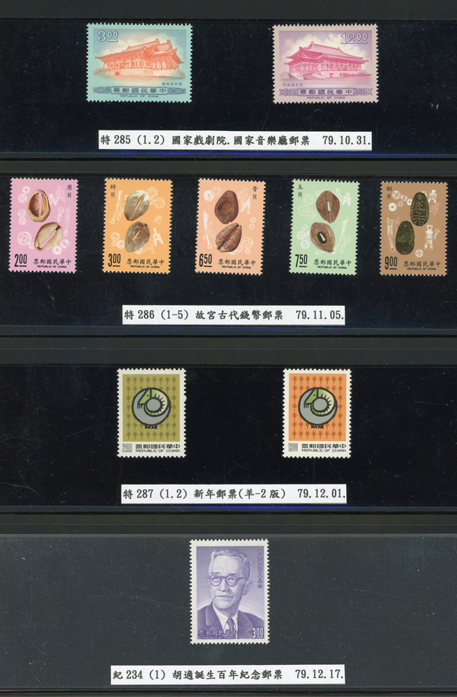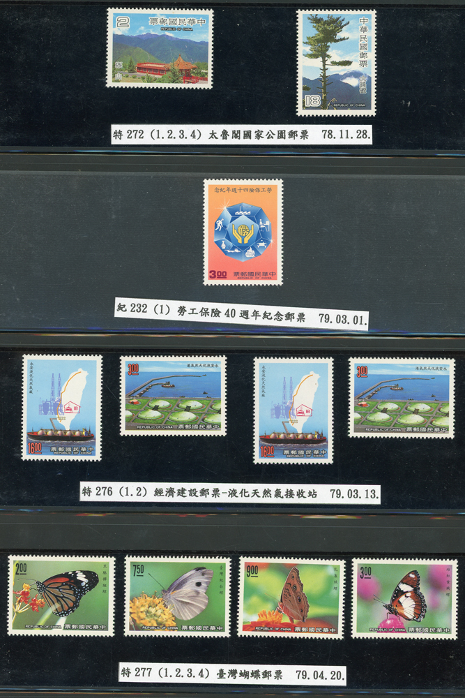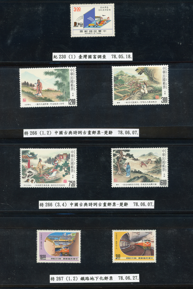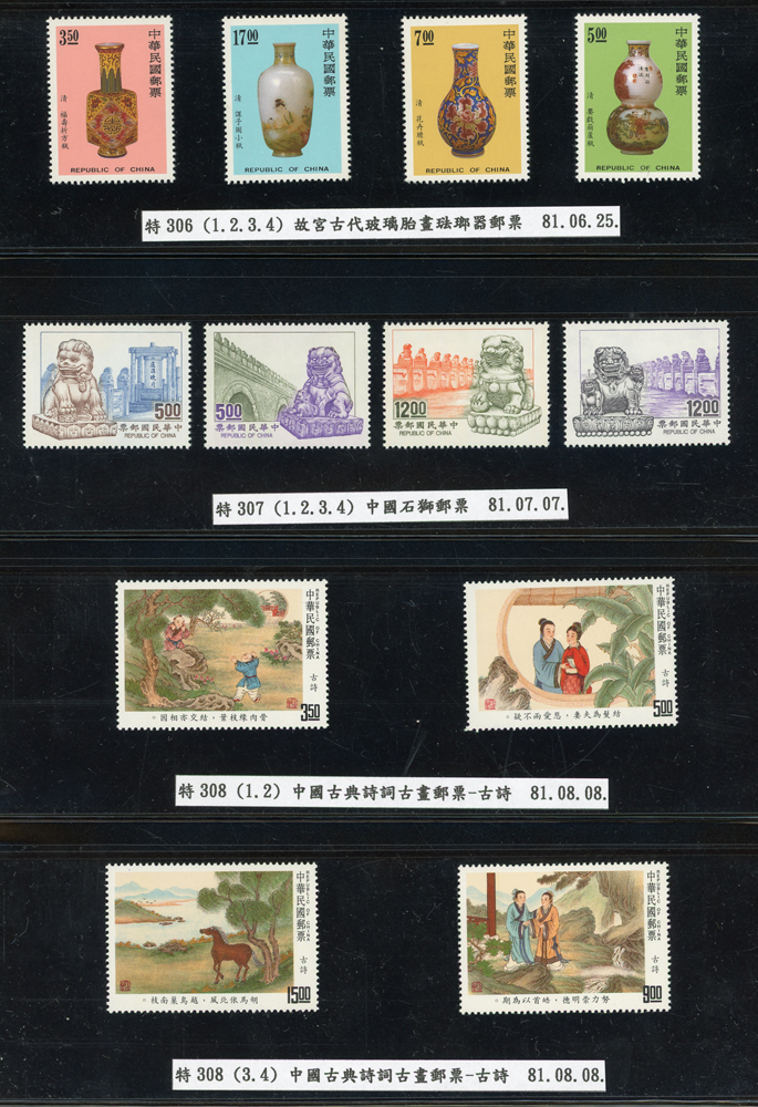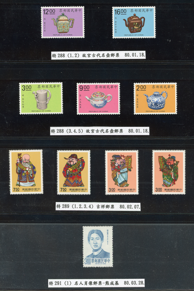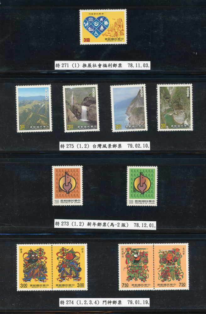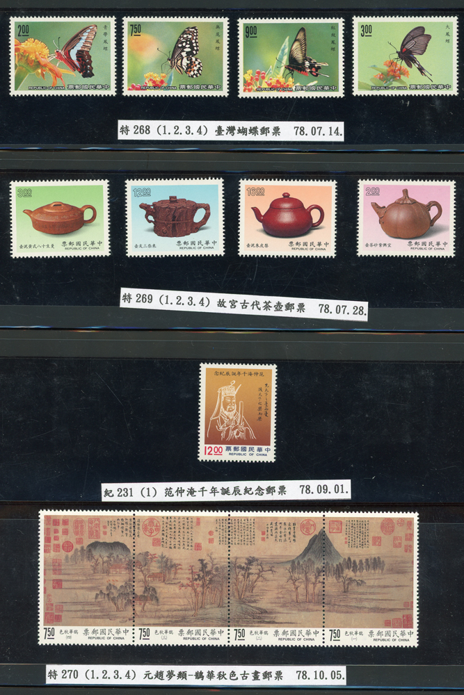 台灣1989~2007年新票一組,整理整齊於黑卡中,每套均包覆護袋,旁加註說明,多數不重複,總面值共計NT$11896元,包括有:戴傳賢誕生百年.蔣經國逝世週年.鵲華秋色.蝴蝶.樂府詩.故宮鼻煙壼.古代錢幣.故宮名壼.吉祥.中華傳統服飾.孔雀.古詩.故宮玻璃胎畫琺瑯器.緙絲.1993亞洲國際郵票邀請展.中國石獅.天工開物.發明神話.麗人行.中國書法藝術.國立故宮博物院建院70週年.1996第十屆亞洲國際郵展.故宮鳥譜.元世祖出獵圖.鍾馗古畫.欠資.昇平樂事.中國古典戲劇.文房四寶.星座.近代畫作.聽阮圖.宋代書畫.鯨豚.台灣老火車站.八仙過海.台灣溫泉.八色鳥.天雞尊.台北101等等,品種豐富,品像混合,多數保存佳,VF-F;歡迎至官網瀏覽全貌