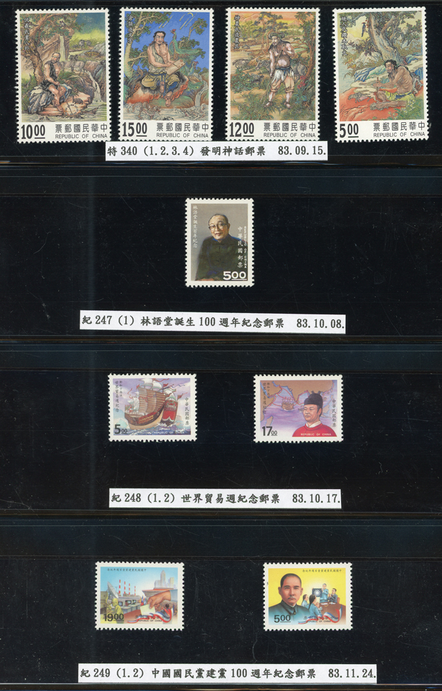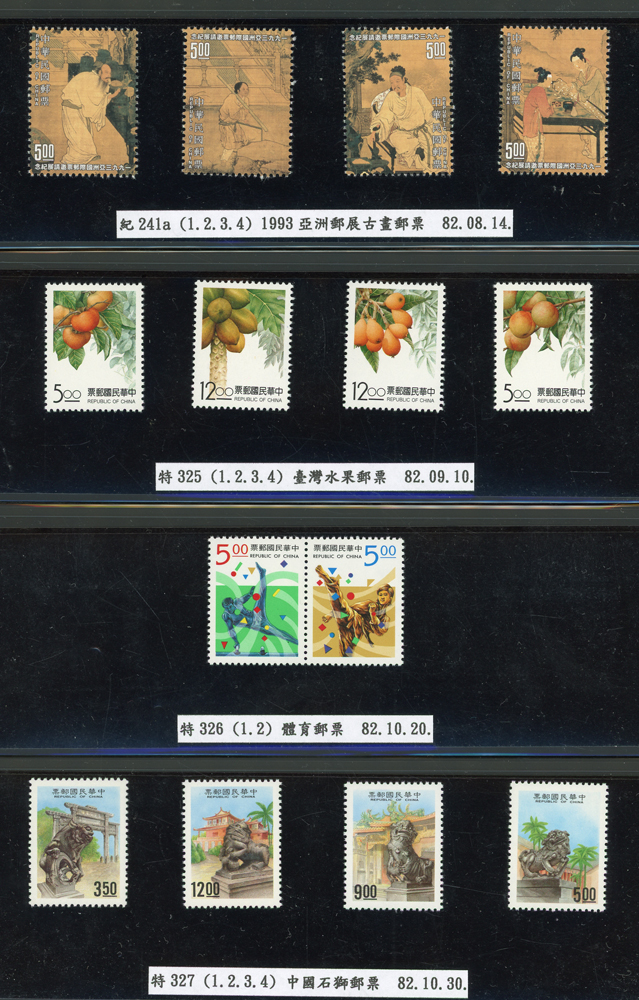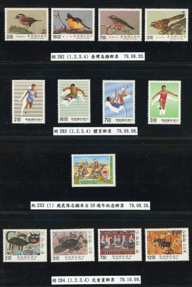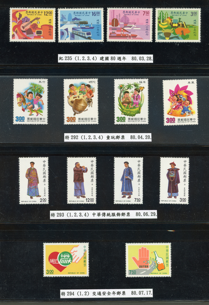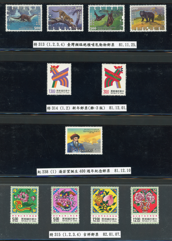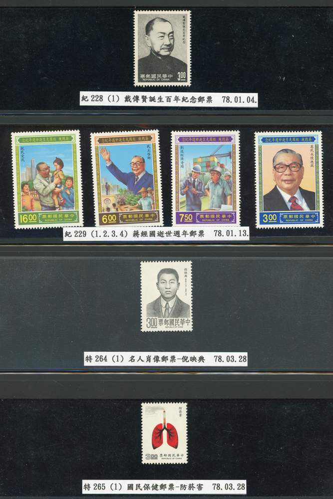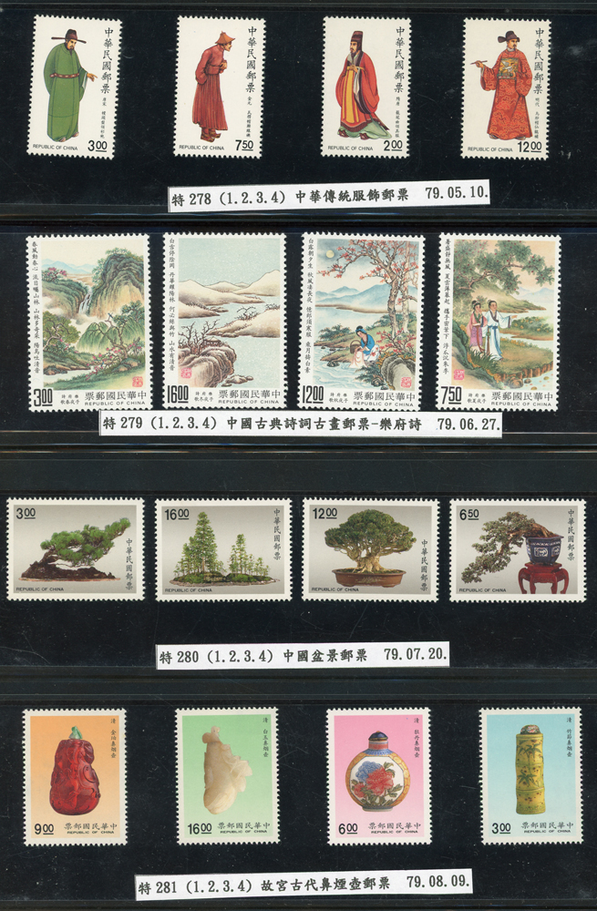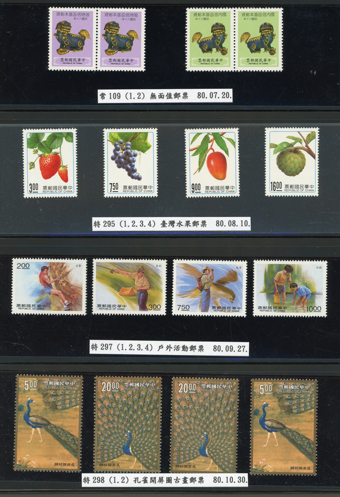 台灣1989~2007年新票一組,整理整齊於黑卡中,每套均包覆護袋,旁加註說明,多數不重複,總面值共計NT$11896元,包括有:戴傳賢誕生百年.蔣經國逝世週年.鵲華秋色.蝴蝶.樂府詩.故宮鼻煙壼.古代錢幣.故宮名壼.吉祥.中華傳統服飾.孔雀.古詩.故宮玻璃胎畫琺瑯器.緙絲.1993亞洲國際郵票邀請展.中國石獅.天工開物.發明神話.麗人行.中國書法藝術.國立故宮博物院建院70週年.1996第十屆亞洲國際郵展.故宮鳥譜.元世祖出獵圖.鍾馗古畫.欠資.昇平樂事.中國古典戲劇.文房四寶.星座.近代畫作.聽阮圖.宋代書畫.鯨豚.台灣老火車站.八仙過海.台灣溫泉.八色鳥.天雞尊.台北101等等,品種豐富,品像混合,多數保存佳,VF-F;歡迎至官網瀏覽全貌