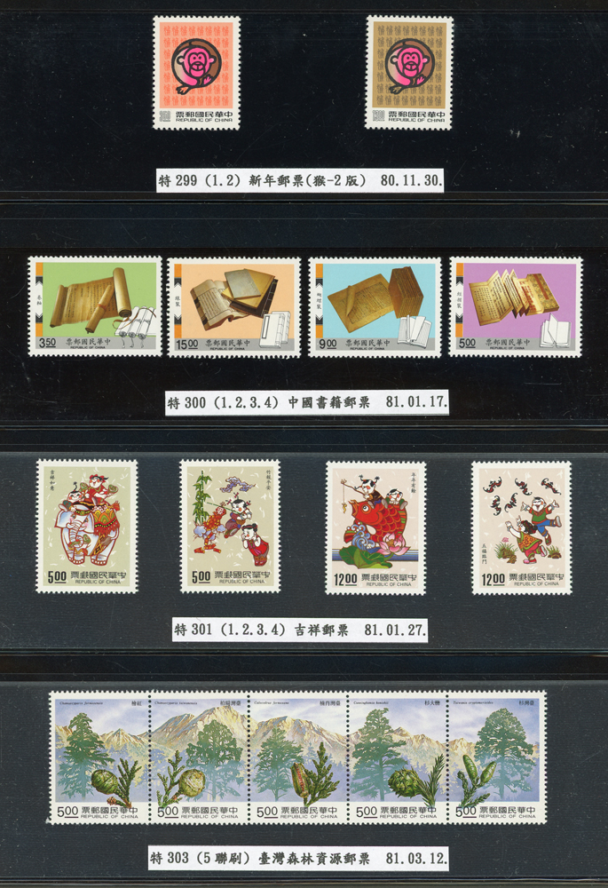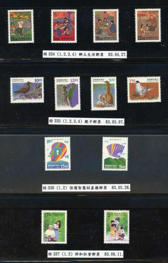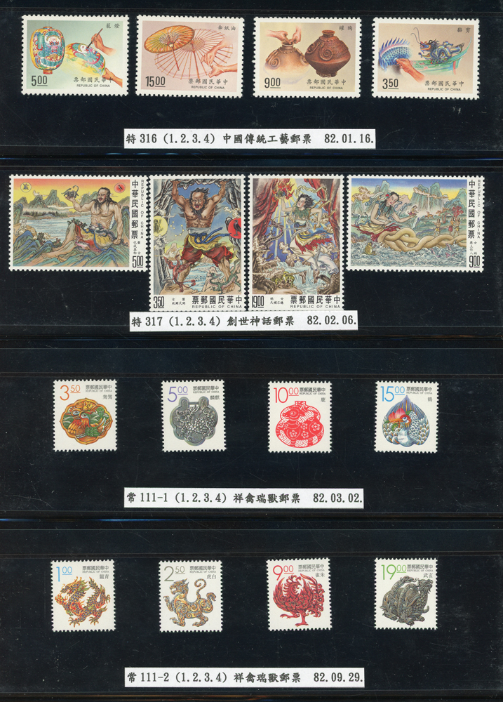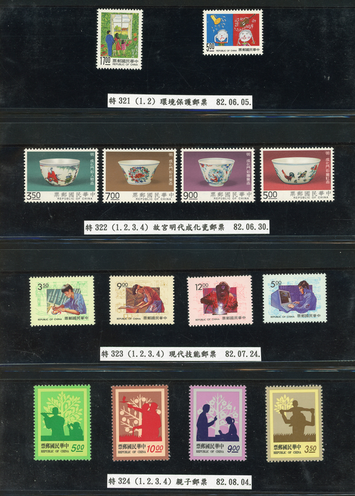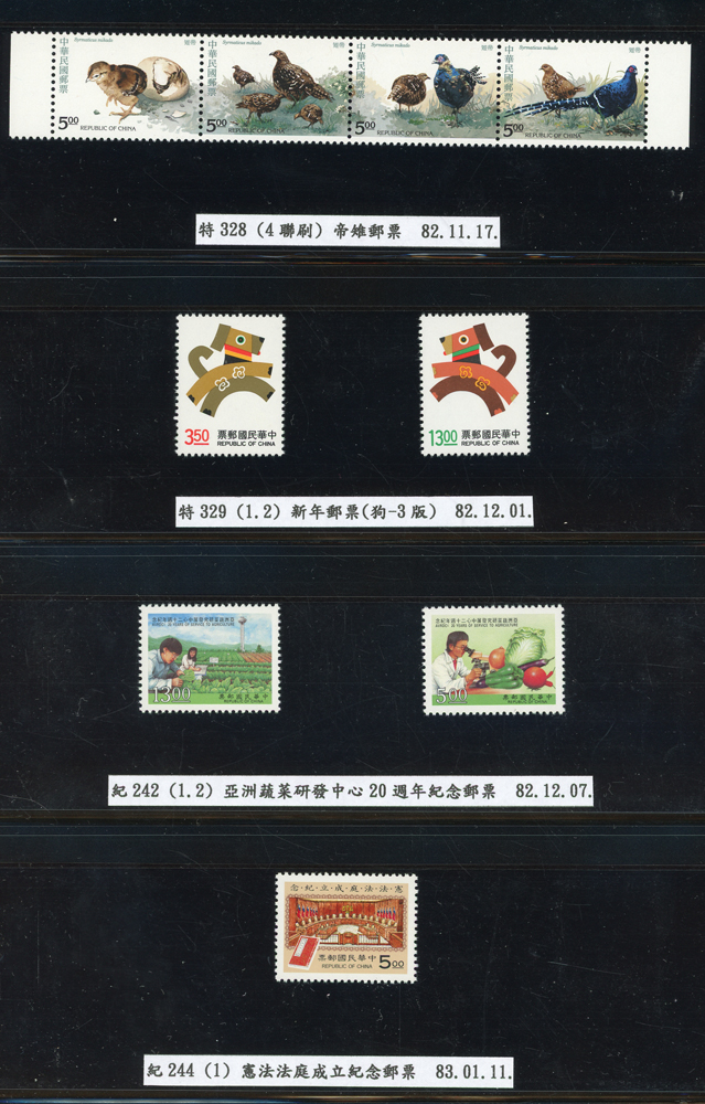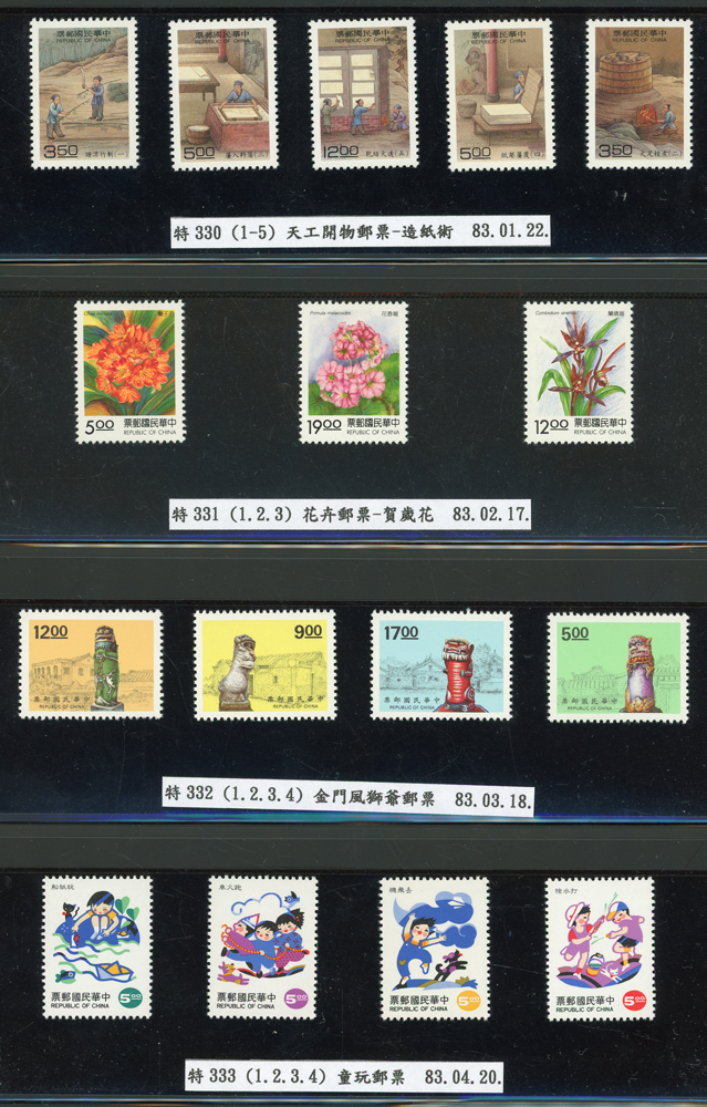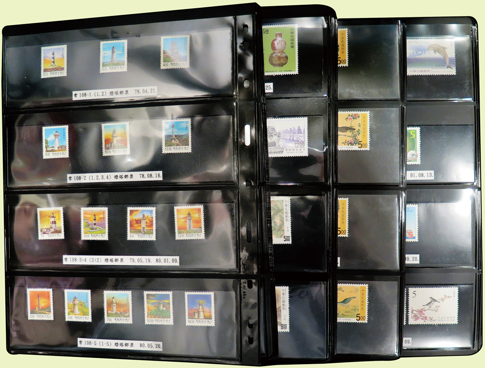 台灣1989~2007年新票一組,整理整齊於黑卡中,每套均包覆護袋,旁加註說明,多數不重複,總面值共計NT$11896元,包括有:戴傳賢誕生百年.蔣經國逝世週年.鵲華秋色.蝴蝶.樂府詩.故宮鼻煙壼.古代錢幣.故宮名壼.吉祥.中華傳統服飾.孔雀.古詩.故宮玻璃胎畫琺瑯器.緙絲.1993亞洲國際郵票邀請展.中國石獅.天工開物.發明神話.麗人行.中國書法藝術.國立故宮博物院建院70週年.1996第十屆亞洲國際郵展.故宮鳥譜.元世祖出獵圖.鍾馗古畫.欠資.昇平樂事.中國古典戲劇.文房四寶.星座.近代畫作.聽阮圖.宋代書畫.鯨豚.台灣老火車站.八仙過海.台灣溫泉.八色鳥.天雞尊.台北101等等,品種豐富,品像混合,多數保存佳,VF-F;歡迎至官網瀏覽全貌