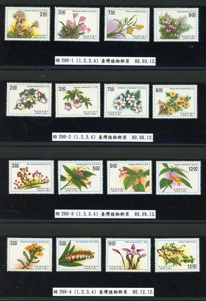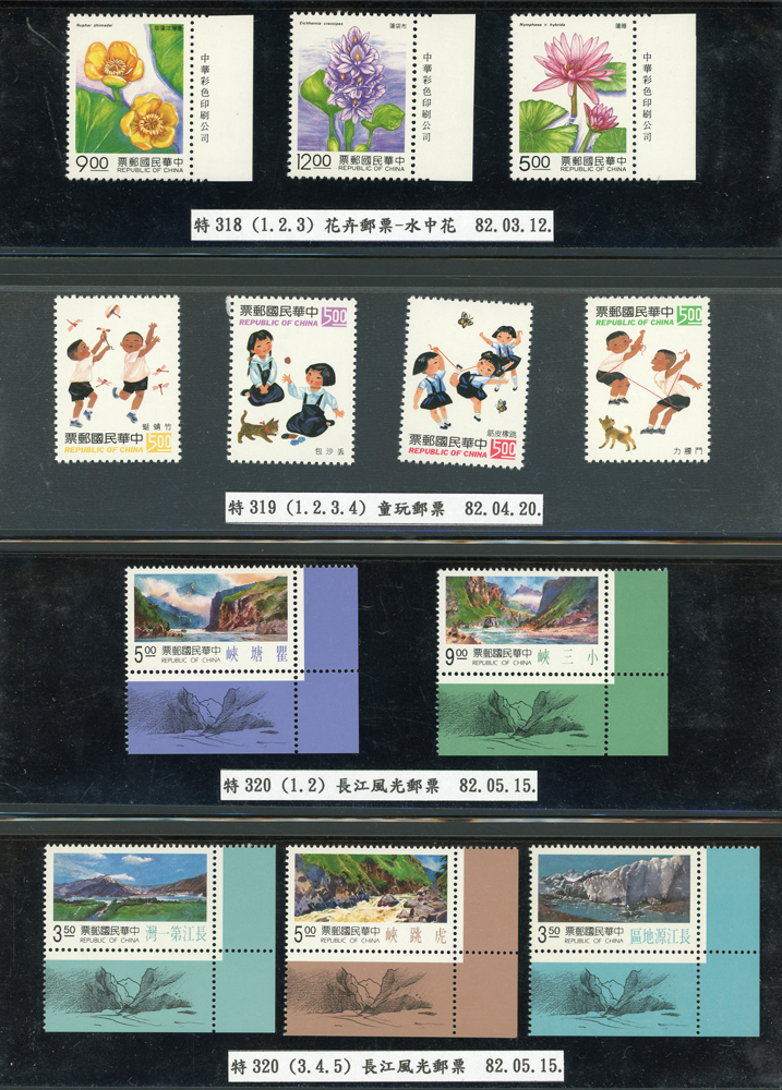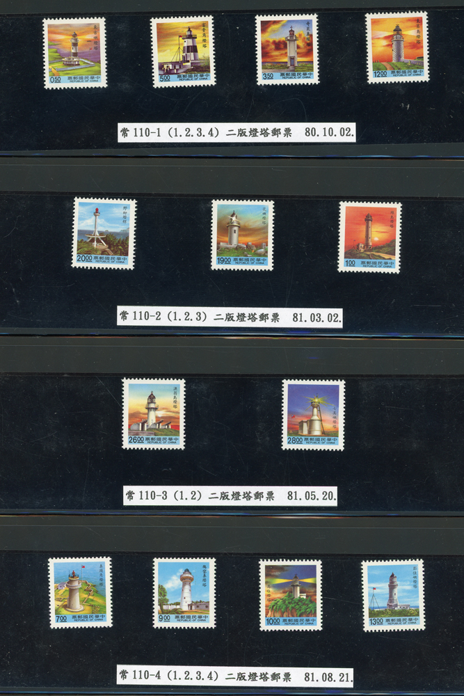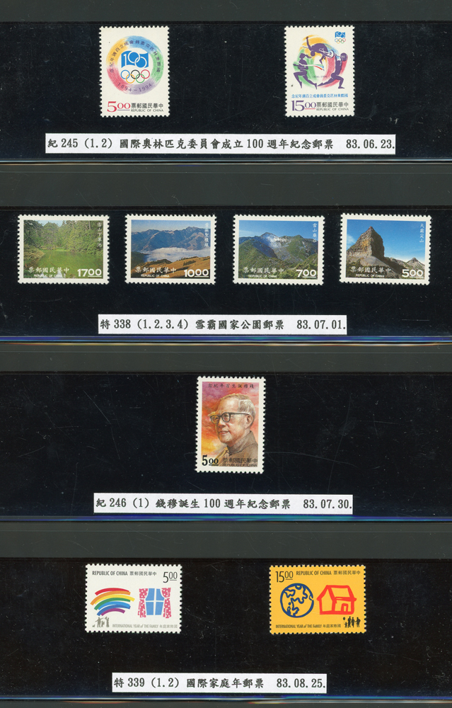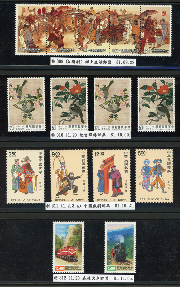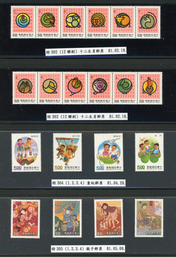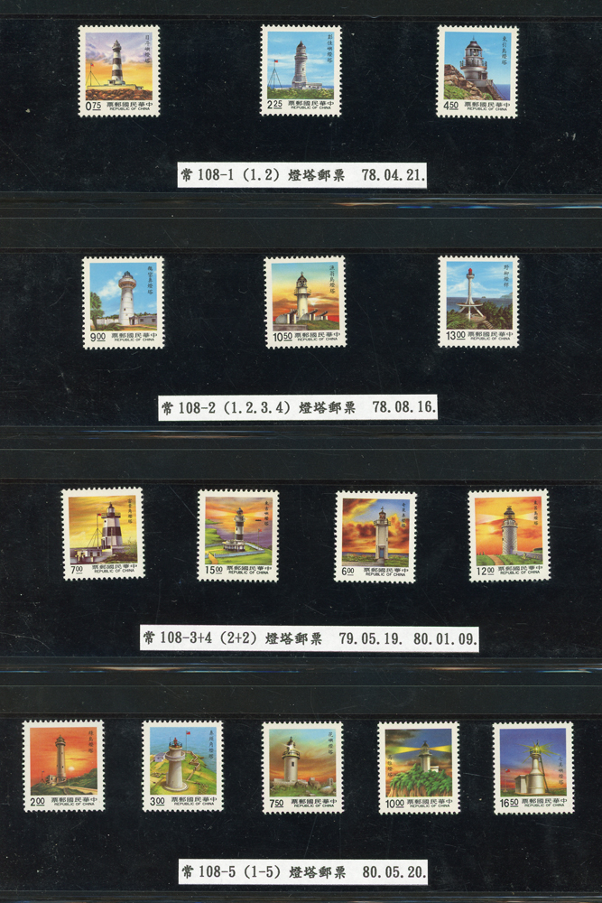 台灣1989~2007年新票一組,整理整齊於黑卡中,每套均包覆護袋,旁加註說明,多數不重複,總面值共計NT$11896元,包括有:戴傳賢誕生百年.蔣經國逝世週年.鵲華秋色.蝴蝶.樂府詩.故宮鼻煙壼.古代錢幣.故宮名壼.吉祥.中華傳統服飾.孔雀.古詩.故宮玻璃胎畫琺瑯器.緙絲.1993亞洲國際郵票邀請展.中國石獅.天工開物.發明神話.麗人行.中國書法藝術.國立故宮博物院建院70週年.1996第十屆亞洲國際郵展.故宮鳥譜.元世祖出獵圖.鍾馗古畫.欠資.昇平樂事.中國古典戲劇.文房四寶.星座.近代畫作.聽阮圖.宋代書畫.鯨豚.台灣老火車站.八仙過海.台灣溫泉.八色鳥.天雞尊.台北101等等,品種豐富,品像混合,多數保存佳,VF-F;歡迎至官網瀏覽全貌