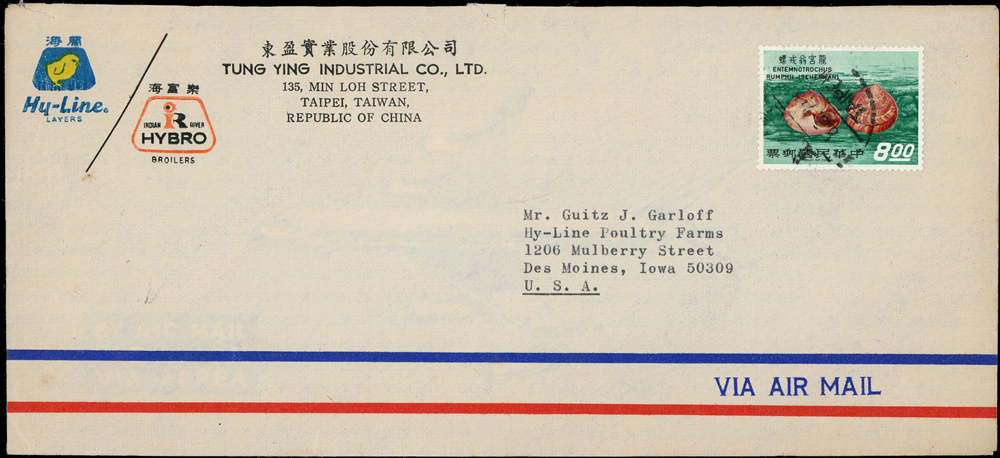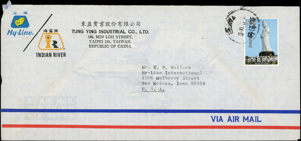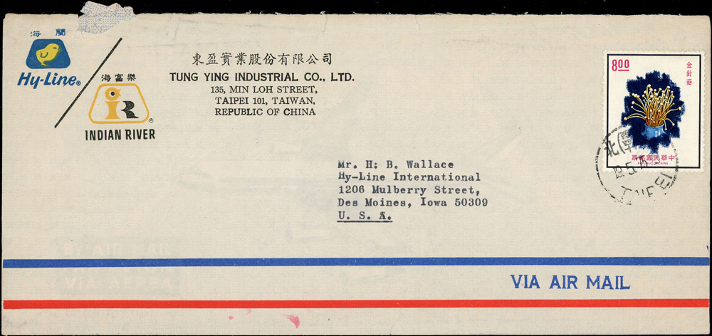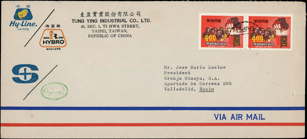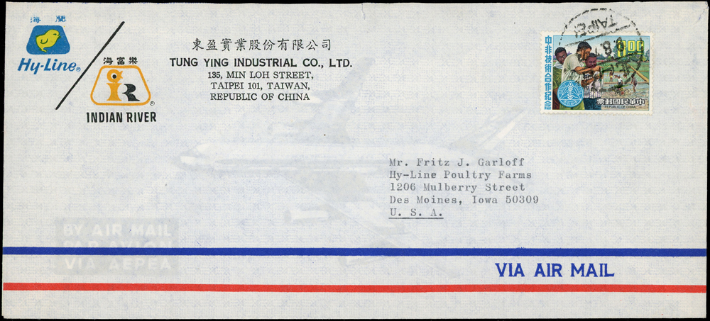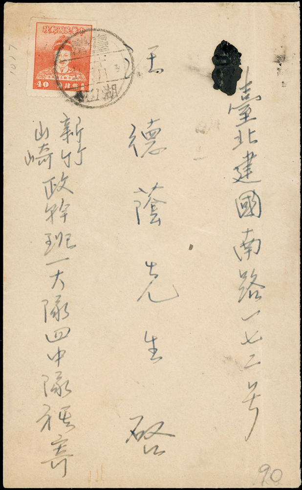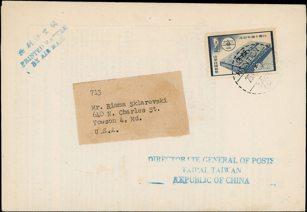 國內封七件:(1)1950年新竹山崎寄台北封,貼鄭成功像4角1枚,銷湖口十月九日(年份不清),背銷台北卅九年十月十日到戳;(2)1959年台北寄美國航空印刷品封(集郵報導裸寄),貼行憲10週年3.5元1枚,銷新店26.Ⅶ.59中英文戳;(3)1970-80年代台北寄美國航空封五封,貼彩色票不重複