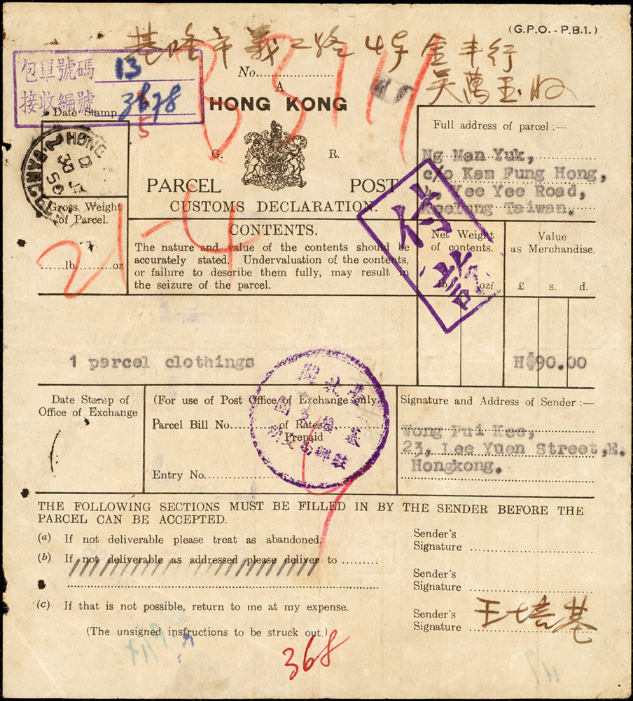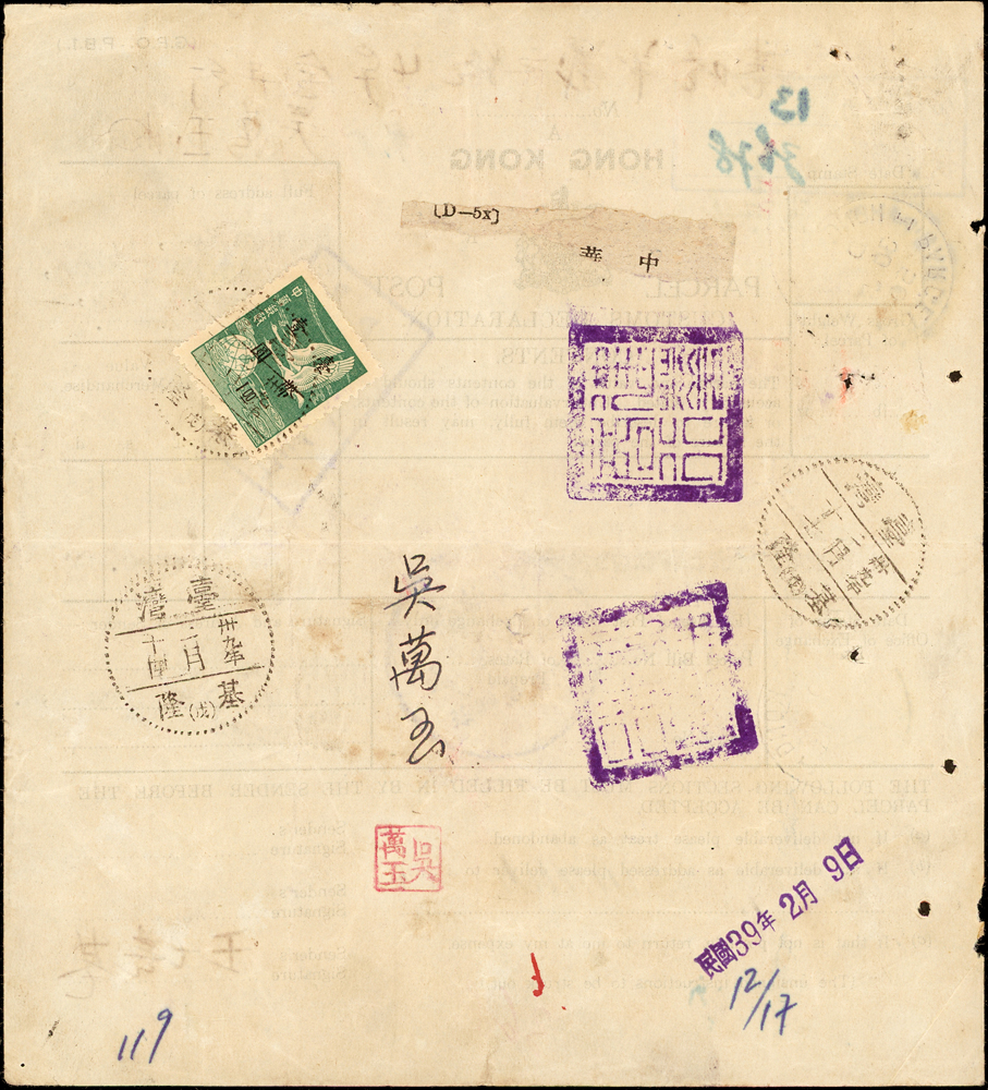 信封分類 大清郵政 1911年以前清代~國家郵政史(1082-1112)清代~商埠郵政史(1156-1158)在華客郵郵史(1168-1188)中華民國郵政 1912~1949年民國~郵政史(1424-1537)民國~名人封(1538-1547)民國~防盜(1548-1559)民國~首航封(1560-1570)民國~欠資封(1571-1574)民國~檢查封(1575-1599)民國~行動郵局/信櫃(1600-1613)兩岸通郵史(1933年-1989年)(1614-1632)民國~郵政匯兌(1633-1644)民國~民信局/僑批(1645-1651)民國~郵政明信片(1652-1659)民國~風景明信片(1660-1683)民國~國內及國際航空郵簡(1684-1703)日偽政權~郵政史(1714-1723)台灣 1888~2020年台灣~整批/整冊信封(3554-3583)日治時期~台灣郵史1895~1945(3601-3661)日治時期~台灣明信片(3662-3688)日治時期~台灣風景片(3689-3695)台灣老台幣時期~國父像火炬圖『限臺灣省用』明信片(3738-3739)台灣~老台幣時期郵政史1945~1949(3740-3815)台灣~自動化實寄封(4646-4647)台灣~新台幣時期郵政史(6001-6041)大陳島(6042)台灣~代辦所/欠資/首航(6043-6055)台灣~郵政匯兌(6056-6073)台灣~首日封(6074-6090)台灣~郵資封/郵政明信片(6091-6100)台灣~原圖卡(6101-6113)台灣~國內及國際航空郵簡(6114-6122)中國人民郵政 1949~2018年新中國~解放區郵史(6128-6140)新中國~郵政史(6277-6289)新中國~郵政匯兌/郵資封片(6290-6304)中國香港~郵政史(6314-6316)世界各國郵票日本郵政史(6327-6334)外國信封(A~Z)(6350-6365) 大清郵政 1911年以前 ↳清代~國家郵政史(1082-1112) ↳清代~商埠郵政史(1156-1158) ↳在華客郵郵史(1168-1188)中華民國郵政 1912~1949年 ↳民國~郵政史(1424-1537) ↳民國~名人封(1538-1547) ↳民國~防盜(1548-1559) ↳民國~首航封(1560-1570) ↳民國~欠資封(1571-1574) ↳民國~檢查封(1575-1599) ↳民國~行動郵局/信櫃(1600-1613) ↳兩岸通郵史(1933年-1989年)(1614-1632) ↳民國~郵政匯兌(1633-1644) ↳民國~民信局/僑批(1645-1651) ↳民國~郵政明信片(1652-1659) ↳民國~風景明信片(1660-1683) ↳民國~國內及國際航空郵簡(1684-1703) ↳日偽政權~郵政史(1714-1723)台灣 1888~2020年 ↳台灣~整批/整冊信封(3554-3583) ↳日治時期~台灣郵史1895~1945(3601-3661) ↳日治時期~台灣明信片(3662-3688) ↳日治時期~台灣風景片(3689-3695) ↳台灣老台幣時期~國父像火炬圖『限臺灣省用』明信片(3738-3739) ↳台灣~老台幣時期郵政史1945~1949(3740-3815) ↳台灣~自動化實寄封(4646-4647) ↳台灣~新台幣時期郵政史(6001-6041) ↳大陳島(6042) ↳台灣~代辦所/欠資/首航(6043-6055) ↳台灣~郵政匯兌(6056-6073) ↳台灣~首日封(6074-6090) ↳台灣~郵資封/郵政明信片(6091-6100) ↳台灣~原圖卡(6101-6113) ↳台灣~國內及國際航空郵簡(6114-6122)中國人民郵政 1949~2018年 ↳新中國~解放區郵史(6128-6140) ↳新中國~郵政史(6277-6289) ↳新中國~郵政匯兌/郵資封片(6290-6304) ↳中國香港~郵政史(6314-6316)世界各國郵票 ↳日本郵政史(6327-6334) ↳外國信封(A~Z)(6350-6365) 點大圖放大展示,點小圖切換 3 1950年香港寄基隆包裹報關單,背貼一版飛雁窄距1元1枚,銷臺灣基隆(戊)39.2.17戳;有裝訂孔,源自檔案(Page 119) 結標時間 2025-12-16 10:01:00 拍品編號:6004 起拍價:NT$6000 當前價:NT$6000 自動出價 直接出價 出價 系統將按出價級數,依序為您比(出)價至上限金額 提醒您:直接出價後不可將金額改低,只能改高,蟠龍無法降低您的出價,最高出價者無法取消出價 (查看出價說明) 得標說明:需按得標價另加10%佣金 當前加價幅度:NT$0元 (查看加價級數表) 回上頁 線上出價記錄 線上 0 人次,書面 0 人次 競價客戶 所在地 出價時間 出價金額 出價方式 問與答 目前尚無提問 我要提問 請先登入會員