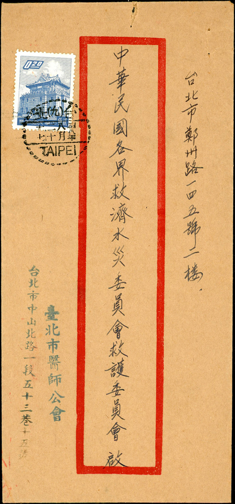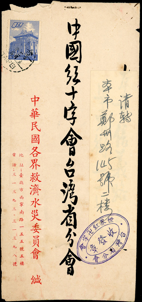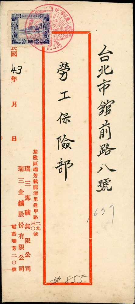 實寄封三件及黑白片二片:(1)1954年基隆寄台北掛號封,貼西螺大橋1.6元1枚,銷慶祝第二任總統就職/瑞芳/43.5.20紀念戳;(2)1959年台北寄本埠封二件,均貼三莒2角1枚,機宣到戳;(3)南京鐵道部黑白片二片不同