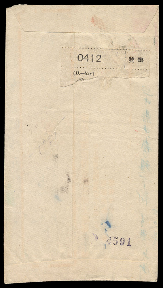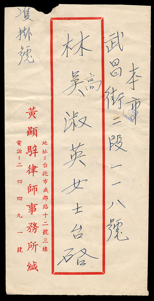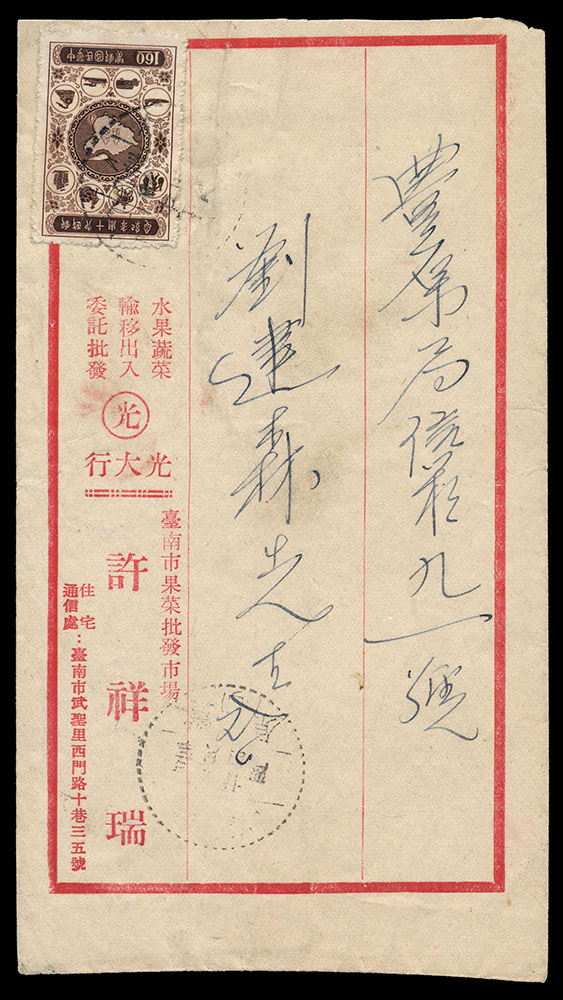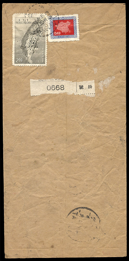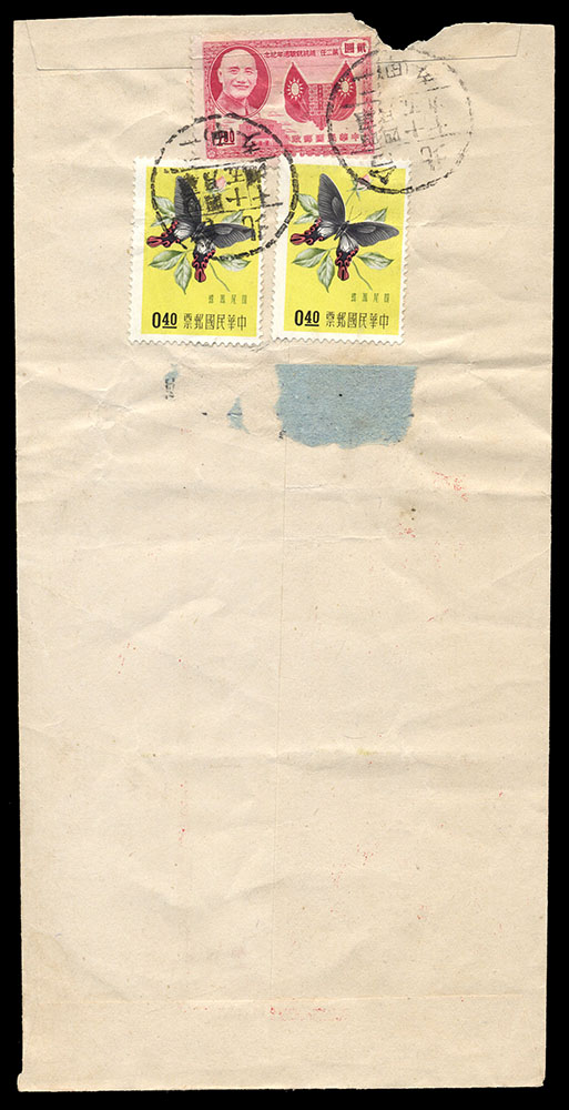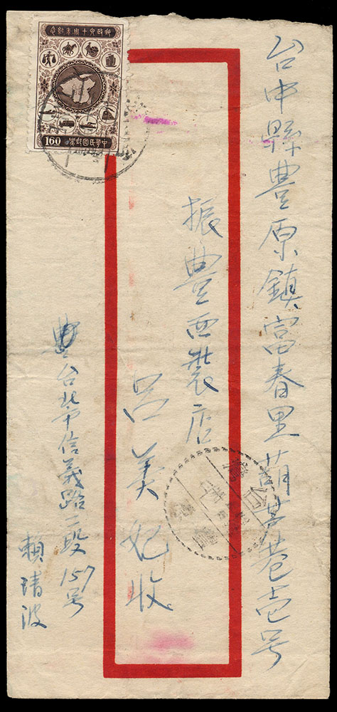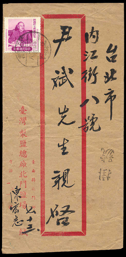 國內封五件:(1)1954年自台南寄台中中式掛號封,貼郵政60週年1.6元一枚,銷戳不清,另銷豐原到戳;(2)1954年自台南寄台中中式封,貼郵政60週年1.6元一枚,銷戳不清,另銷豐原到戳;(3)自台南寄台北中式掛號封,貼蔣公七秩1.6元一枚,銷戳不清,另銷台北到戳;(4)自台南寄台北中式掛號封,貼橫貫公路開工2元一枚.凸版地圖4角一枚,銷台南戳(日期不清),另銷台北到戳;(5)1958年寄台北本地雙掛號封,貼二任總統就職2元一枚,昆蟲4角二枚,銷台北二支(甲)戳