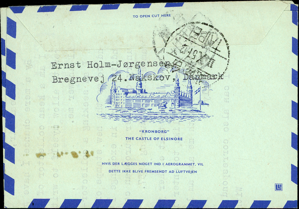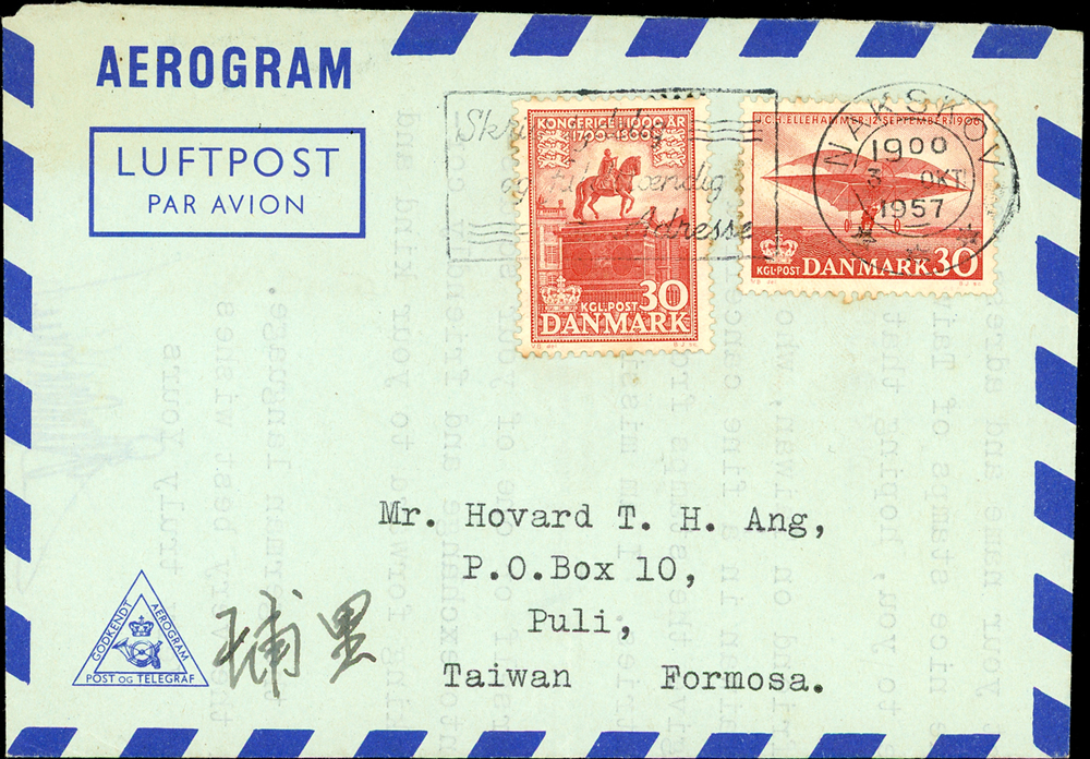 郵簡二件:(1)1957年丹麥寄埔里航空郵簡,貼丹麥郵票2枚銷納克斯科夫1957.10.3戳,背銷台北1957.10.11戳,埔里1957.10.12到戳;(2)1951年紐西蘭2便士郵簡加貼3D票1枚寄澳洲;林茂興舊藏(Page 120)