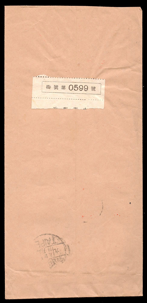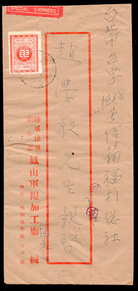 陸軍供應司令部鳳山軍糧加工廠寄台北4封:(1)1957年寄台北限時封,貼電信75年1.4元1枚,銷鳳山戳不清,背銷台北四六年三月三十日到戳;(2)1957年寄台北限時封,貼童軍露營1元及蔣總統七秩4角各一枚,銷嘉義四六年九月十日,背銷台北隔日到戳;(3)1957年陸軍供應司令部楠梓軍糧加工廠寄台北掛號封,貼電信75年1.6元1枚,銷楠梓四六年四月八日,背銷台北同日到戳;(4)1957年陸軍供應司令部嘉義軍糧加工廠寄台北封,貼童軍露營4角1枚,銷嘉義四六年九月一日,背銷台北隔日機宣到戳