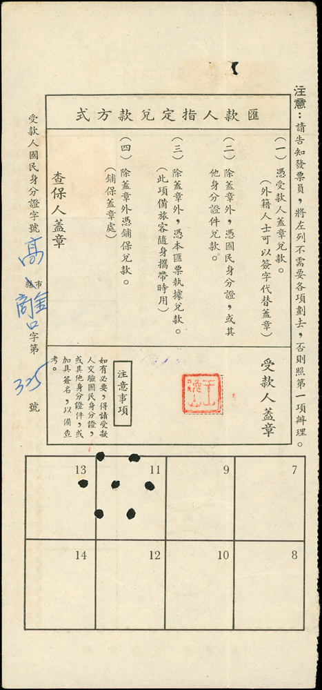 信封分類 大清郵政 1911年以前清代~國家郵政史(1082-1112)清代~商埠郵政史(1156-1158)在華客郵郵史(1168-1188)中華民國郵政 1912~1949年民國~郵政史(1424-1537)民國~名人封(1538-1547)民國~防盜(1548-1559)民國~首航封(1560-1570)民國~欠資封(1571-1574)民國~檢查封(1575-1599)民國~行動郵局/信櫃(1600-1613)兩岸通郵史(1933年-1989年)(1614-1632)民國~郵政匯兌(1633-1644)民國~民信局/僑批(1645-1651)民國~郵政明信片(1652-1659)民國~風景明信片(1660-1683)民國~國內及國際航空郵簡(1684-1703)日偽政權~郵政史(1714-1723)台灣 1888~2020年台灣~整批/整冊信封(3554-3583)日治時期~台灣郵史1895~1945(3601-3661)日治時期~台灣明信片(3662-3688)日治時期~台灣風景片(3689-3695)台灣老台幣時期~國父像火炬圖『限臺灣省用』明信片(3738-3739)台灣~老台幣時期郵政史1945~1949(3740-3815)台灣~自動化實寄封(4646-4647)台灣~新台幣時期郵政史(6001-6041)大陳島(6042)台灣~代辦所/欠資/首航(6043-6055)台灣~郵政匯兌(6056-6073)台灣~首日封(6074-6090)台灣~郵資封/郵政明信片(6091-6100)台灣~原圖卡(6101-6113)台灣~國內及國際航空郵簡(6114-6122)中國人民郵政 1949~2018年新中國~解放區郵史(6128-6140)新中國~郵政史(6277-6289)新中國~郵政匯兌/郵資封片(6290-6304)中國香港~郵政史(6314-6316)世界各國郵票日本郵政史(6327-6334)外國信封(A~Z)(6350-6365) 大清郵政 1911年以前 ↳清代~國家郵政史(1082-1112) ↳清代~商埠郵政史(1156-1158) ↳在華客郵郵史(1168-1188)中華民國郵政 1912~1949年 ↳民國~郵政史(1424-1537) ↳民國~名人封(1538-1547) ↳民國~防盜(1548-1559) ↳民國~首航封(1560-1570) ↳民國~欠資封(1571-1574) ↳民國~檢查封(1575-1599) ↳民國~行動郵局/信櫃(1600-1613) ↳兩岸通郵史(1933年-1989年)(1614-1632) ↳民國~郵政匯兌(1633-1644) ↳民國~民信局/僑批(1645-1651) ↳民國~郵政明信片(1652-1659) ↳民國~風景明信片(1660-1683) ↳民國~國內及國際航空郵簡(1684-1703) ↳日偽政權~郵政史(1714-1723)台灣 1888~2020年 ↳台灣~整批/整冊信封(3554-3583) ↳日治時期~台灣郵史1895~1945(3601-3661) ↳日治時期~台灣明信片(3662-3688) ↳日治時期~台灣風景片(3689-3695) ↳台灣老台幣時期~國父像火炬圖『限臺灣省用』明信片(3738-3739) ↳台灣~老台幣時期郵政史1945~1949(3740-3815) ↳台灣~自動化實寄封(4646-4647) ↳台灣~新台幣時期郵政史(6001-6041) ↳大陳島(6042) ↳台灣~代辦所/欠資/首航(6043-6055) ↳台灣~郵政匯兌(6056-6073) ↳台灣~首日封(6074-6090) ↳台灣~郵資封/郵政明信片(6091-6100) ↳台灣~原圖卡(6101-6113) ↳台灣~國內及國際航空郵簡(6114-6122)中國人民郵政 1949~2018年 ↳新中國~解放區郵史(6128-6140) ↳新中國~郵政史(6277-6289) ↳新中國~郵政匯兌/郵資封片(6290-6304) ↳中國香港~郵政史(6314-6316)世界各國郵票 ↳日本郵政史(6327-6334) ↳外國信封(A~Z)(6350-6365) 點大圖放大展示,點小圖切換 民國53年郵政國內匯票,貼匯兌印紙300元,銷高雄(儲匯)五三年四月卄三日,兌款局銷台北(儲匯)五三年五月八日(Page 122) 結標時間 2025-12-16 10:21:00 拍品編號:6064 起拍價:NT$500 當前價:NT$500 自動出價 直接出價 出價 系統將按出價級數,依序為您比(出)價至上限金額 提醒您:直接出價後不可將金額改低,只能改高,蟠龍無法降低您的出價,最高出價者無法取消出價 (查看出價說明) 得標說明:需按得標價另加10%佣金 當前加價幅度:NT$0元 (查看加價級數表) 回上頁 線上出價記錄 線上 0 人次,書面 0 人次 競價客戶 所在地 出價時間 出價金額 出價方式 問與答 目前尚無提問 我要提問 請先登入會員