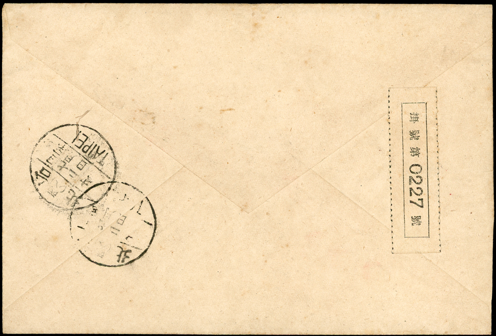 1953年基隆寄台北首日掛號封,貼臺灣防癆協會成立紀念4全,銷基隆42.7.1首日中英戳,背銷台北(丙八)42.7.2到達戳(Page 123)