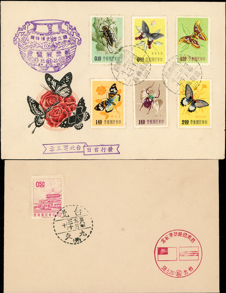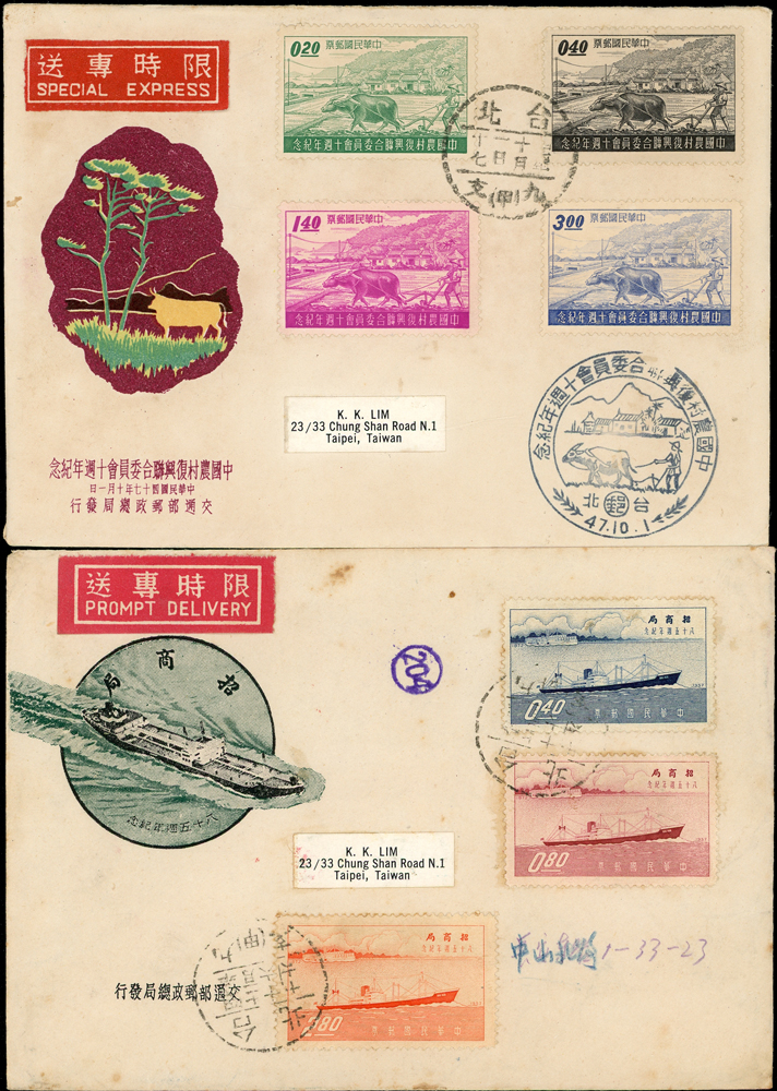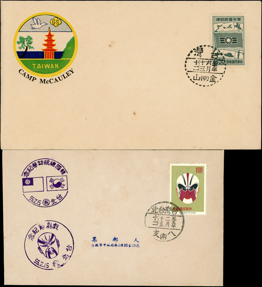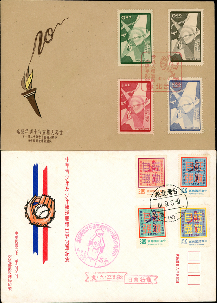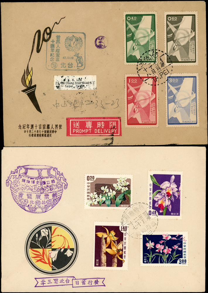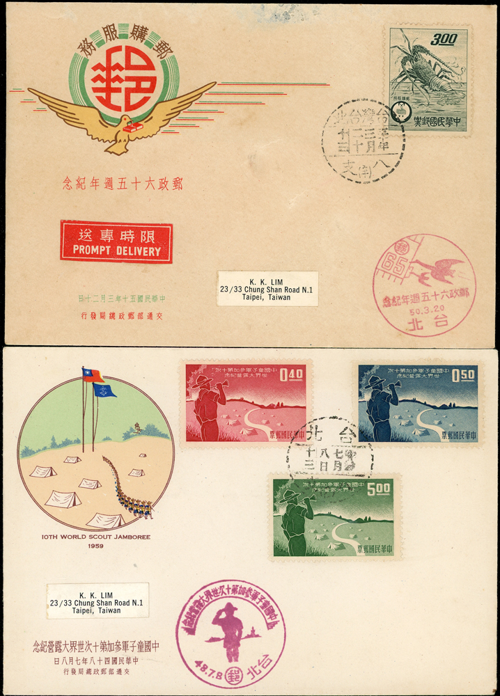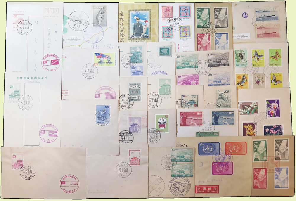 台灣早期封片25件:(1)貼套票首日封12封,含:招商局85週年紀念.台灣昆蟲.臺灣花卉(47年版).中國農村復興聯合委員會十週年紀念.郵購服務.台北版航空改值.中國童子軍參加第十次世界大露營.世界衛生組織十週年.中華青少年及少年棒球雙獲世界冠軍.玉照閱兵各1封,世界人權宣言十週年2封,部分實寄;(2)低值封8封,含貼臉譜1元.中國農村復興聯合委員會十週年2角等,部分實寄;(3)實寄或銷癸戳郵資片5片