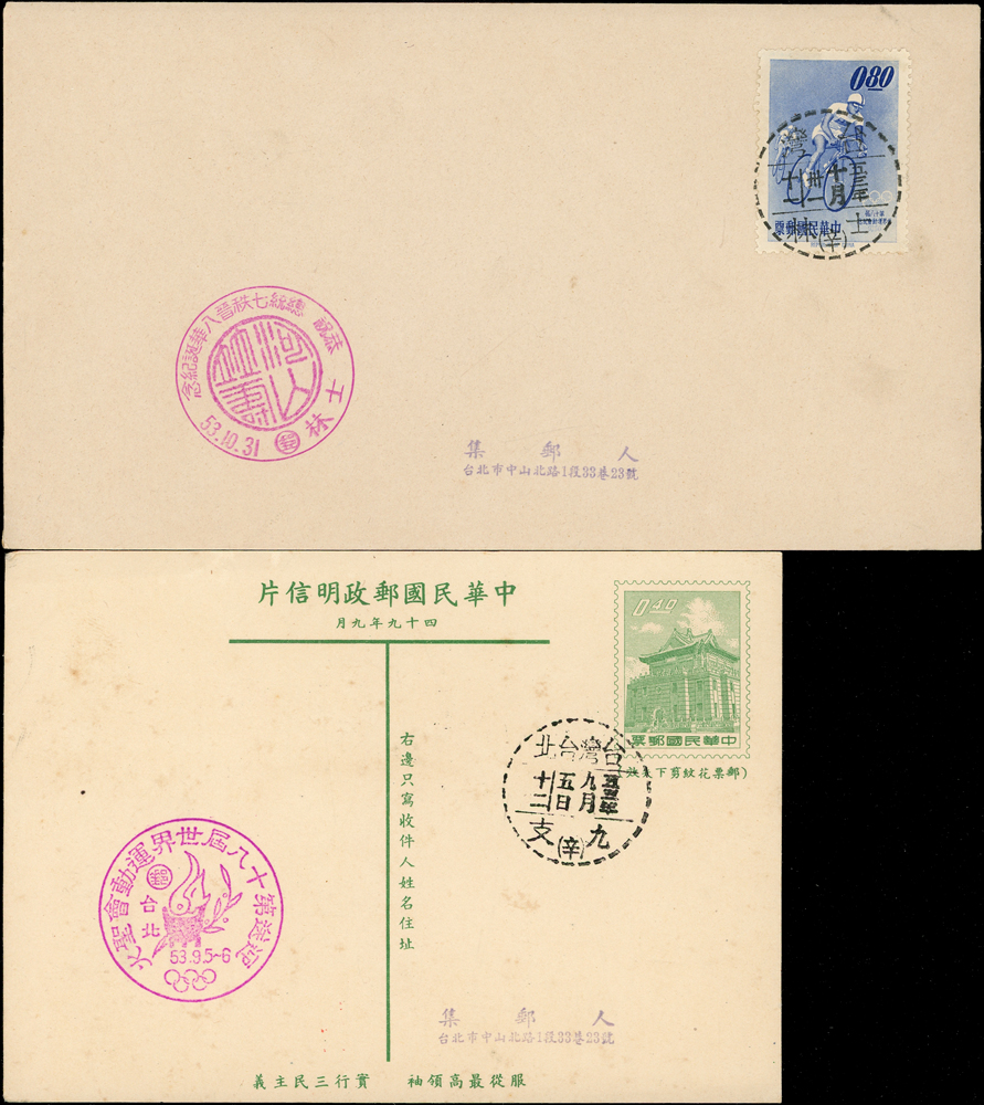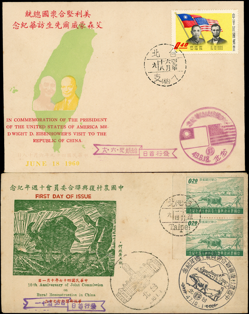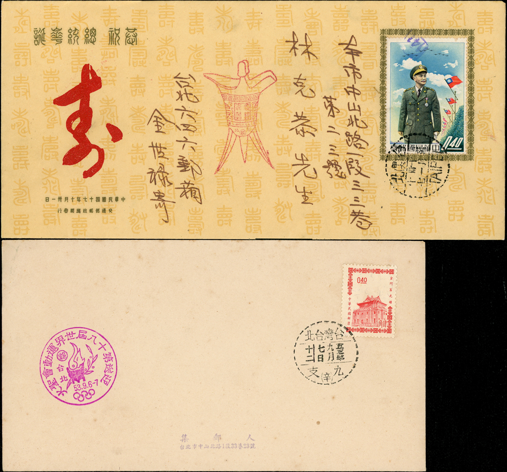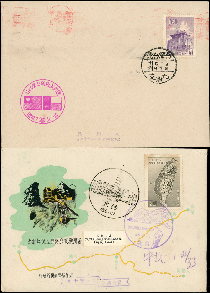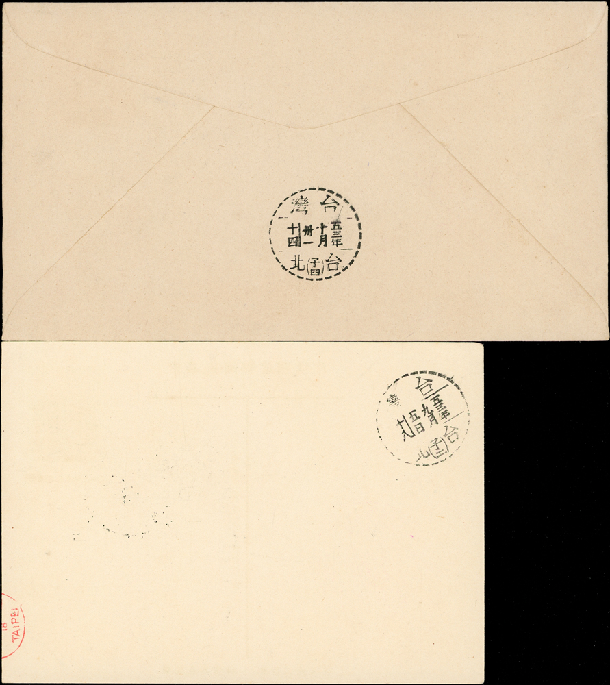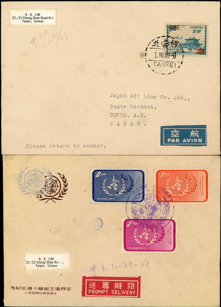 台灣早期封片25件:(1)貼套票首日封12封,含:招商局85週年紀念.台灣昆蟲.臺灣花卉(47年版).中國農村復興聯合委員會十週年紀念.郵購服務.台北版航空改值.中國童子軍參加第十次世界大露營.世界衛生組織十週年.中華青少年及少年棒球雙獲世界冠軍.玉照閱兵各1封,世界人權宣言十週年2封,部分實寄;(2)低值封8封,含貼臉譜1元.中國農村復興聯合委員會十週年2角等,部分實寄;(3)實寄或銷癸戳郵資片5片