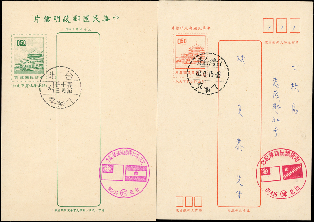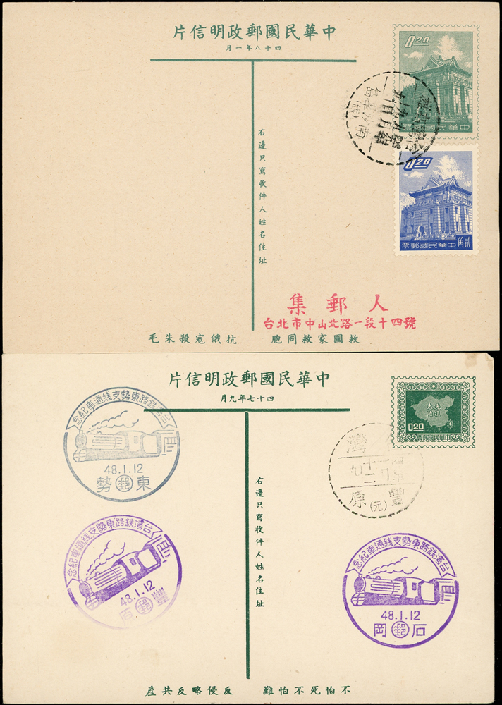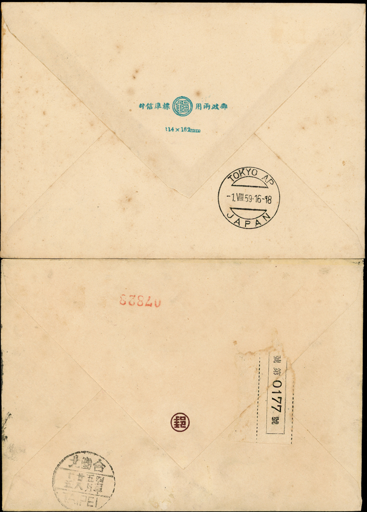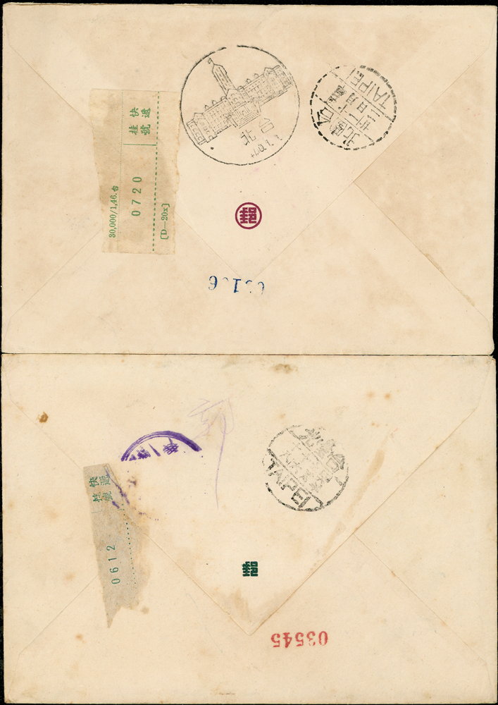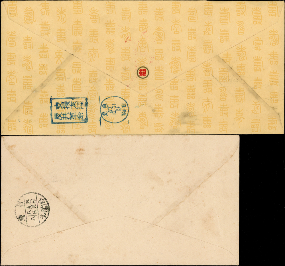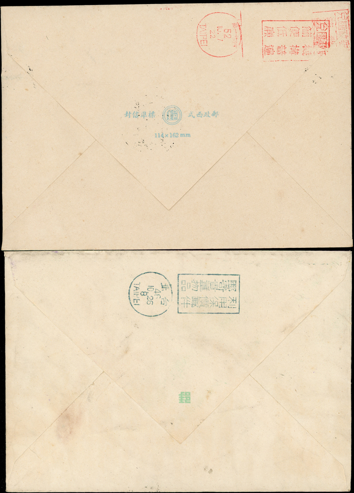 台灣早期封片25件:(1)貼套票首日封12封,含:招商局85週年紀念.台灣昆蟲.臺灣花卉(47年版).中國農村復興聯合委員會十週年紀念.郵購服務.台北版航空改值.中國童子軍參加第十次世界大露營.世界衛生組織十週年.中華青少年及少年棒球雙獲世界冠軍.玉照閱兵各1封,世界人權宣言十週年2封,部分實寄;(2)低值封8封,含貼臉譜1元.中國農村復興聯合委員會十週年2角等,部分實寄;(3)實寄或銷癸戳郵資片5片