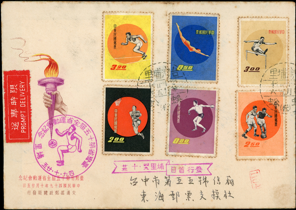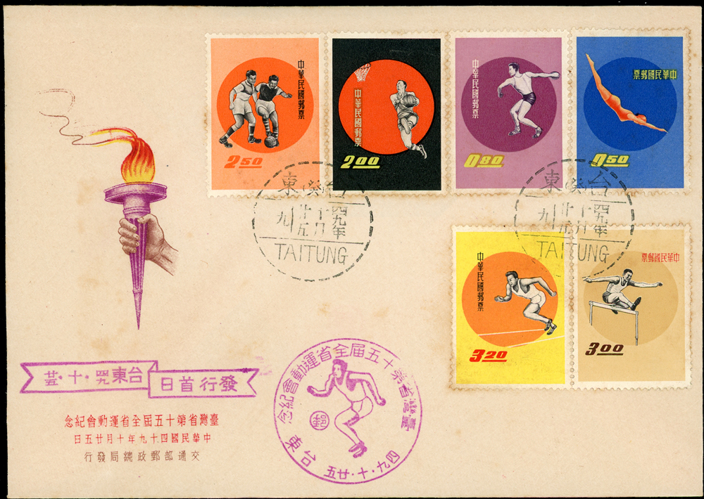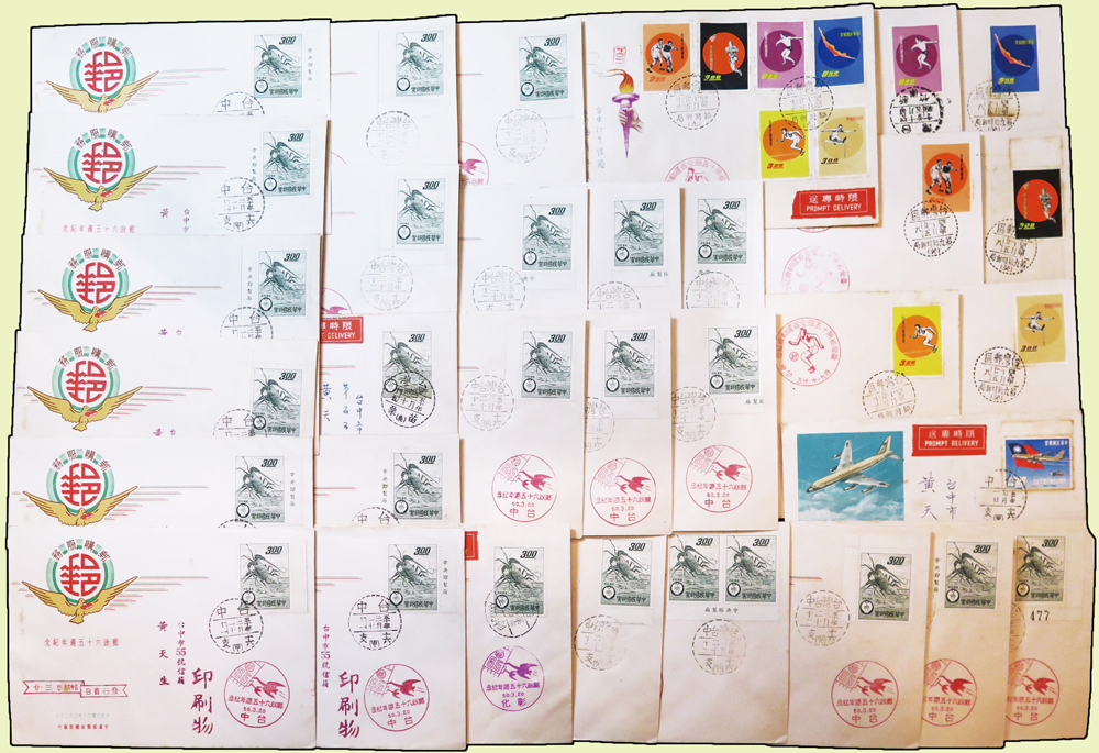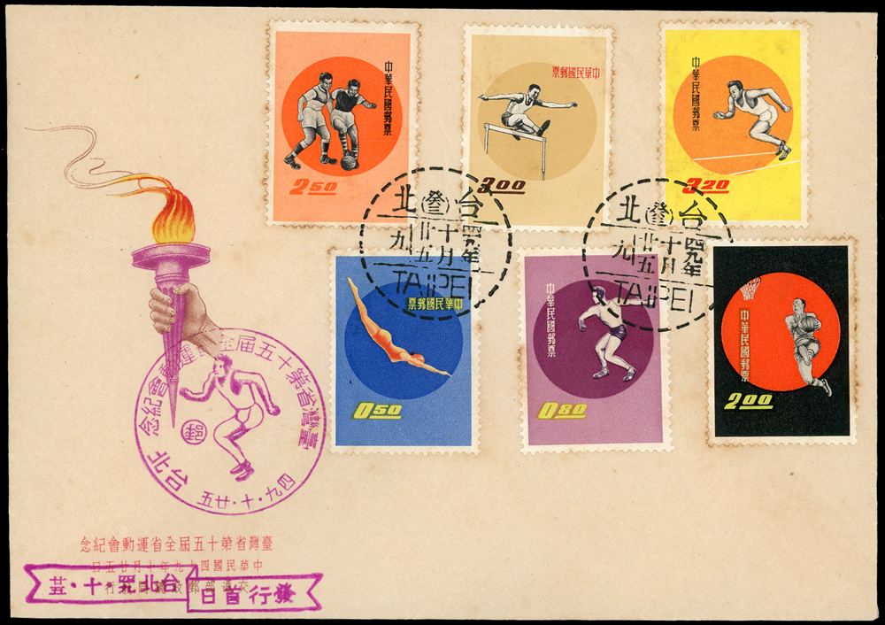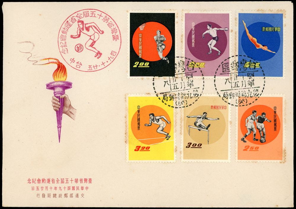 台灣早期套票首日局封42封(37套),包括:中華婦女反共抗俄聯合會十週年紀念5封,郵購服務24封,民用航空四十週年1封,體育(49年版)7套(其中1套6全分貼6封),封微斑點,VF-F(Page 123)
