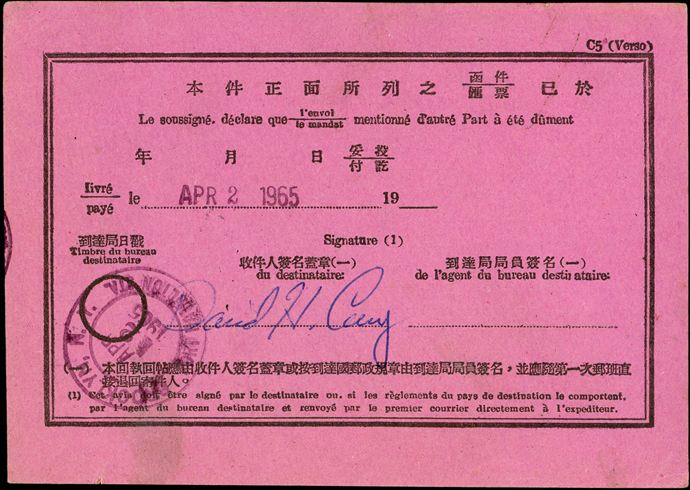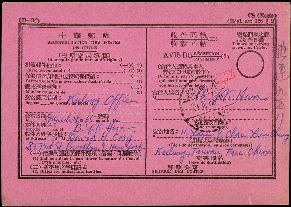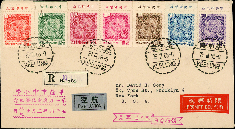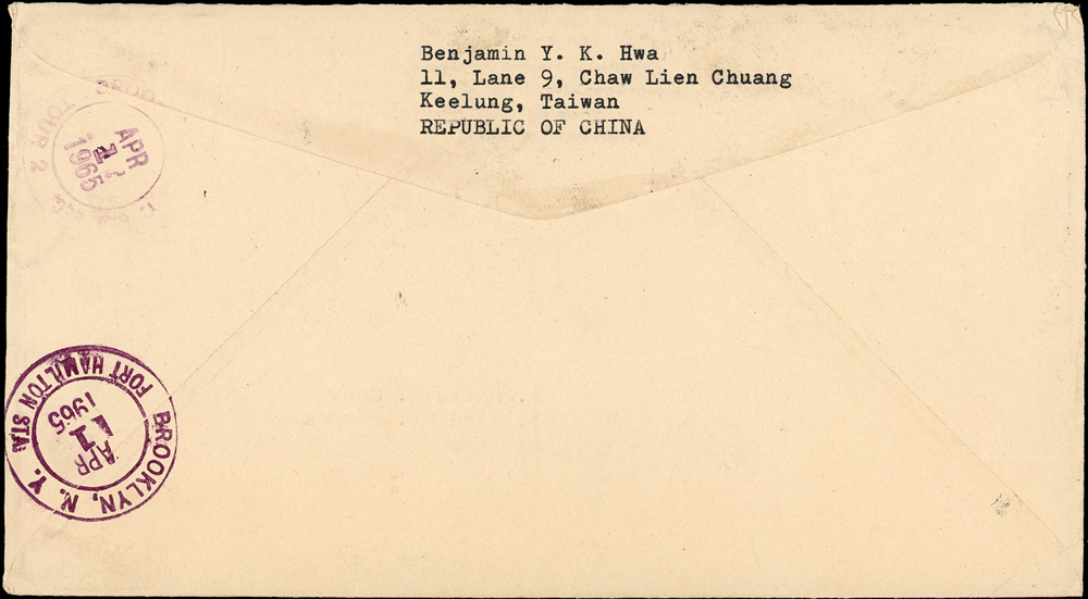 名人書信:常89.一版雙鯉圖原版首日套票封,貼原版7全帶上廠銘,銷基隆29.Ⅲ.65首日戳,航空掛號回執寄美國,背銷美國紐約APR.1.1965轉落戳2枚,另附中華郵政國際回執一件;寄件人華裕寬(Page 123)