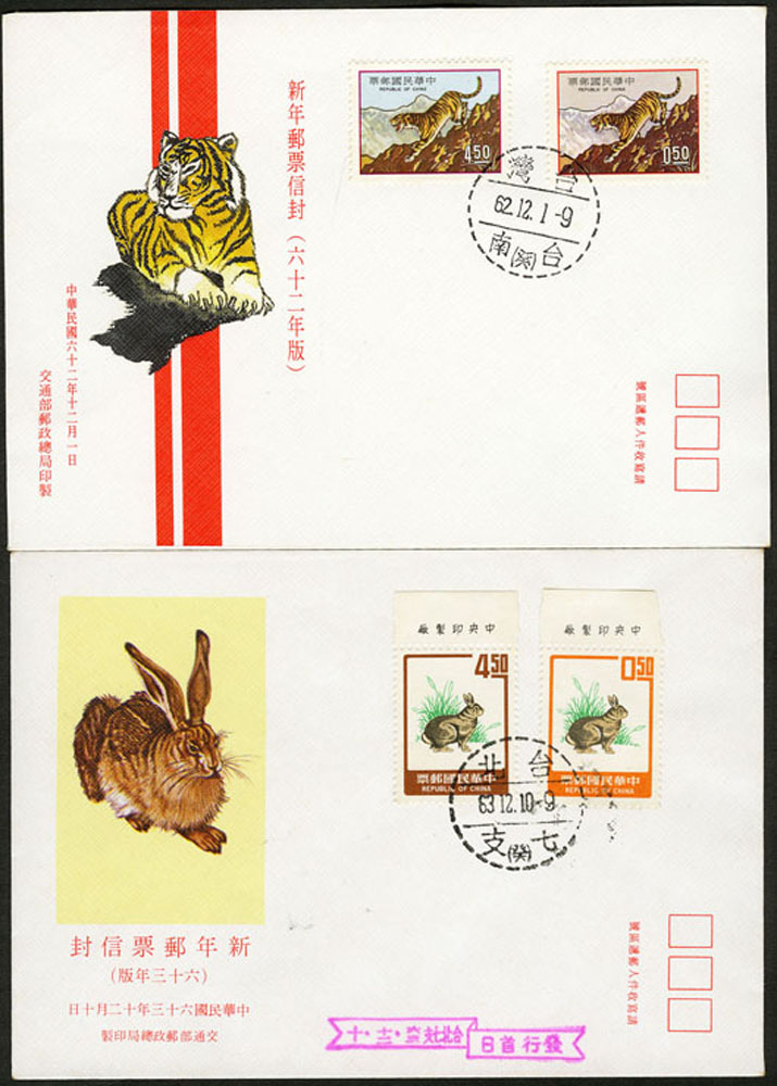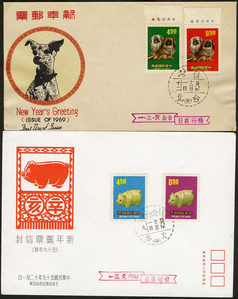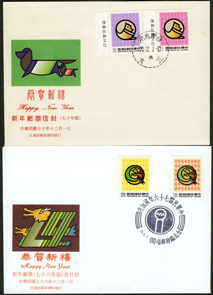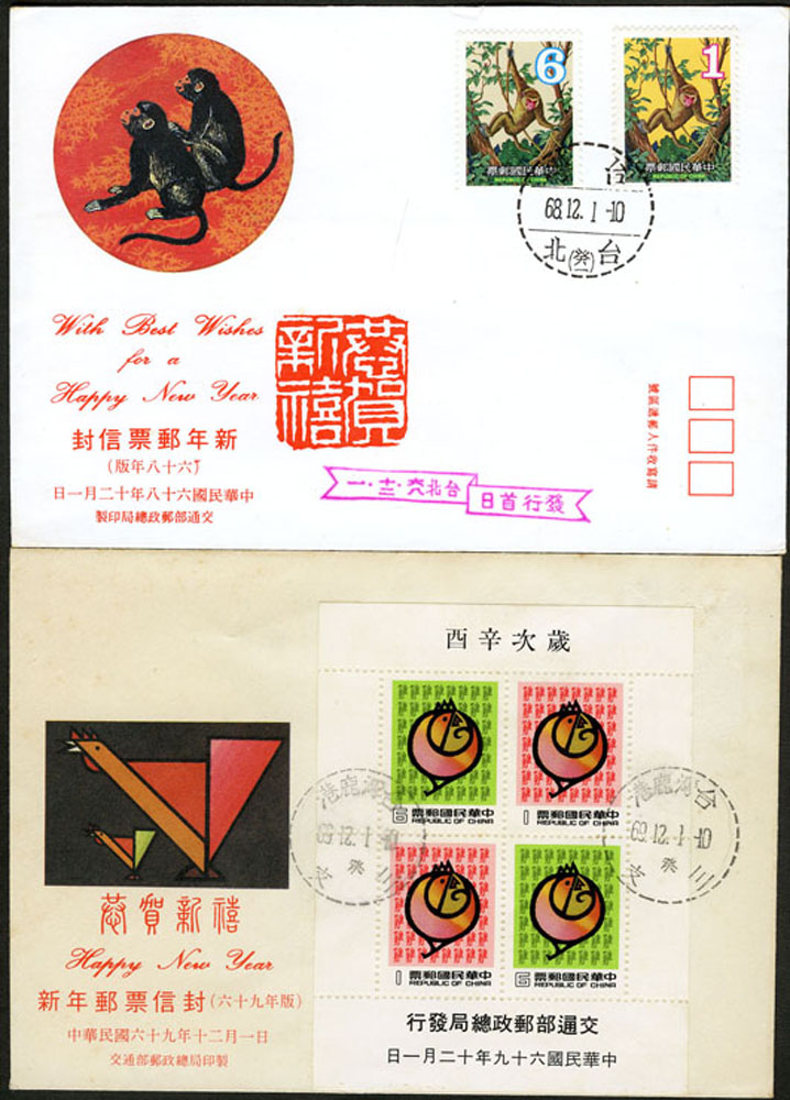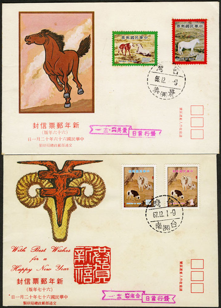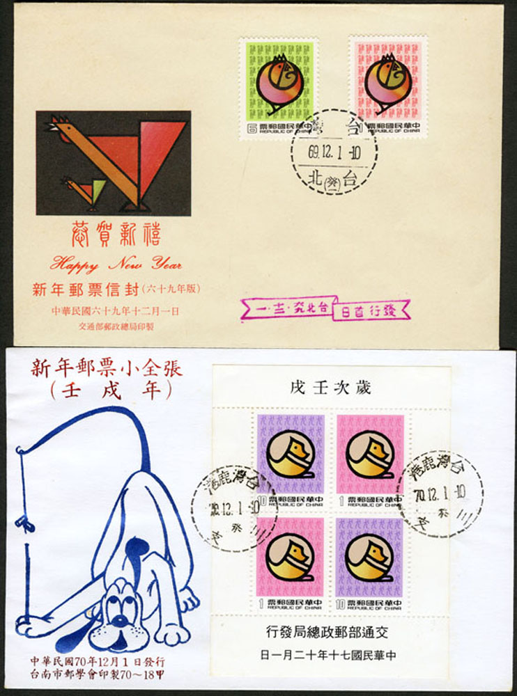 生肖首日封23封:(1)一輪生肖雞-猴小全張首日封12封全,其中狗為寶島封癸戳,蛇為局封實寄,其餘局封癸戳,部份封些微黃;(2)二輪生肖雞;狗;蛇;馬;羊套票.小全張首日癸封各一封,另有龍年套票銷臨局戳1封,共11封,其中狗年小全張為台南市郵學會封,部份封自然微黃(Page 123)