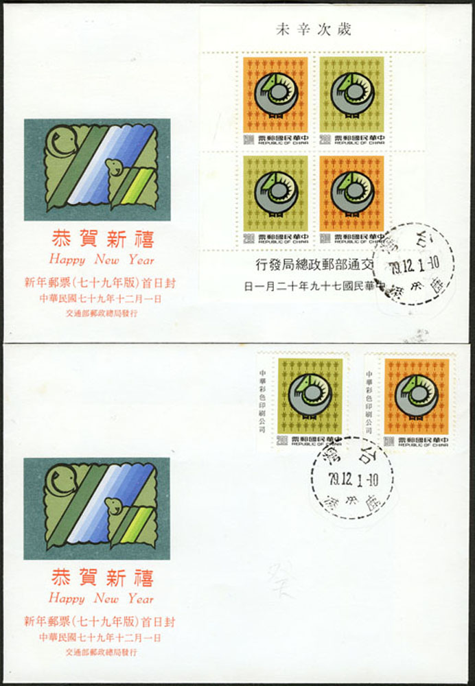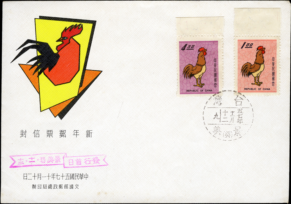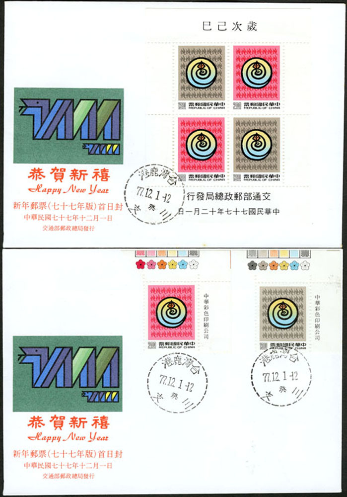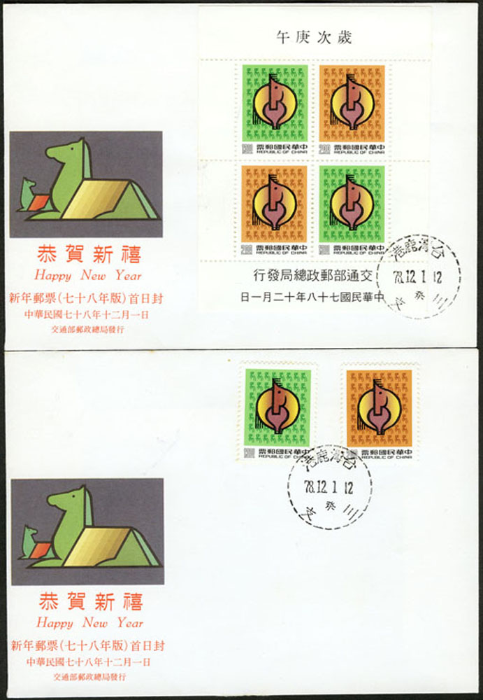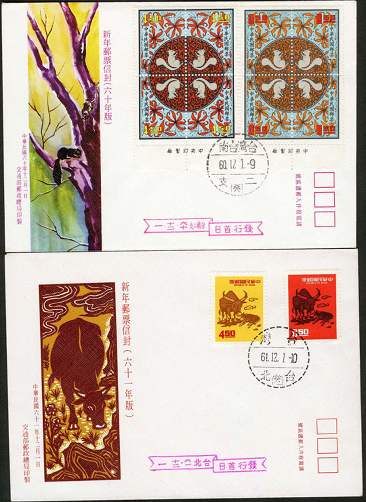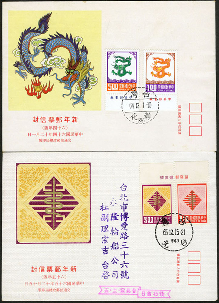 生肖首日封23封:(1)一輪生肖雞-猴小全張首日封12封全,其中狗為寶島封癸戳,蛇為局封實寄,其餘局封癸戳,部份封些微黃;(2)二輪生肖雞;狗;蛇;馬;羊套票.小全張首日癸封各一封,另有龍年套票銷臨局戳1封,共11封,其中狗年小全張為台南市郵學會封,部份封自然微黃(Page 123)