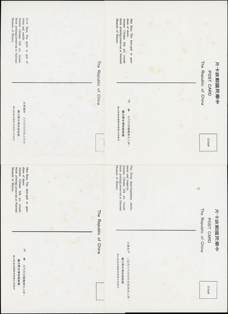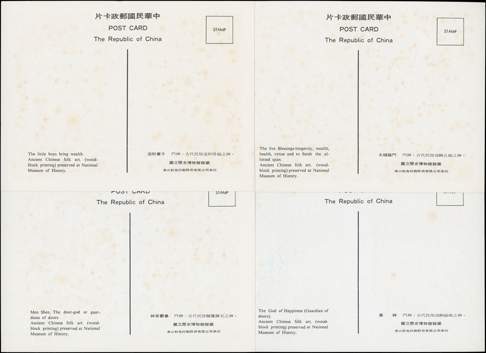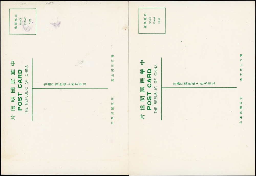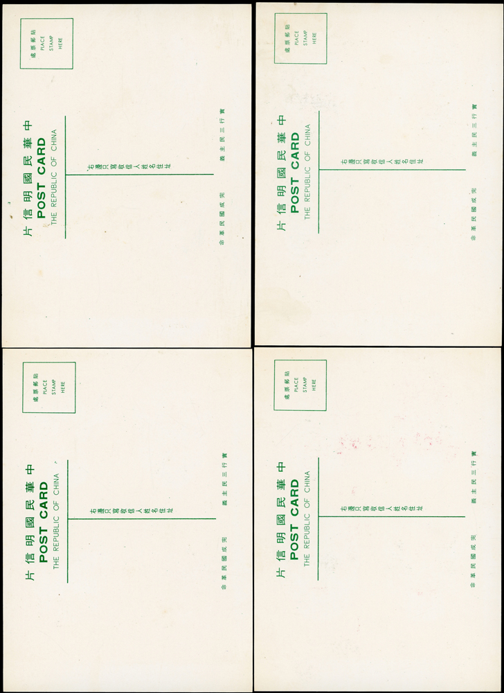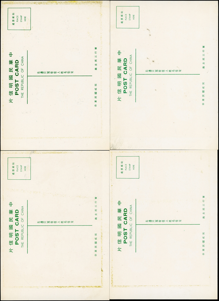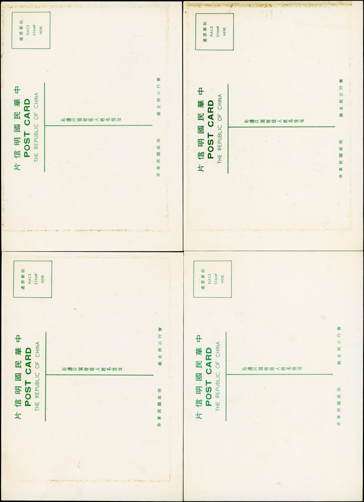 各式片:(1)中國國劇臉譜圖片明信片(第一輯)(第二輯)各10片全,新片,附封套,發行單位不詳;(2)國立歷史博物館發行民俗版畫郵政卡片10片全2套,新片,附封套;(3)民國47年3月《臺灣風景明信片》香港版-日月潭光華島.烏來水壩.碧潭鐵索橋各2片,共6片,格式面分貼臺灣風景(50年版)2元.3.2元.8角各1枚銷癸戳或代辦所戳;(4)雲南大理一塔寺風景明信片,格式面銷擁護中國國民黨/國父建黨革命紀戳;(5)北平輔大校景黑白片,背貼三莒5角銷新莊寄台北;(6)民主導師圖片明信片1片,格式面貼4角票銷首日癸戳;(7)國父像華北區改值4分郵資片,銷:國民大會紀念/35.11.15/青島紀念戳