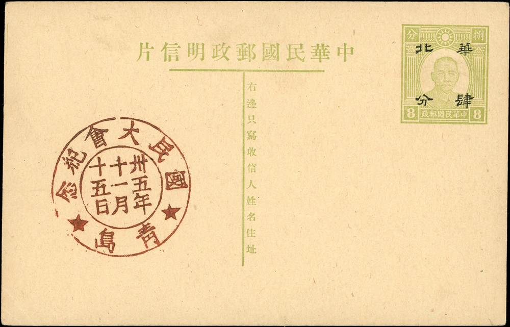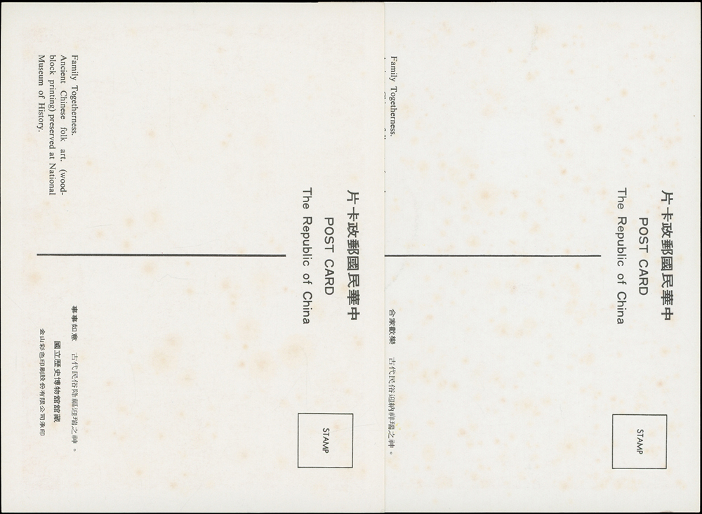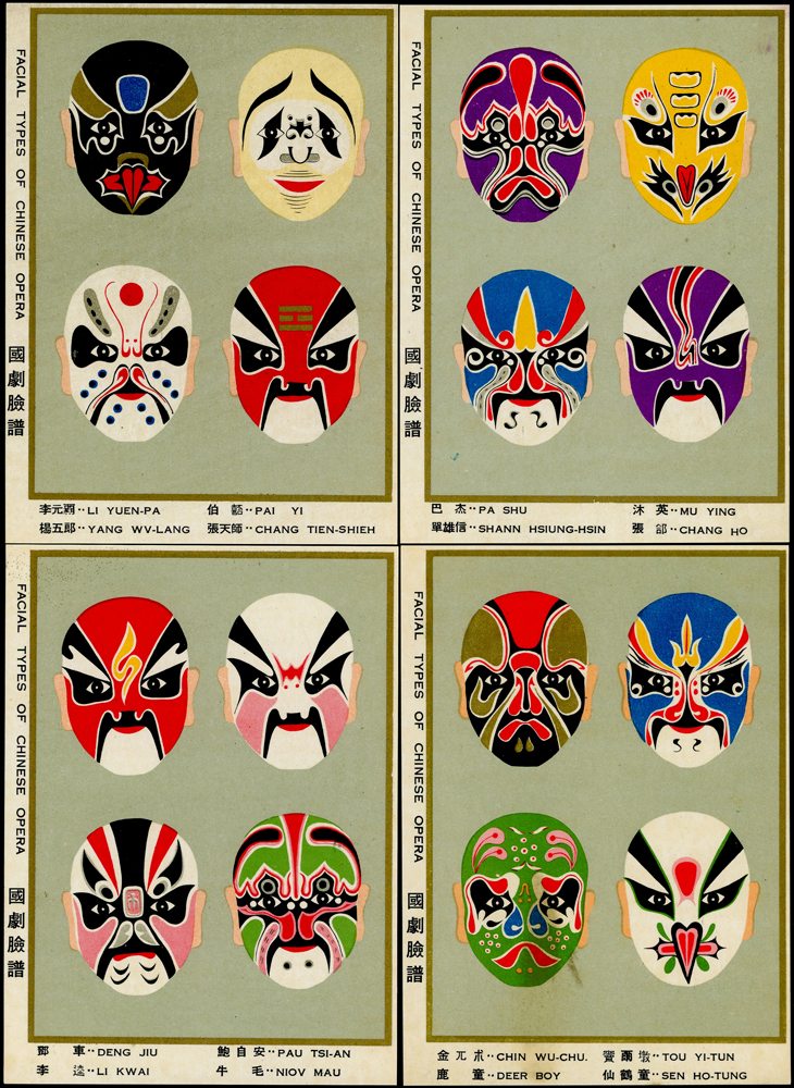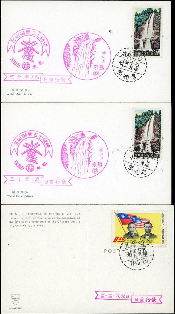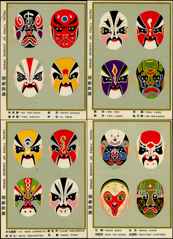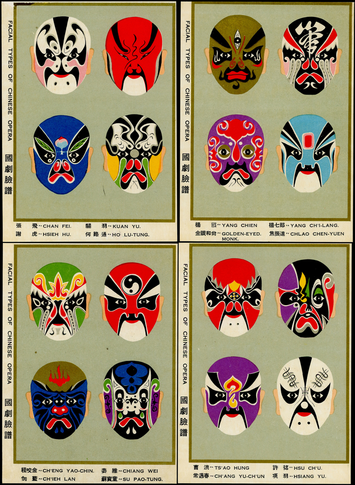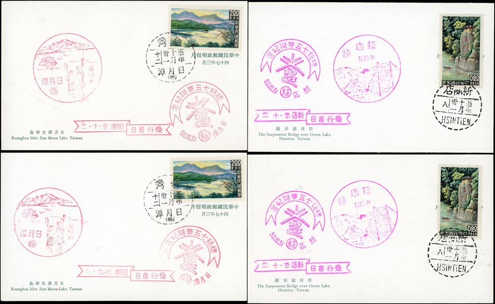 各式片:(1)中國國劇臉譜圖片明信片(第一輯)(第二輯)各10片全,新片,附封套,發行單位不詳;(2)國立歷史博物館發行民俗版畫郵政卡片10片全2套,新片,附封套;(3)民國47年3月《臺灣風景明信片》香港版-日月潭光華島.烏來水壩.碧潭鐵索橋各2片,共6片,格式面分貼臺灣風景(50年版)2元.3.2元.8角各1枚銷癸戳或代辦所戳;(4)雲南大理一塔寺風景明信片,格式面銷擁護中國國民黨/國父建黨革命紀戳;(5)北平輔大校景黑白片,背貼三莒5角銷新莊寄台北;(6)民主導師圖片明信片1片,格式面貼4角票銷首日癸戳;(7)國父像華北區改值4分郵資片,銷:國民大會紀念/35.11.15/青島紀念戳