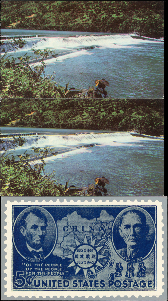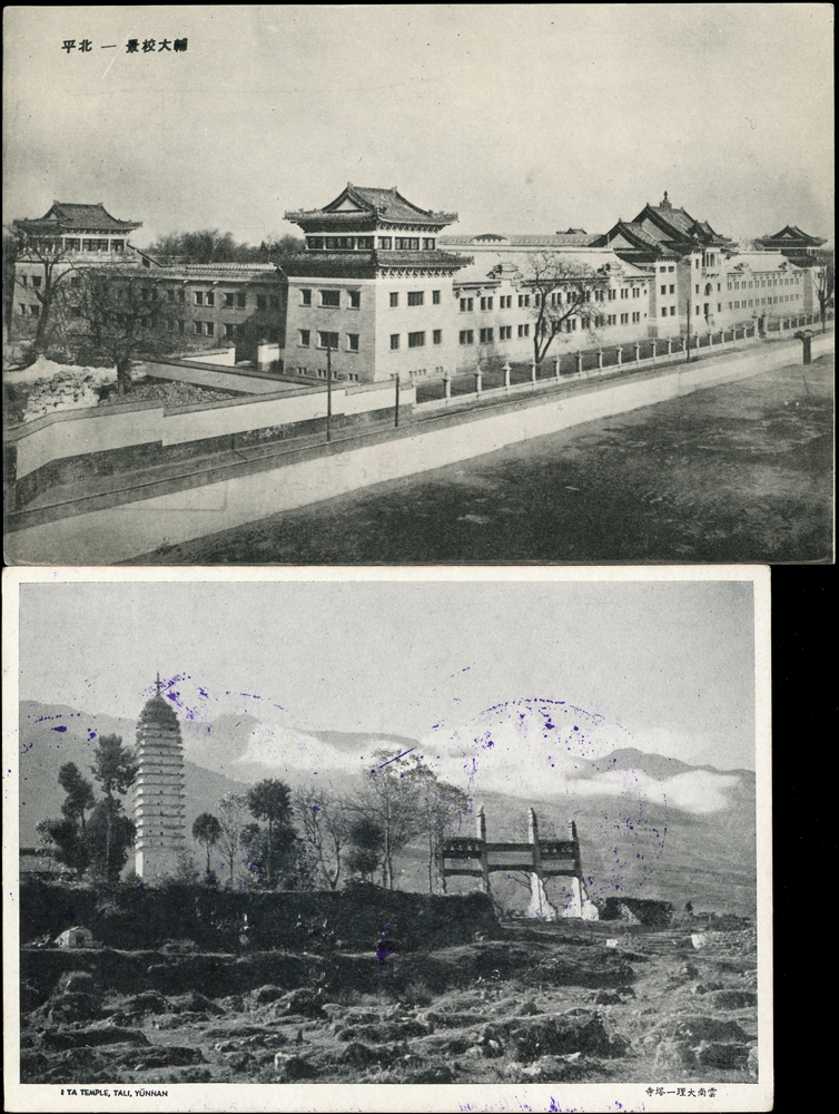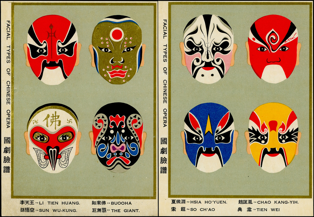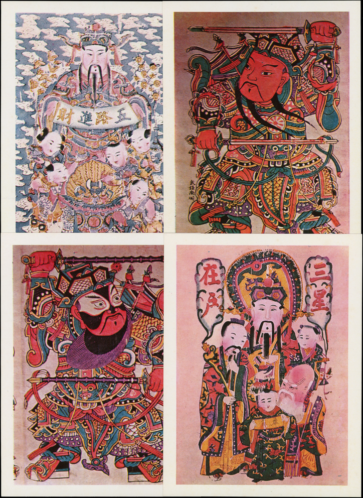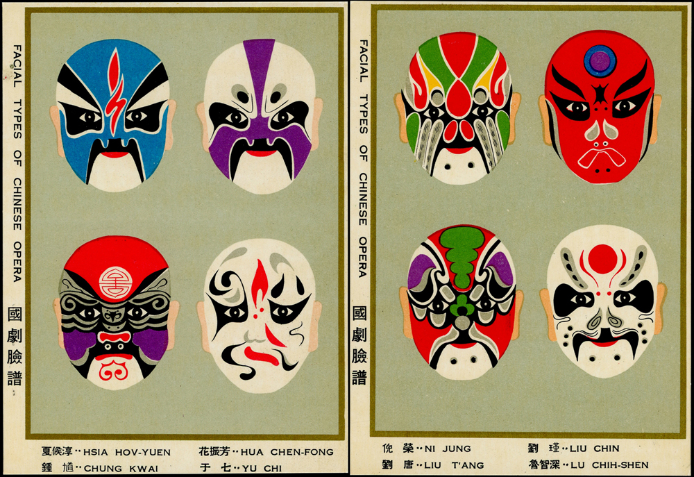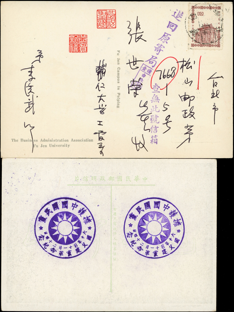 各式片:(1)中國國劇臉譜圖片明信片(第一輯)(第二輯)各10片全,新片,附封套,發行單位不詳;(2)國立歷史博物館發行民俗版畫郵政卡片10片全2套,新片,附封套;(3)民國47年3月《臺灣風景明信片》香港版-日月潭光華島.烏來水壩.碧潭鐵索橋各2片,共6片,格式面分貼臺灣風景(50年版)2元.3.2元.8角各1枚銷癸戳或代辦所戳;(4)雲南大理一塔寺風景明信片,格式面銷擁護中國國民黨/國父建黨革命紀戳;(5)北平輔大校景黑白片,背貼三莒5角銷新莊寄台北;(6)民主導師圖片明信片1片,格式面貼4角票銷首日癸戳;(7)國父像華北區改值4分郵資片,銷:國民大會紀念/35.11.15/青島紀念戳