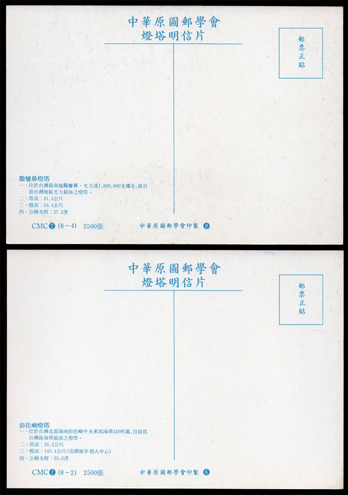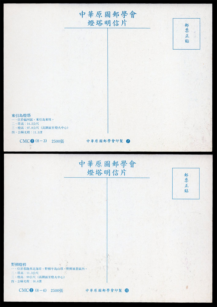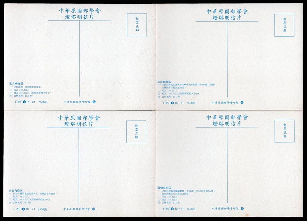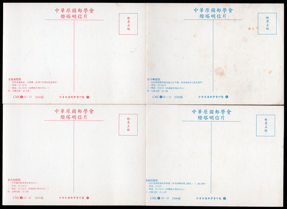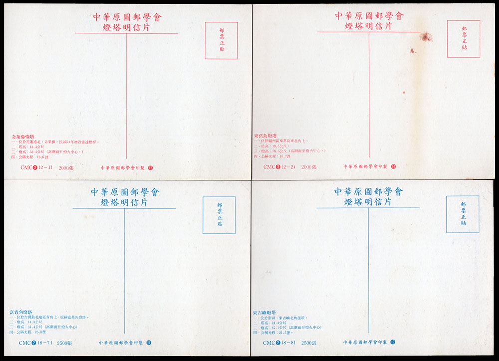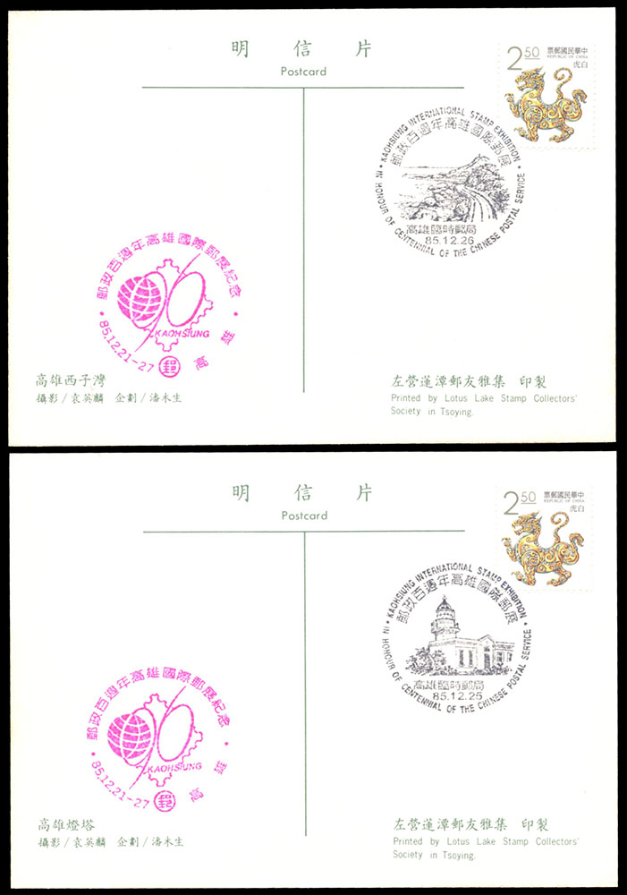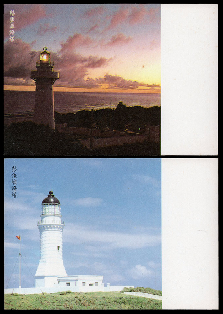 彩色私片66片:(1)燈塔原圖片一組共20片,新,中華原圖郵學會印製;(2)高雄彩色風景片一組共9片,其中2片實寄,其餘蓋銷85.12.27郵政百週年高雄郵展臨局戳;左營蓮潭郵友雅集印製;(3)1997年鹿港天后宮彩色私片一組共13片,其中七片貼票銷戳或實寄,其餘新片;(4)台灣稀有動物彩色片一組共24片,新,農委會監製