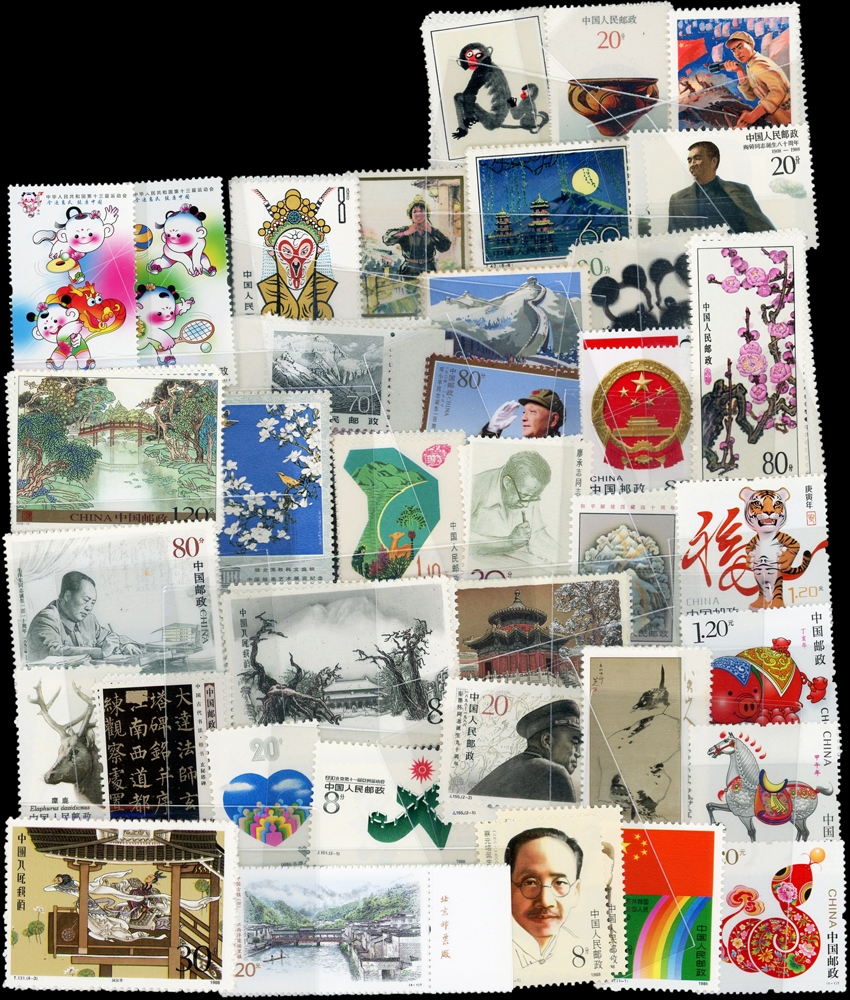 新中國R.S.C.J.T.編號.編年票一組,均為新票,共81套,重點內容有:R21.C4N.C21.C76.S35.S39.S75.T28.T34.T38.T42.T45.T77.T86.T103.T126.T130.T131.T132.T149.J20.J60.J155.2004-1~2015-1(生肖).N63-65等,品像混合,多數保存佳,VF-F;歡迎至官網瀏覽全貌