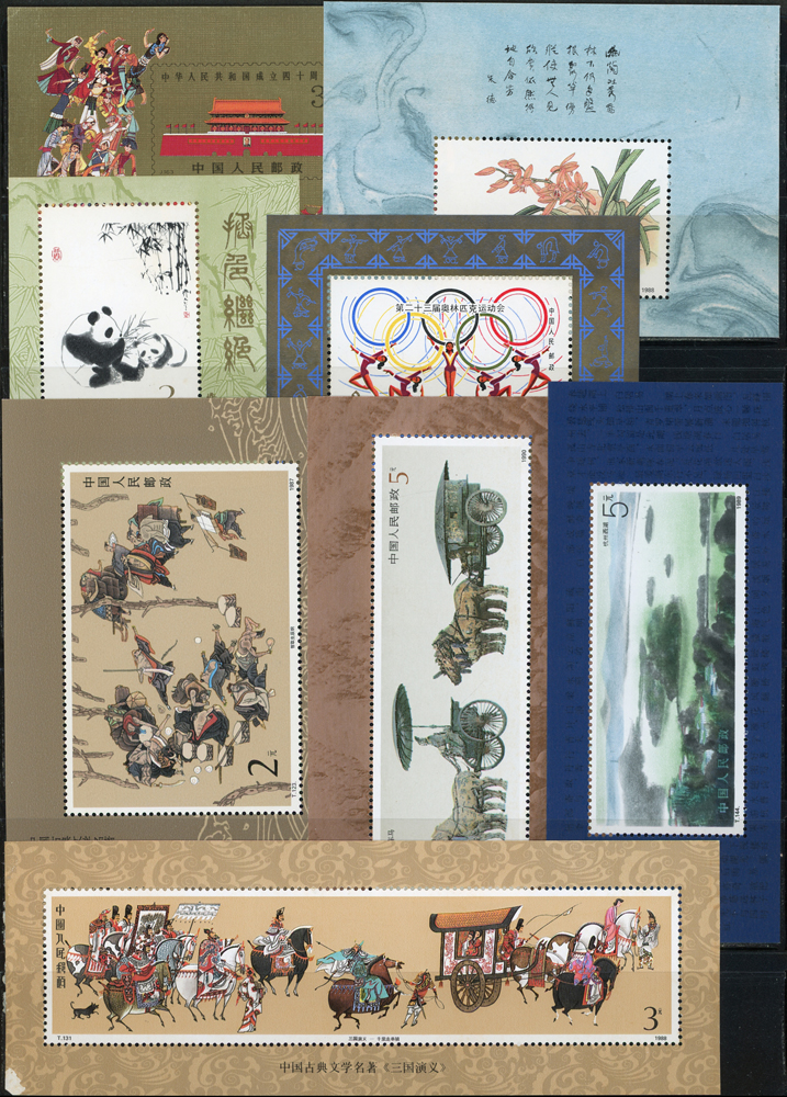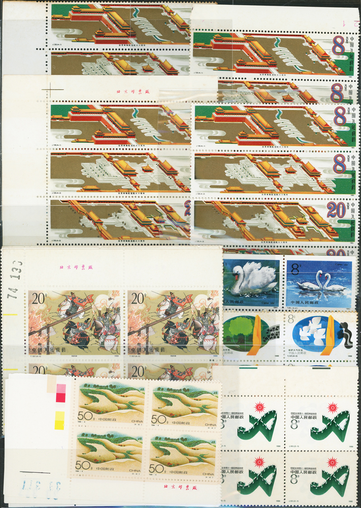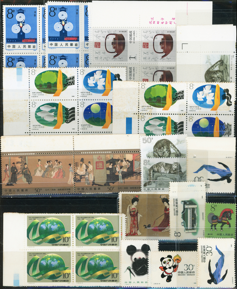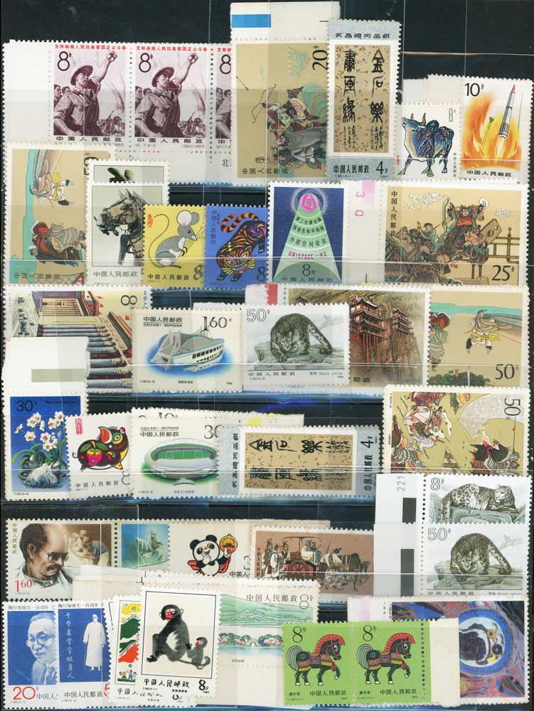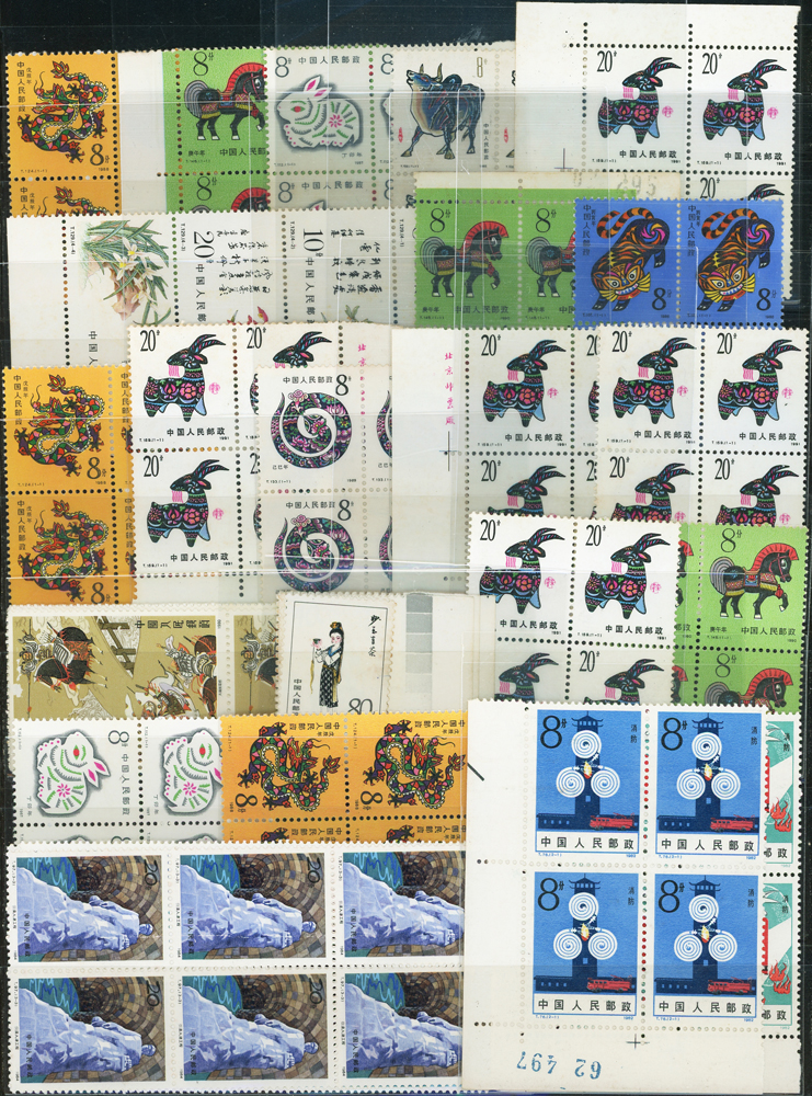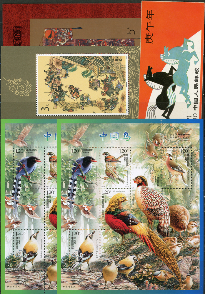 新中國中近期新票一組,包括:(1)小全張19枚,含:J133m六枚,J162m二枚,T135m.T131m(左側邊損).T123m.T151m.T167m(中折).T129m.T144m.T106m.J103m.J163m.J172R各1枚;(2)版張:2003-4百合花1版,2003-2楊柳青木版年畫1版,T158韓熙載夜宴圖1版(齒折),2004-24祖國邊陲風光小版10版,2005-12安徒生童話1版,2008-4中國鳥2版;(3)郵票156套,重點內容有:C117.T69.T76.T86.T97.T98.T102.T112.T124.T127.T144.T146.T150.T153.T157.T159.T163.J120.J94.J151.J163.J172.1994-4.1994-5等,多重複;(4)庚午馬年小冊1本,青藏鐵路全線通車郵摺1本,1997-10m首日封及舊票各1件,紀念封12封,未使用郵資封1封,紀念張5枚,不成套舊票20枚.新票3枚;以上品像混合,部分票齒緣淡黃或淡斑,VF-F,歡迎至官網瀏覽全貌