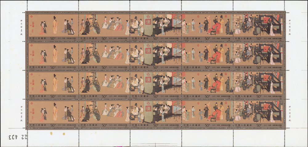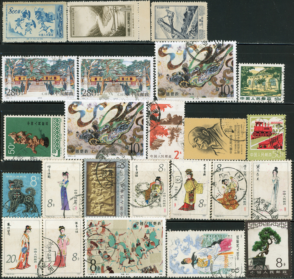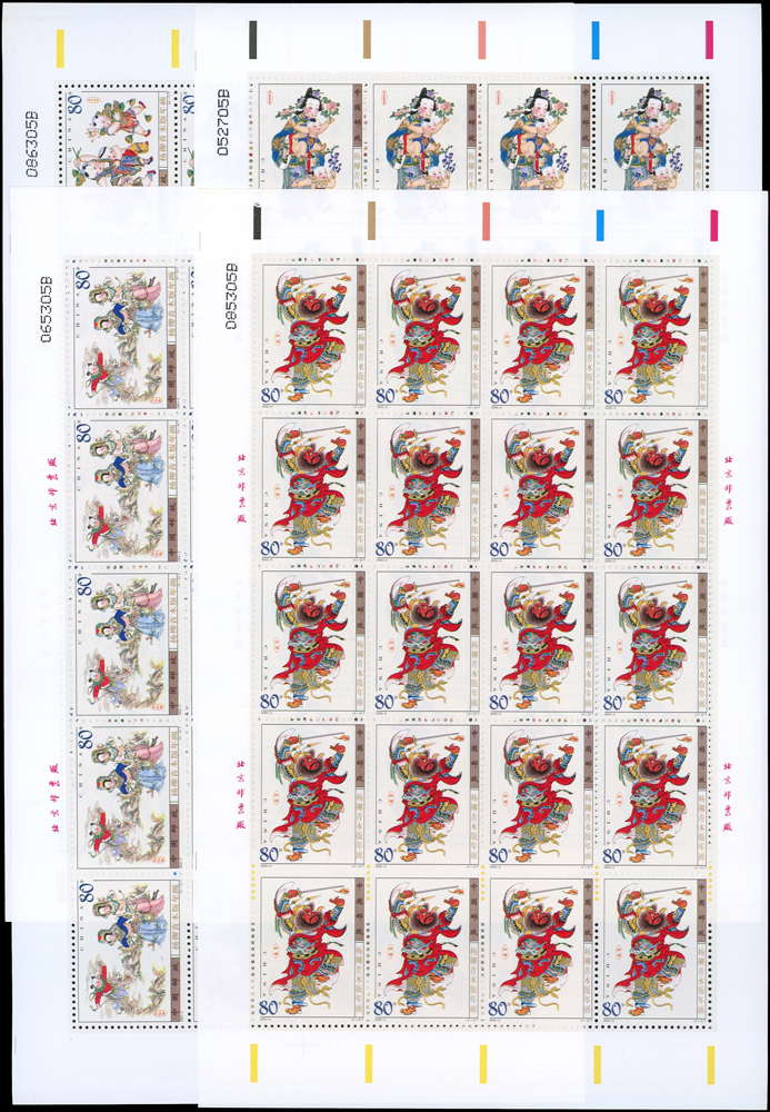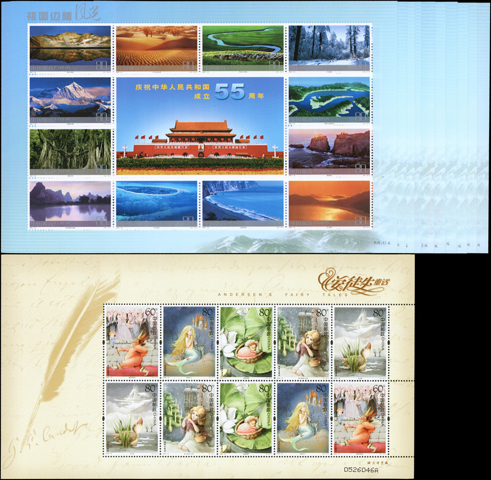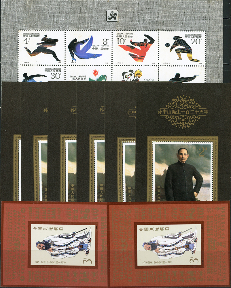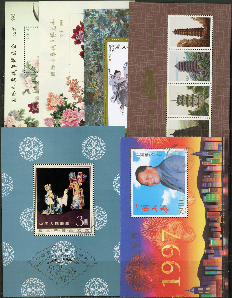 新中國中近期新票一組,包括:(1)小全張19枚,含:J133m六枚,J162m二枚,T135m.T131m(左側邊損).T123m.T151m.T167m(中折).T129m.T144m.T106m.J103m.J163m.J172R各1枚;(2)版張:2003-4百合花1版,2003-2楊柳青木版年畫1版,T158韓熙載夜宴圖1版(齒折),2004-24祖國邊陲風光小版10版,2005-12安徒生童話1版,2008-4中國鳥2版;(3)郵票156套,重點內容有:C117.T69.T76.T86.T97.T98.T102.T112.T124.T127.T144.T146.T150.T153.T157.T159.T163.J120.J94.J151.J163.J172.1994-4.1994-5等,多重複;(4)庚午馬年小冊1本,青藏鐵路全線通車郵摺1本,1997-10m首日封及舊票各1件,紀念封12封,未使用郵資封1封,紀念張5枚,不成套舊票20枚.新票3枚;以上品像混合,部分票齒緣淡黃或淡斑,VF-F,歡迎至官網瀏覽全貌