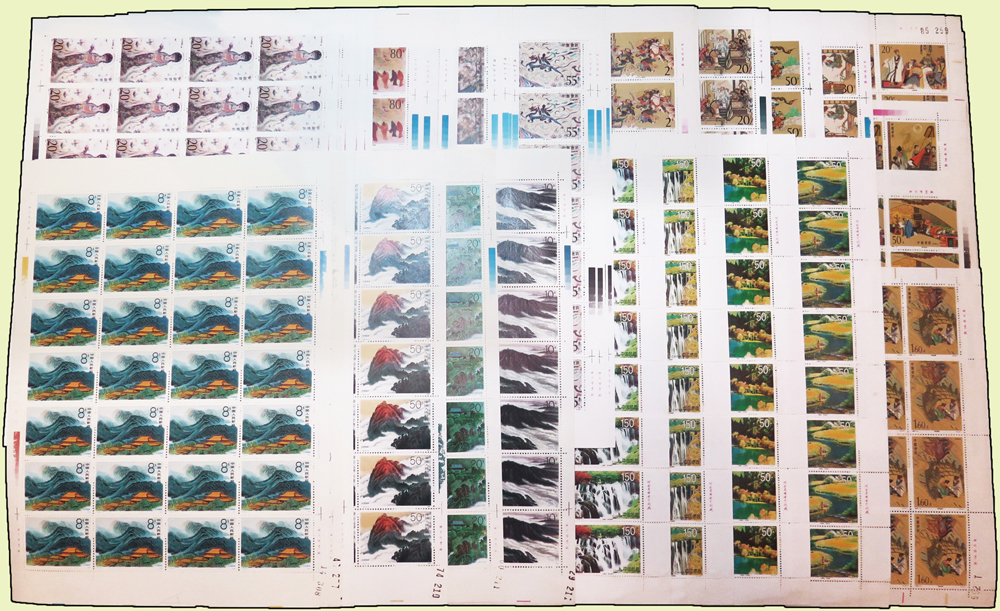 新中國新票版張版,均原膠,包括:(1)T155.衡山4全2版,共56套,左上角皺痕,VF-F;(2)1992-11.敦煌壁畫(四)4全4版,共112套,VF;(3)1998-6.九寨溝4全1版32套,右下邊水漬痕,VF-F;(4)1993-10.水滸傳(四)4全2版,共56套,其中(4-4)1版右下角原紙斜摺痕損票3枚,無黃斑,VF-F;(5)1992-9.三國演義(三)4全2版,共40套,其中1版背黃斑,另1版VF