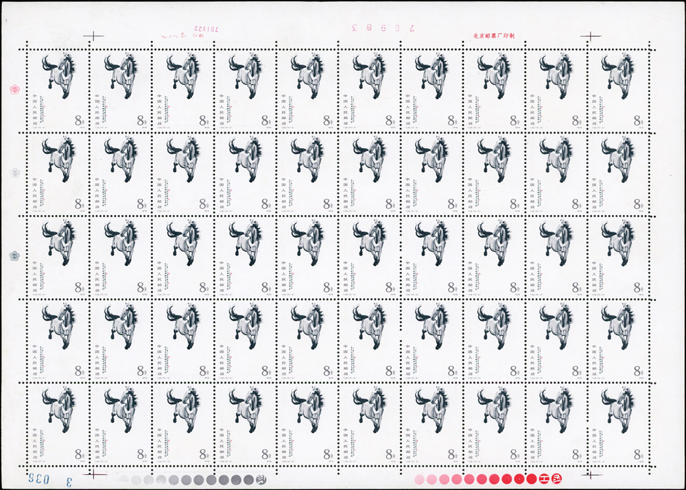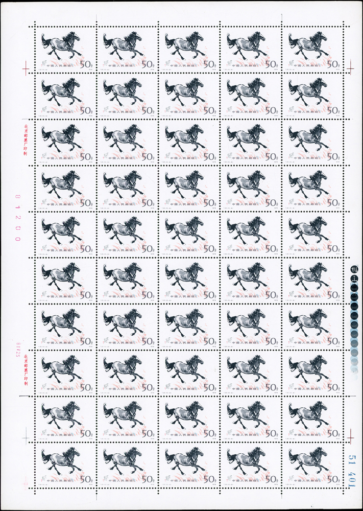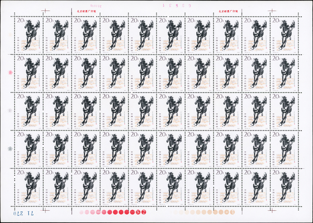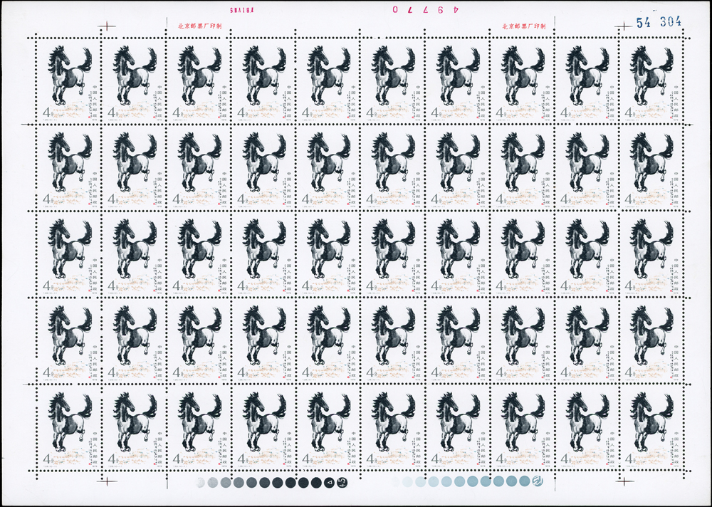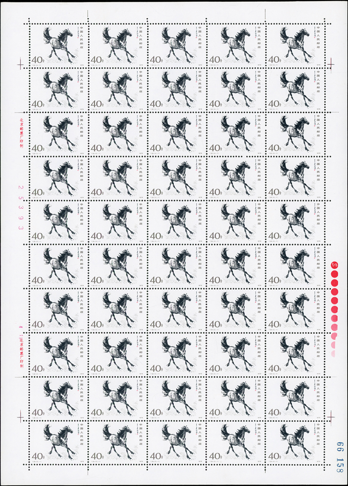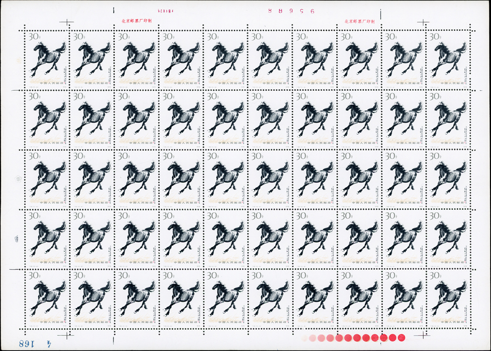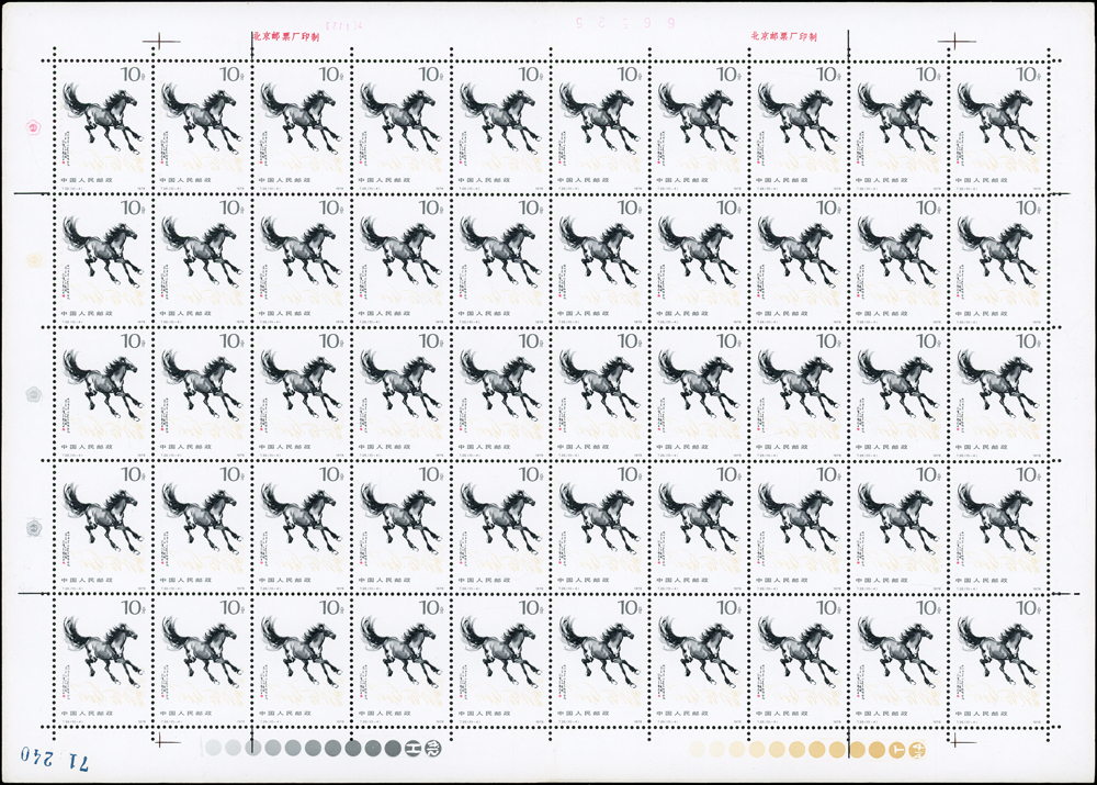 T28.奔馬圖新票10全一全張50套,原膠,(10-4)折版,其餘挺版,其中(10-1)(10-3)(10-5)(10-10)背面局部淡黃,VF-F(Page 132)