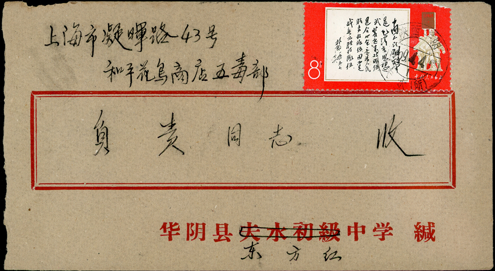 實寄封二封:(1)1952年山東寄北京軍郵免資封,銷中國軍郵1952.2.26戳,背有北京到達戳;(2)1969年陝西寄上海封,貼文11林彪題詞8分1枚銷陝西華陽1969.4.4戳,背銷上海1969.4.7到戳;林茂興舊藏(Page 137)